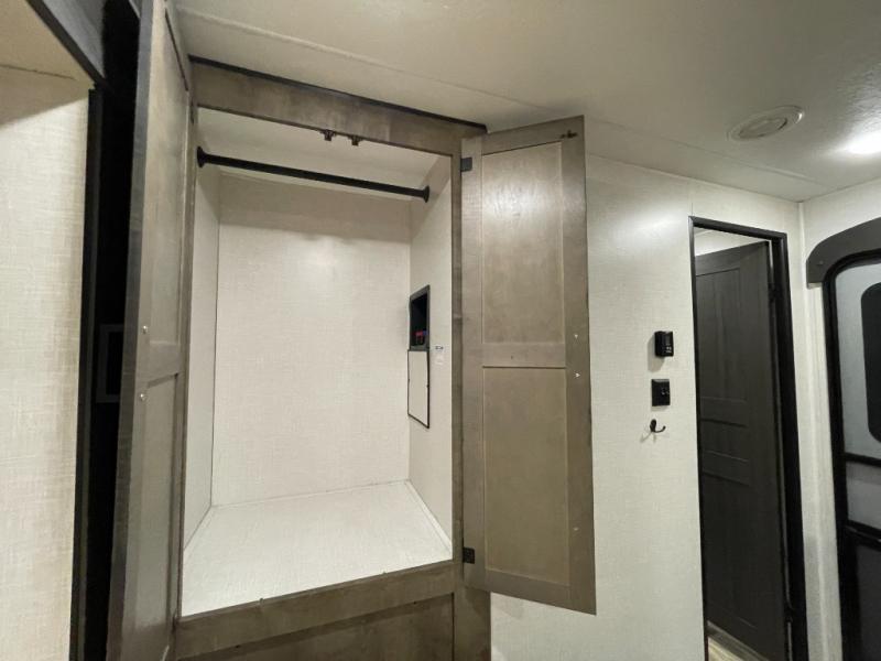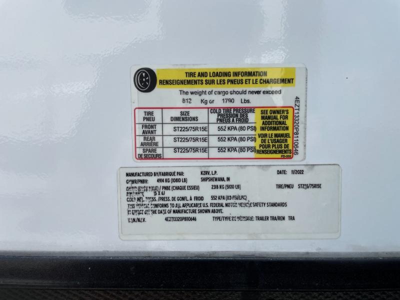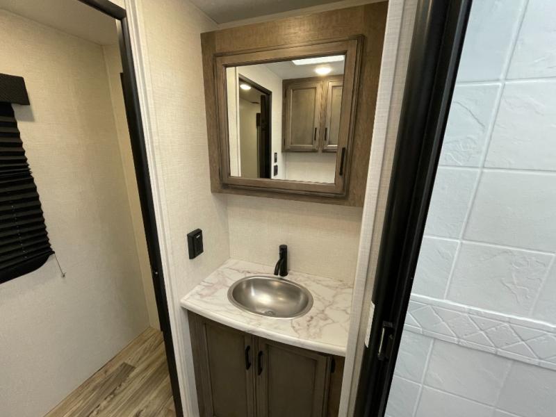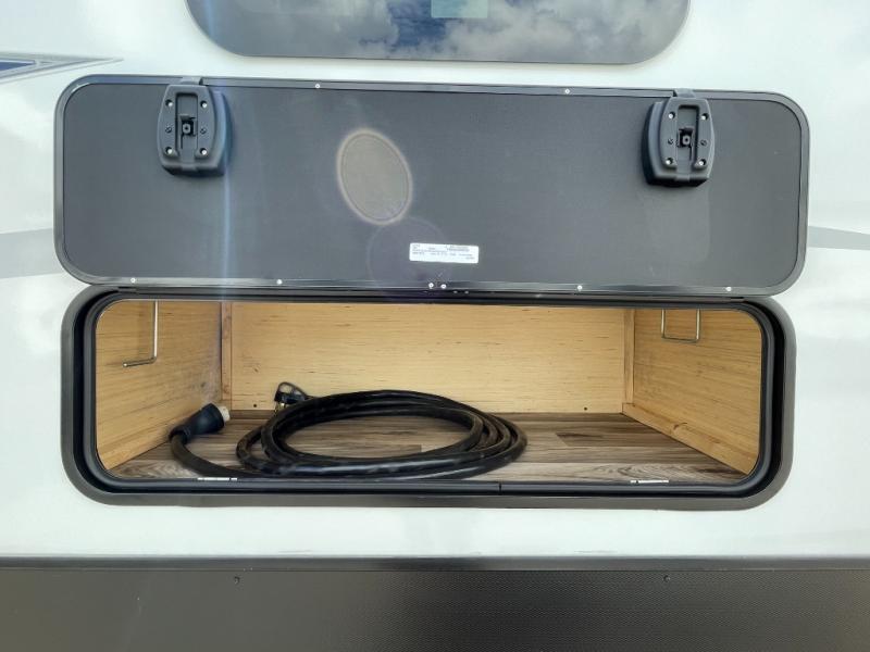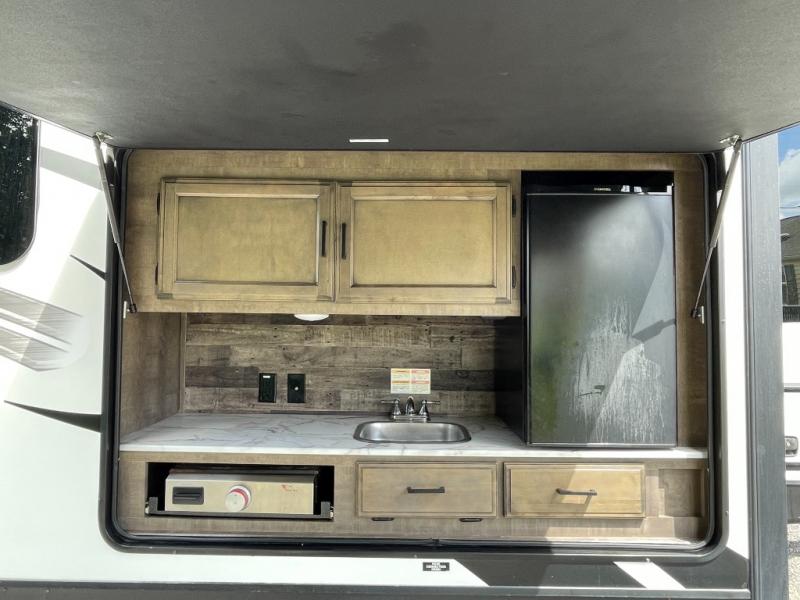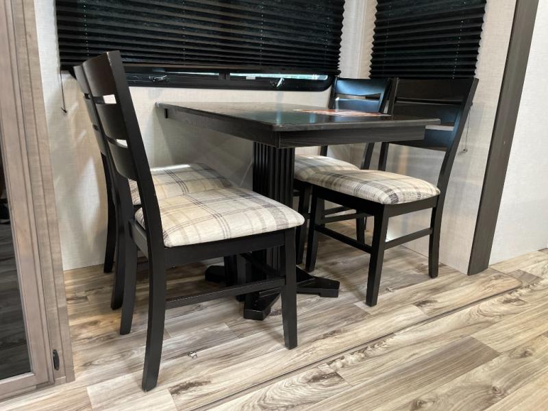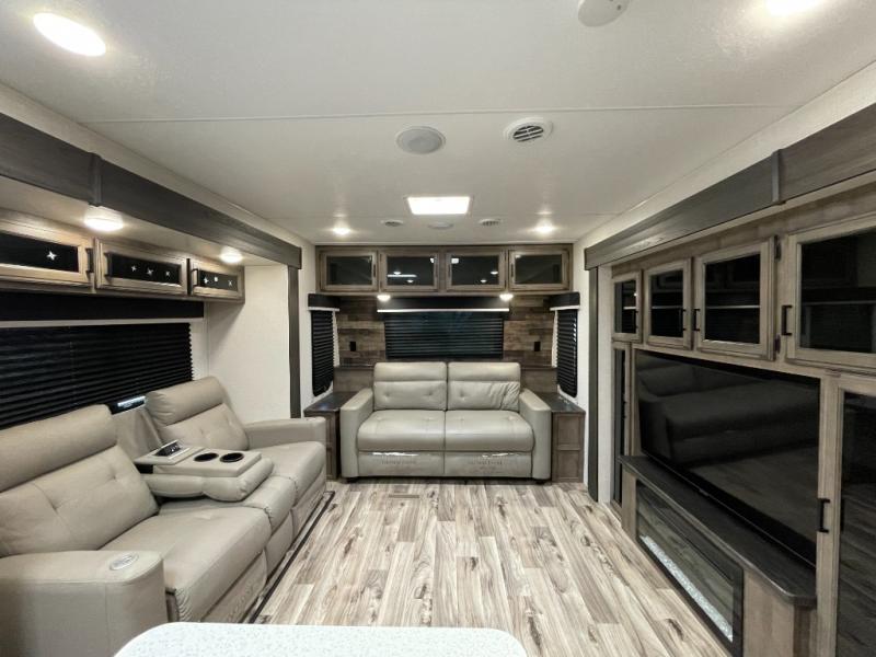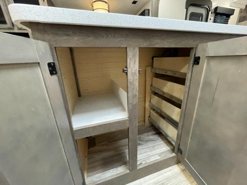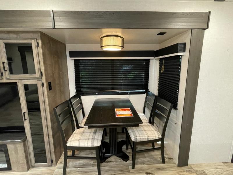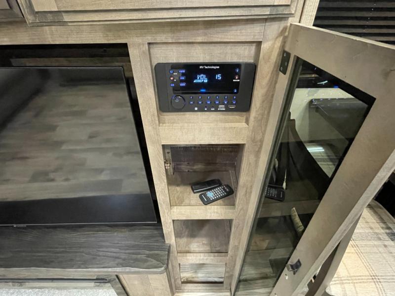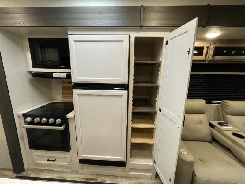 Come see why this travel trailer was awarded the "2022 Top RV Debut" by RV Business! Relax in true comfort in the front living area with a 70" tri-fold sofa with end tables on either side or in the theater seating across from the entertainment center with a TV and 30" frameless fireplace. The kitchen island will make your meal prepping easier and you can enjoy them at the table and chairs then play a card game or two. You could even cook your meals at the exterior campfire café with a refrigerator, a sink with countertop space, and a griddle. The full bathroom has a 30" x 36" shower for you to freshen up in each morning. Enjoy a good night's rest each night on the 70" x 80" sleep tight king bed slide across from a dresser with a 30" frameless fireplace in the rear private bedroom, plus there is a wardrobe with washer and dryer prep and one of the dual entry doors with triple pull-out aluminum steps!