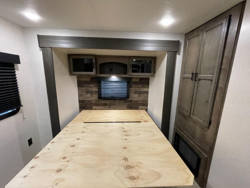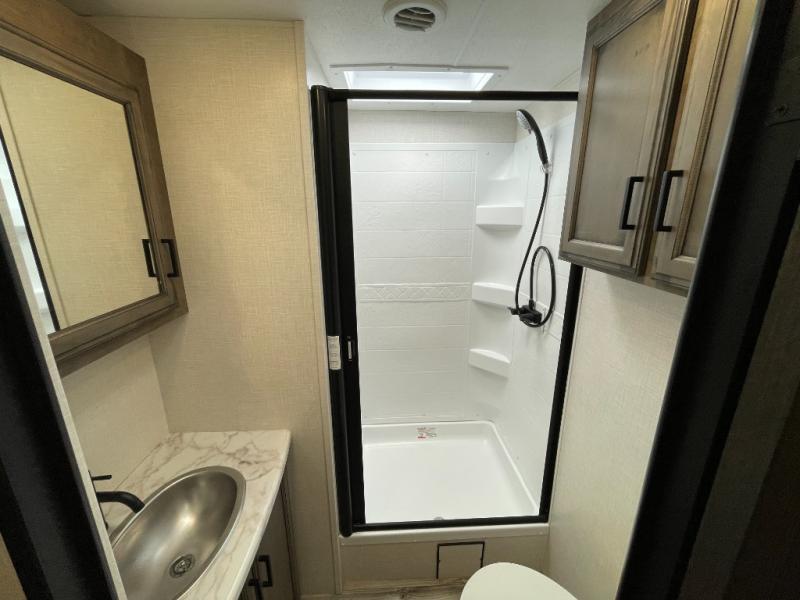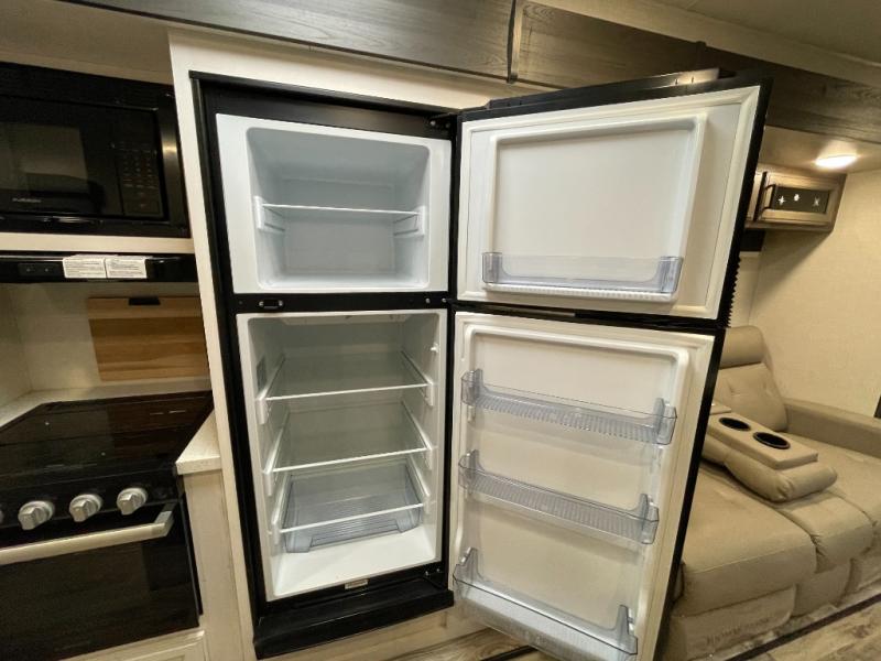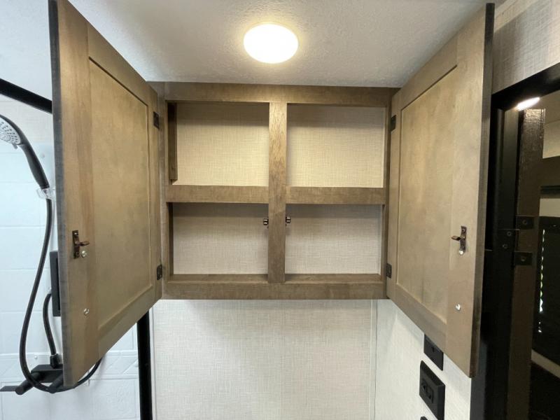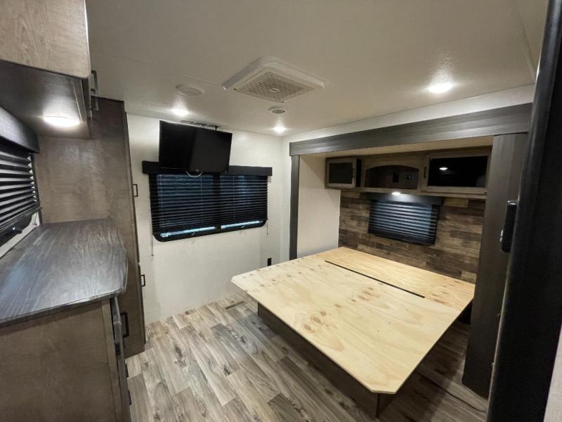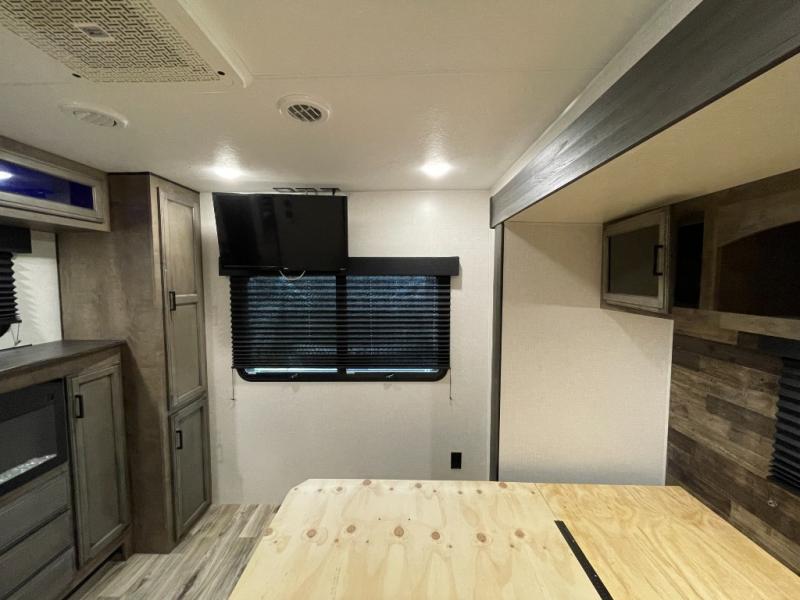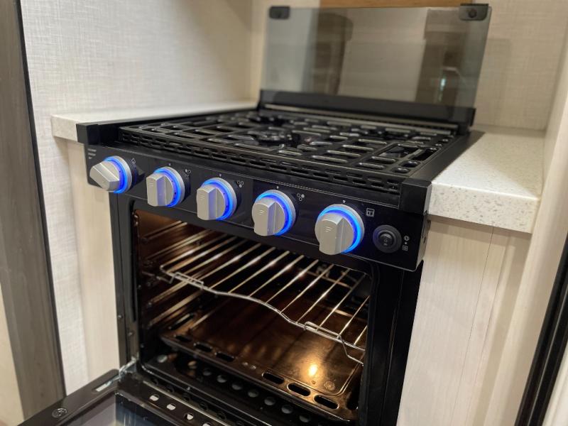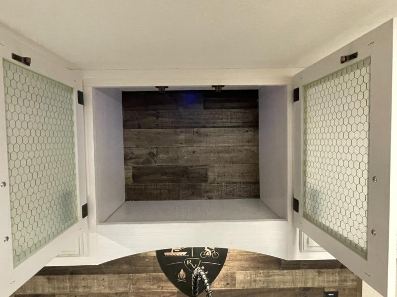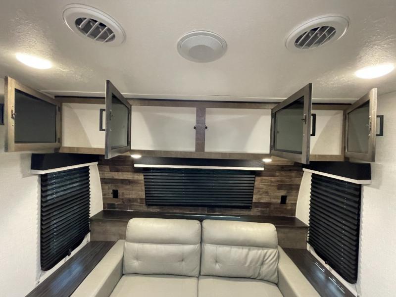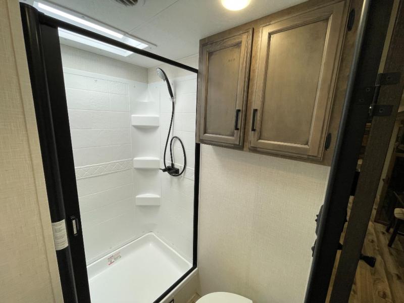 Come see why this travel trailer was awarded the "2022 Top RV Debut" by RV Business! Relax in true comfort in the front living area with a 70" tri-fold sofa with end tables on either side or in the theater seating across from the entertainment center with a TV and 30" frameless fireplace. The kitchen island will make your meal prepping easier and you can enjoy them at the table and chairs then play a card game or two. You could even cook your meals at the exterior campfire café with a refrigerator, a sink with countertop space, and a griddle. The full bathroom has a 30" x 36" shower for you to freshen up in each morning. Enjoy a good night's rest each night on the 70" x 80" sleep tight king bed slide across from a dresser with a 30" frameless fireplace in the rear private bedroom, plus there is a wardrobe with washer and dryer prep and one of the dual entry doors with triple pull-out aluminum steps!