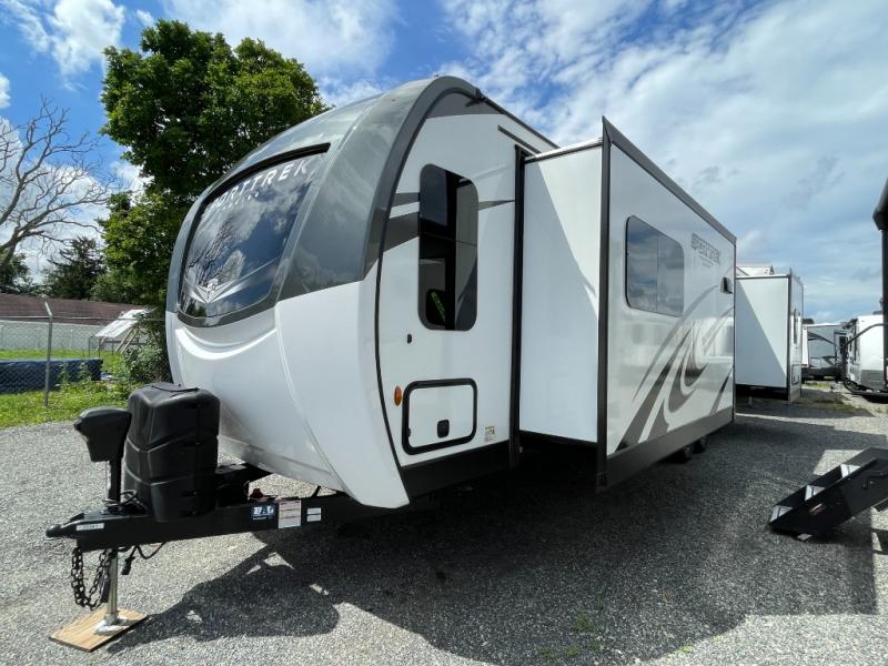 An elegant design and new features come with every one of these Venture RV SportTrek Touring Edition travel trailers! The NXG Huck bolt frame holds these units together and a walkable roof covers them. Heads will turn down the highway and at the campsite with an upgraded graphics package and a painted fiberglass front cap with integrated LED light. The exterior pass-through storage area has slam latch baggage doors with magnetic catches so you don't have to worry about them closing on you and a motion activated light to see your items clearly even at night. Luxury abounds throughout these units, especially with the mandatory Interior Luxury package which comes with solid surface kitchen countertops, designer valances with fabric nightshades, two 30" frameless fireplaces, and Beauflor wood plank flooring that is easy to clean. Come find your favorite model today!