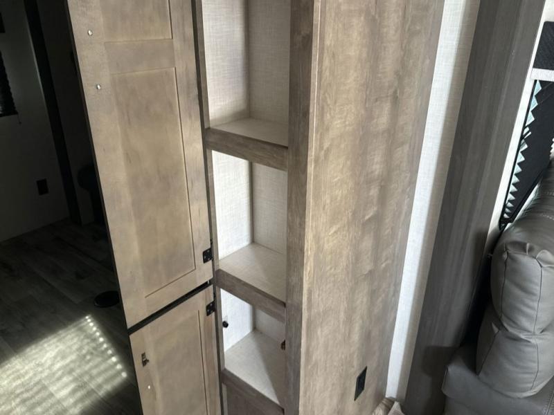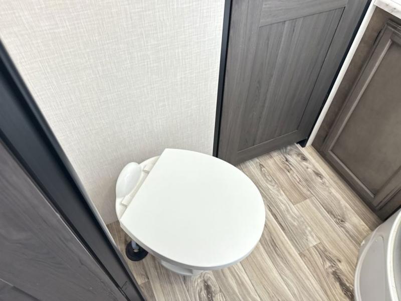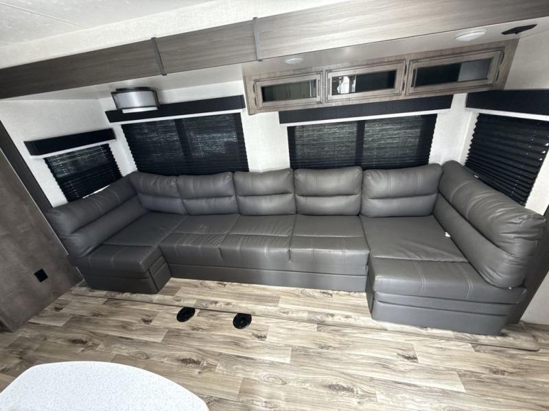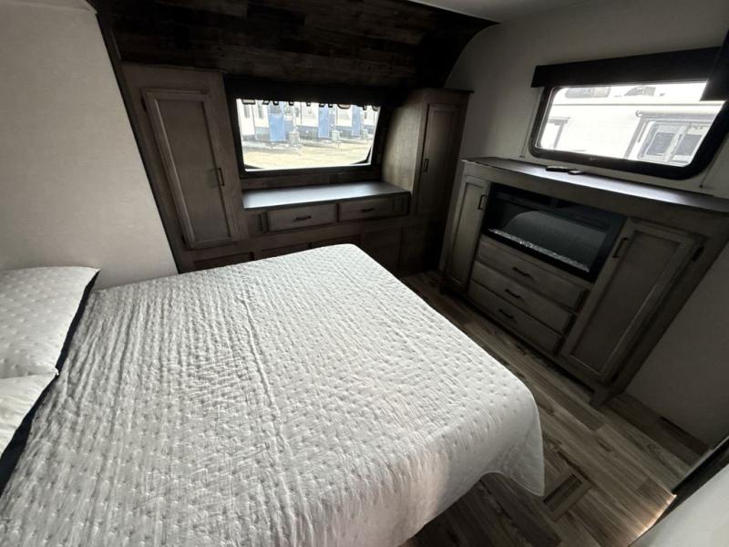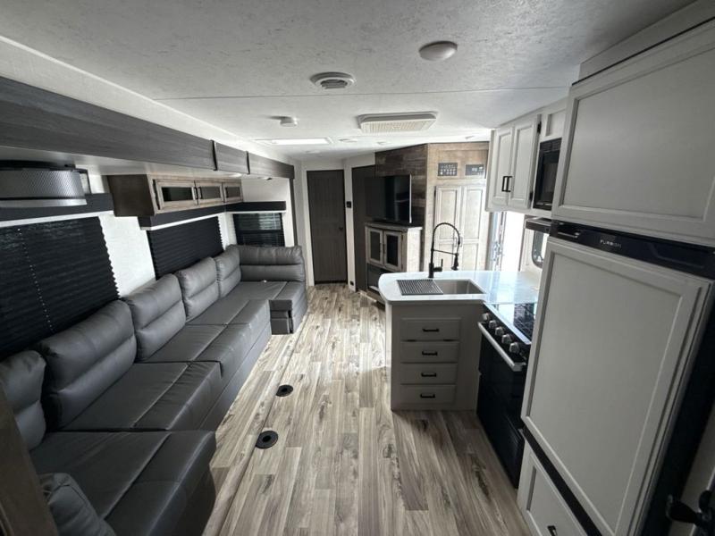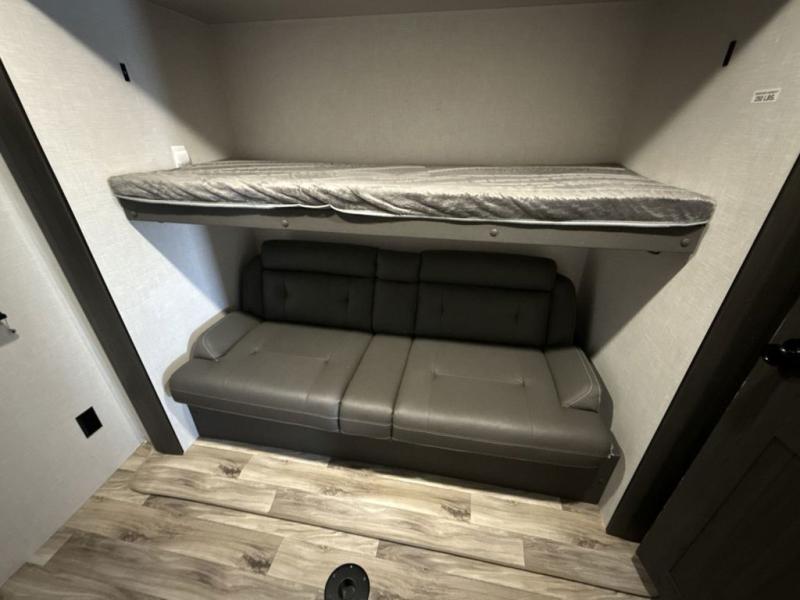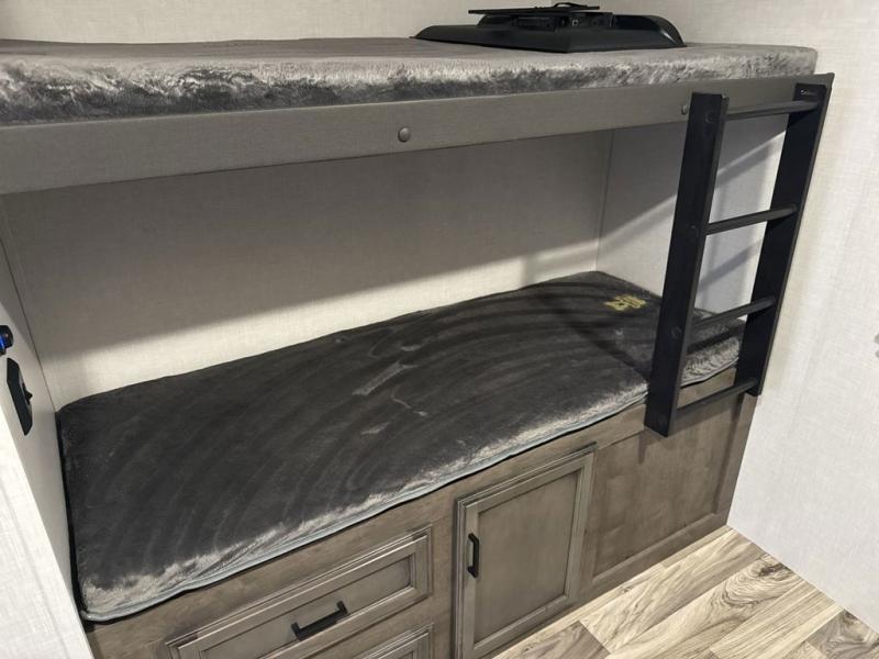 The whole family can camp together in this travel trailer! It features a rear private bunkhouse with a 28" x 70" top bunk above a 40" x 70" bottom bunk, a closet, and a 28" x 73" flip up top bunk above a 70" sofa with table slide. One of the dual entry doors leads directly into the half bathroom with fold-out aluminum steps so you can get back to having fun faster. The chef can prepare their best meals for the crew either indoors with the three burner cooktop or at the exterior campfire café with a 40" TV/DVD/speakers to entertain them while they cook. Everyone can gather together at the 42" grand dinette and 70" tri-fold sofa across from the entertainment center with a fireplace for a cozy evening. The dual entry bathroom is easy to access, especially for those staying in the front private bedroom. You even have a coat closet next to the main entrance to limit the clutter!