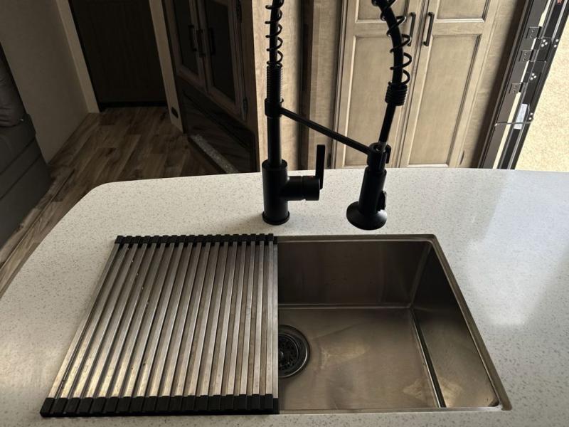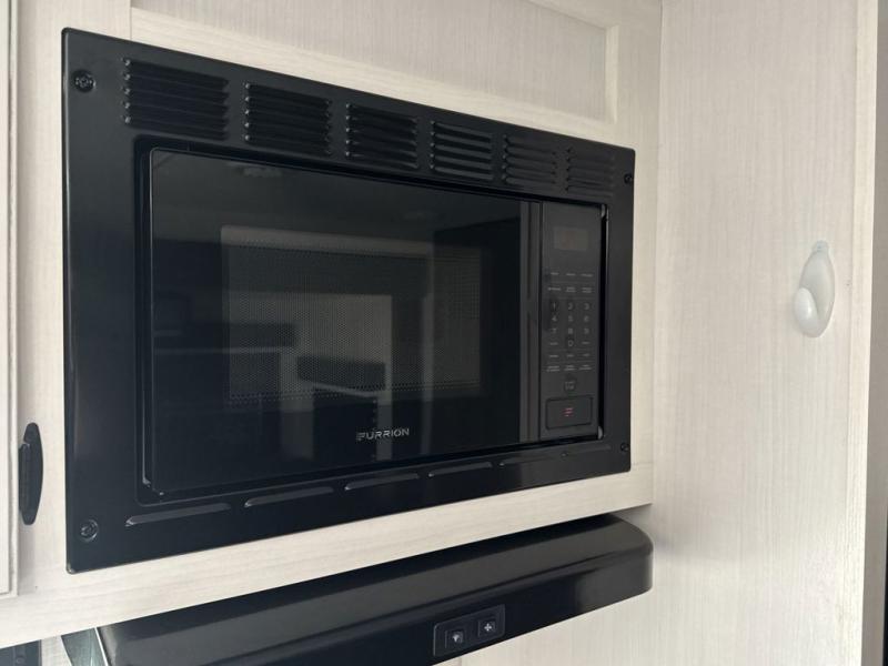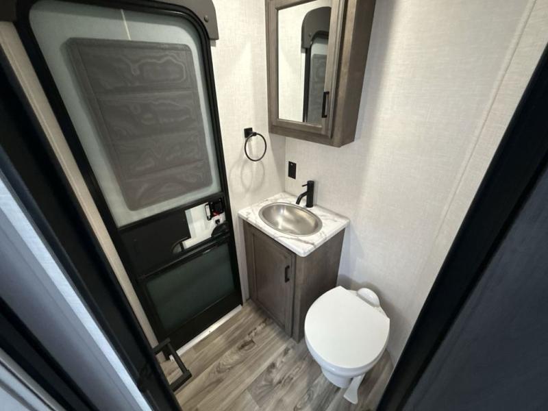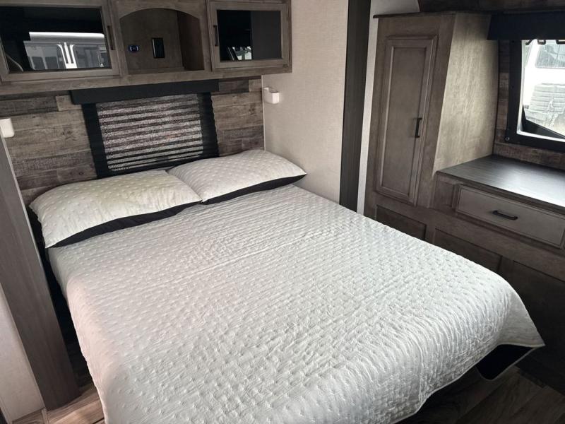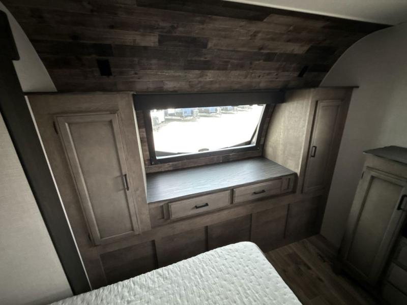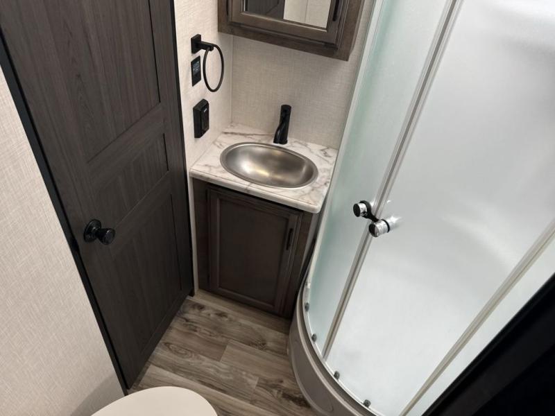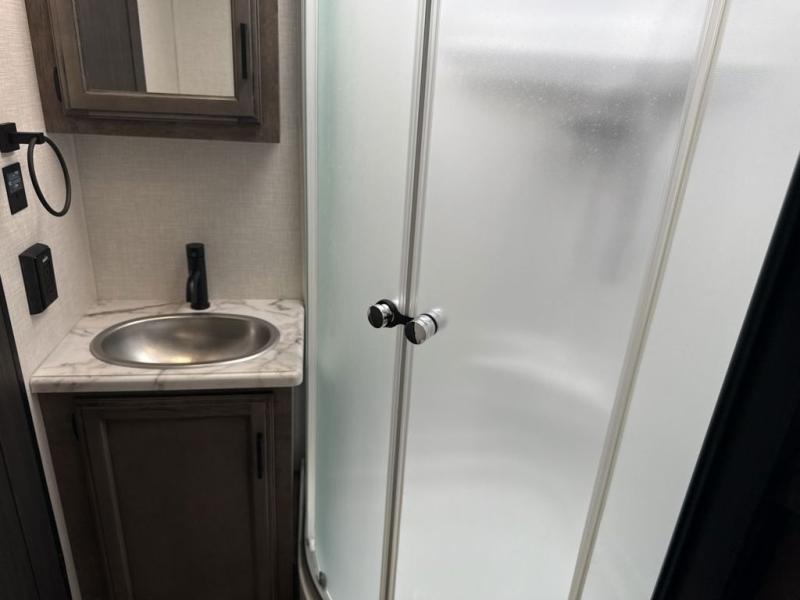 The whole family can camp together in this travel trailer! It features a rear private bunkhouse with a 28" x 70" top bunk above a 40" x 70" bottom bunk, a closet, and a 28" x 73" flip up top bunk above a 70" sofa with table slide. One of the dual entry doors leads directly into the half bathroom with fold-out aluminum steps so you can get back to having fun faster. The chef can prepare their best meals for the crew either indoors with the three burner cooktop or at the exterior campfire café with a 40" TV/DVD/speakers to entertain them while they cook. Everyone can gather together at the 42" grand dinette and 70" tri-fold sofa across from the entertainment center with a fireplace for a cozy evening. The dual entry bathroom is easy to access, especially for those staying in the front private bedroom. You even have a coat closet next to the main entrance to limit the clutter!