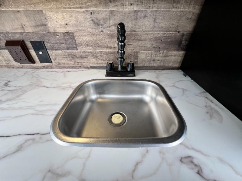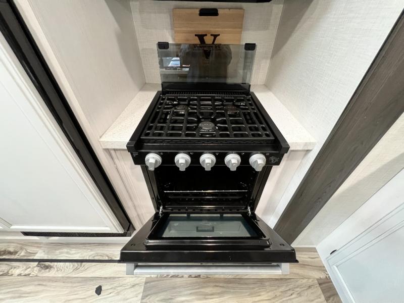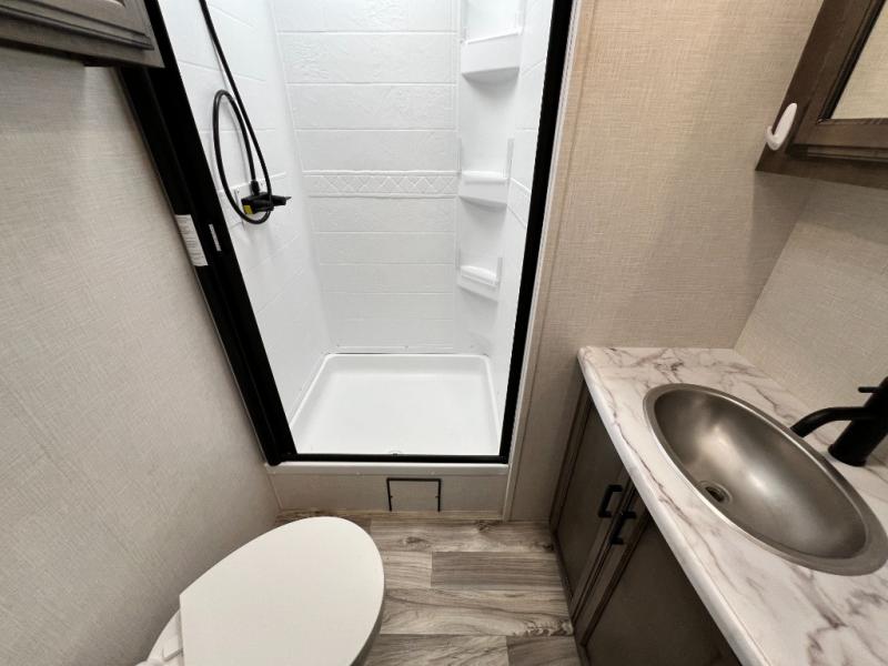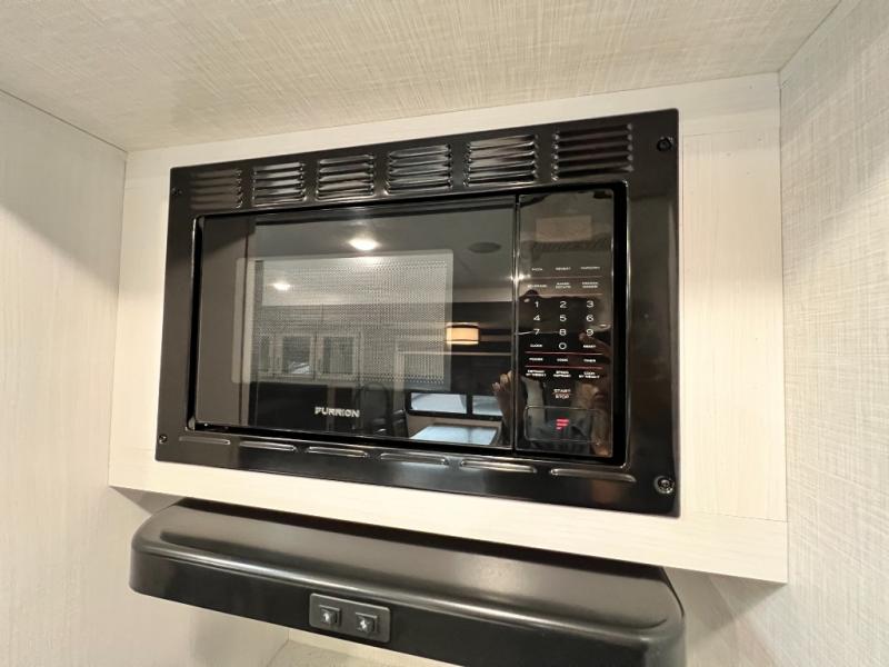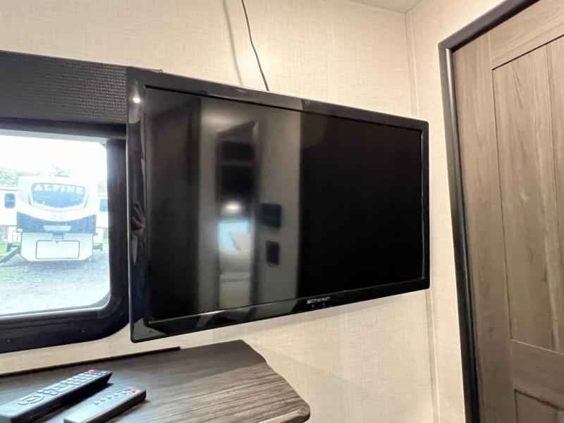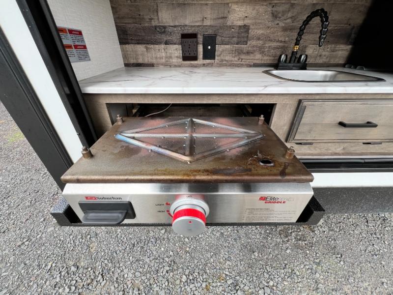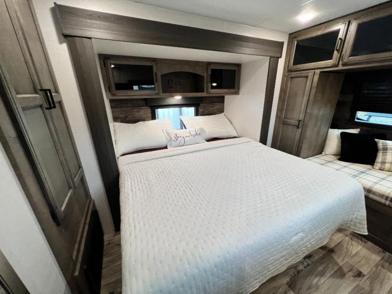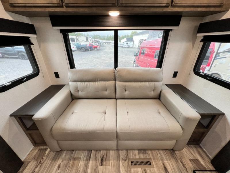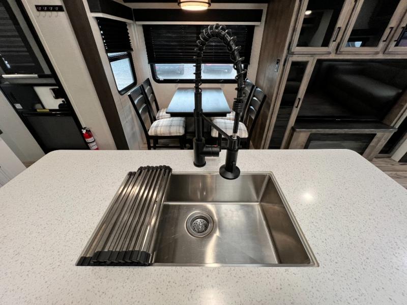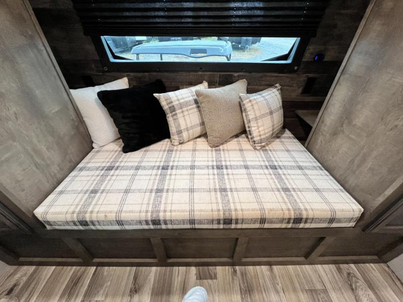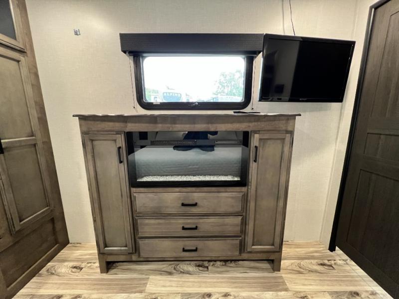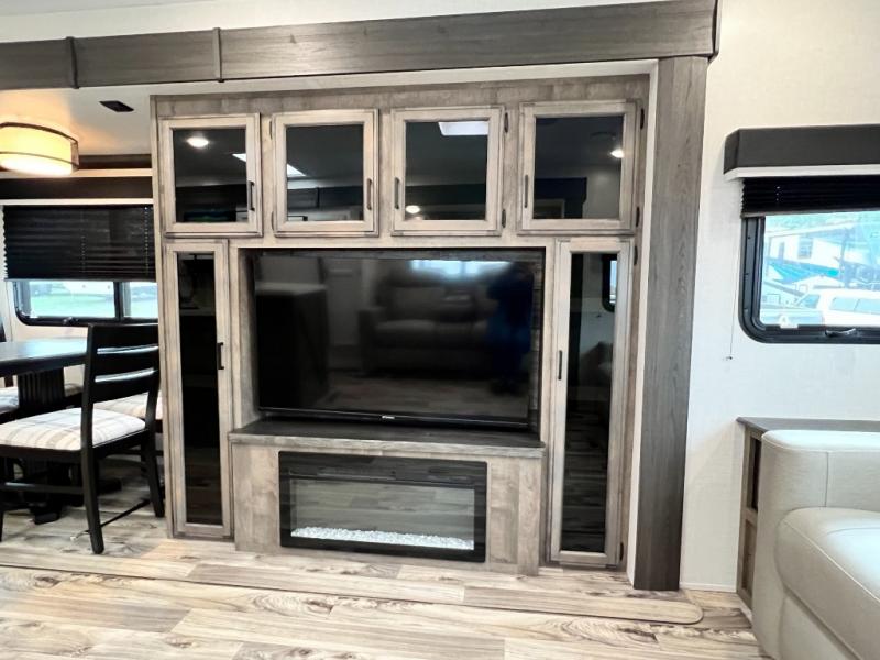 Pack your bags and hitch up this travel trailer for a great weekend camping trip! The front private bedroom has a 70" x 80" Sleep Tight king bed slide to lay your head at night, a dresser with a 30" frameless fireplace, a window seat with shelves on either side for your books, and a wardrobe with washer and dryer prep. Freshen up each morning in the full bathroom with the 30" x 36" shower then head to the kitchen to fry up some eggs on the three burner cooktop and pour a cold glass of orange juice stored in the 10 cu. ft. refrigerator. The kitchen island will make your meal prepping easier and the table and chairs offer a comfortable place to enjoy your meals or play card games. You could even cook your meals at the exterior campfire café and set up a table underneath one of the two power awnings!