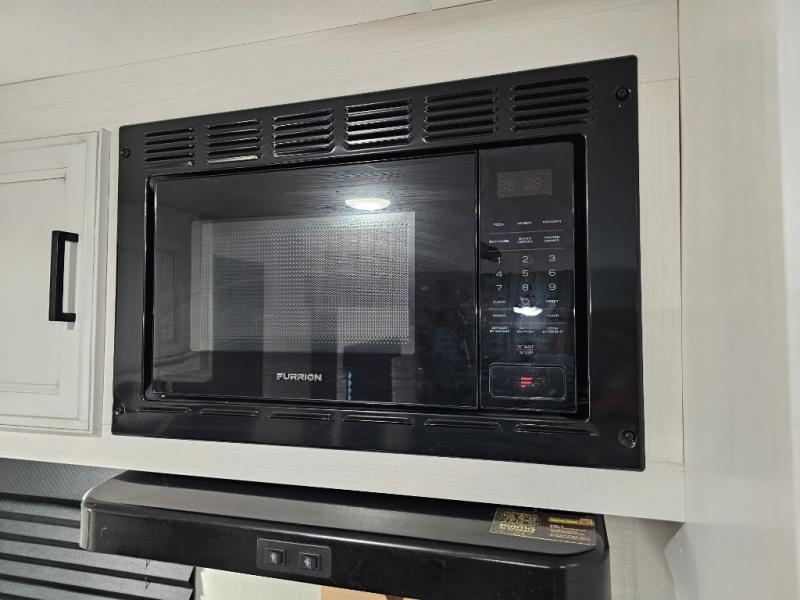 Fully equipped indoor kitchen with a three-burner cooktop, microwave, and 8 cu. ft. refrigerator