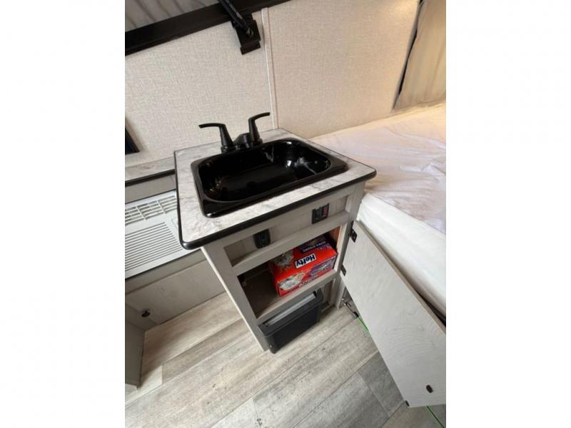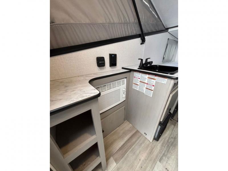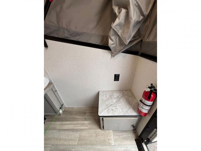 If you want to keep your camping trips on the minimal side, check out this Express Series folding pop-up camper! You can stay warm with the furnace, and you can wash your hands or your produce in the sink. There is a bench seat directly to your left when you enter, so you can sit down to tie your shoes. The countertop to your right when you walk in the door is able to hold items, or you can use it as a preparation area. The 54" x 74" bed will allow you to sleep in comfort each night without having to sleep on the cold, hard ground.