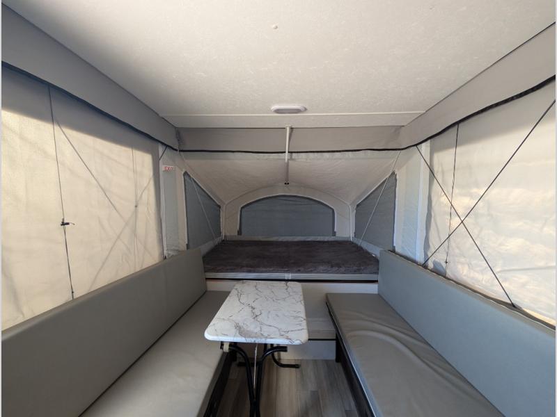 Head to your favorite spot with your favorite people in this folding pop-up camper! There are two insulated tent end beds with Glide-N-Lock cable supported, one is 48" and the other is 54", to lay your head on at night. Plus two opposing 60" gaucho sofas with ultra comfort 4" high density cushions that can convert into an extra sleeping space. You can prepare your best home cooked meals with the two burner high output range and keep your perishables fresh with the 120watt/12V refrigerator/freezer cooler. The exterior awning will protect you rain or shine!