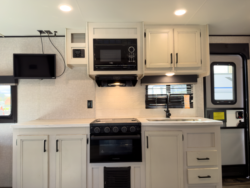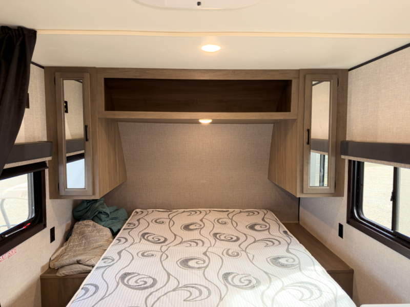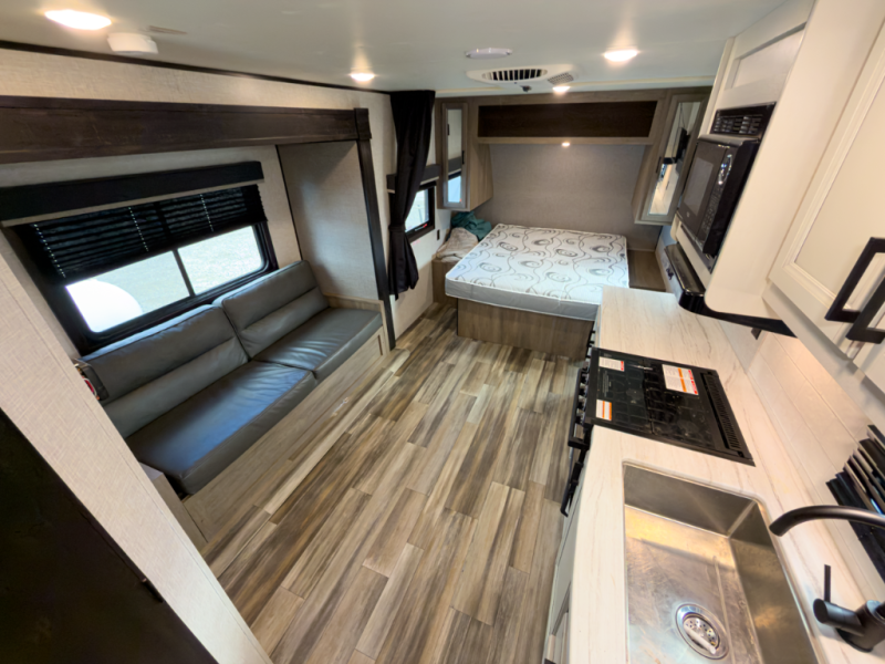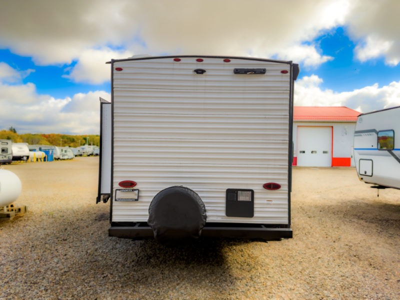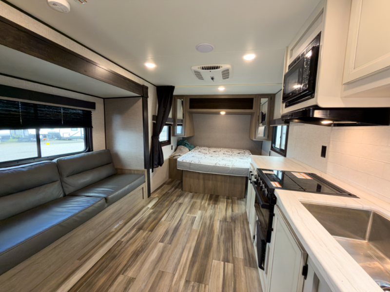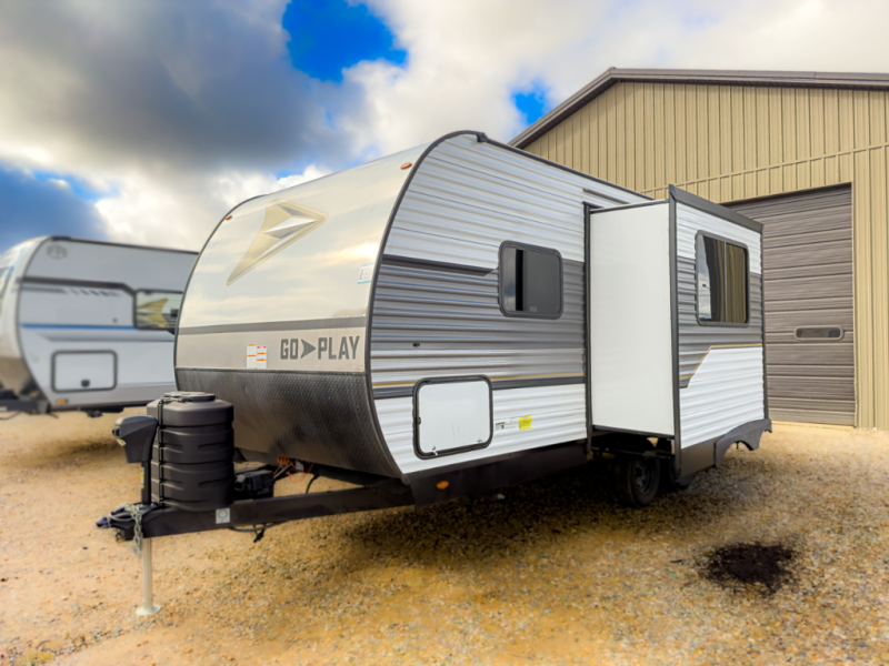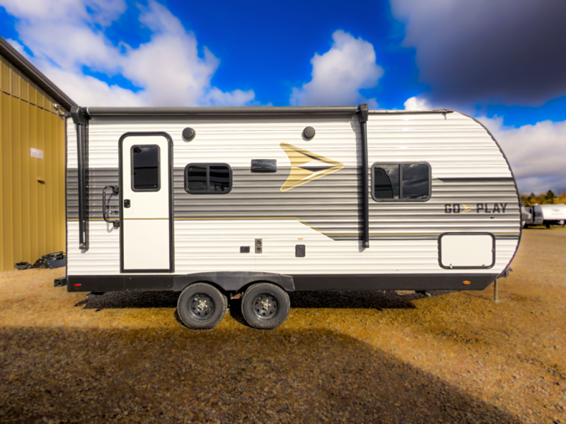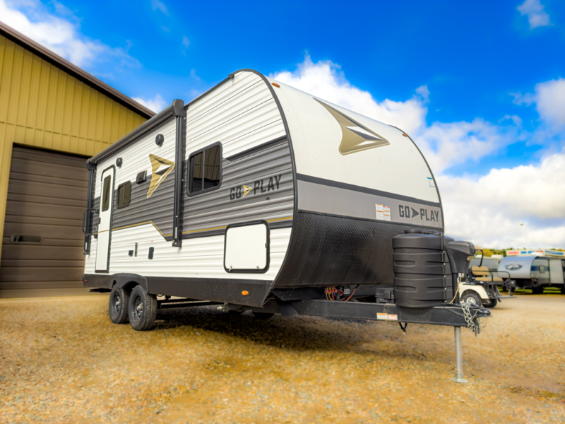 Go Play 20FBS with walk-around queen bed, slideout sofa comfort, modern Wayfinder construction, and lightweight towability built for efficient, hassle-free Michigan trips.