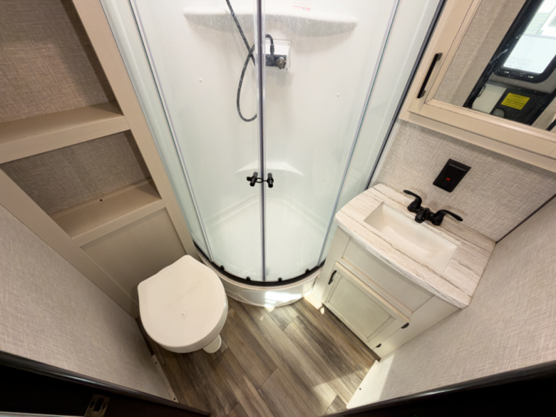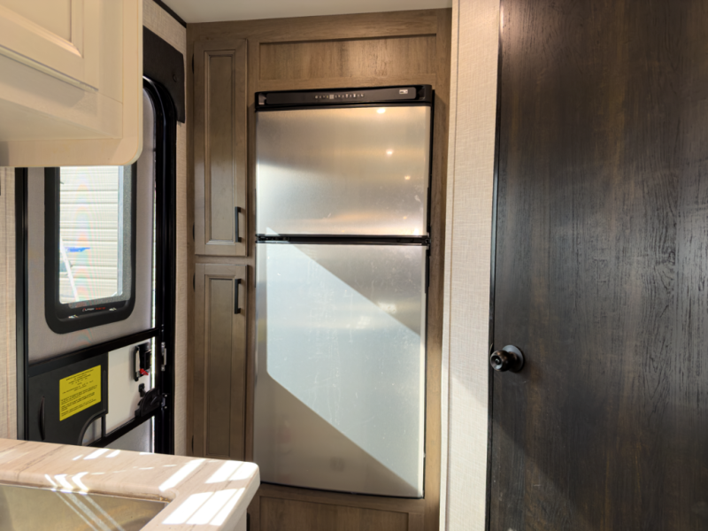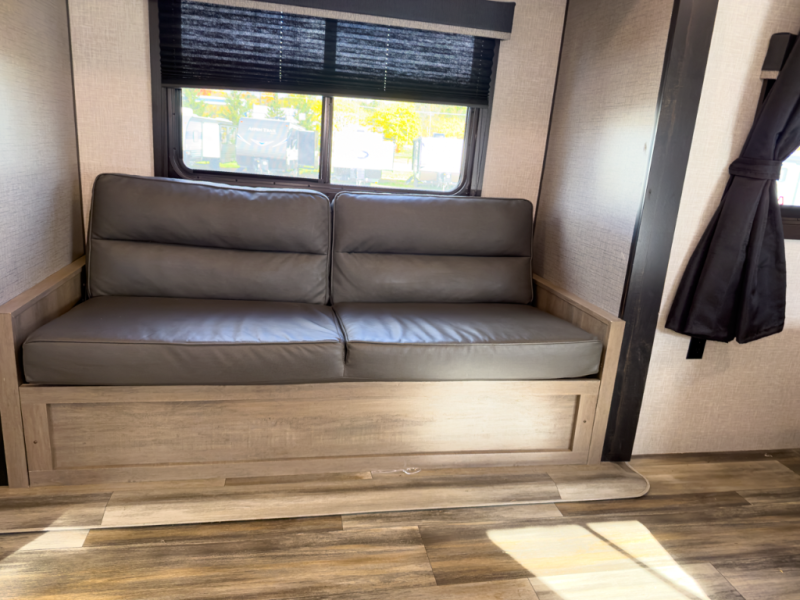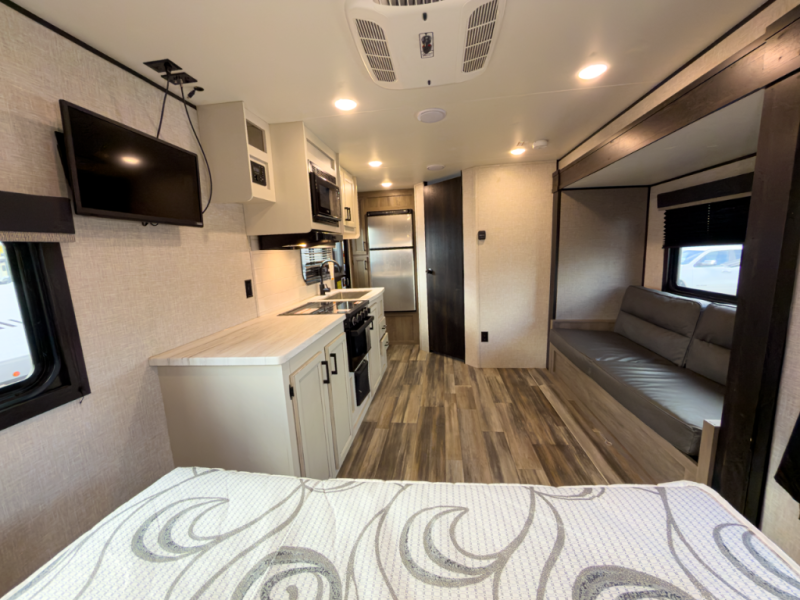 This is the perfect couple's trailer for room for an overnight guest on the jack-knife sofa. You'll appreciate a table in front of the sofa where you can enjoy eating together, and the slide out provides more space to move about. This model includes a front bedroom with a privacy curtain and dual wardrobes to store your clothes for the week, plus there is a full bath towards the back of the unit to stay clean each day. Snacks and paper goods can go in the entryway pantry, and camp gear can be kept in the outdoor storage!