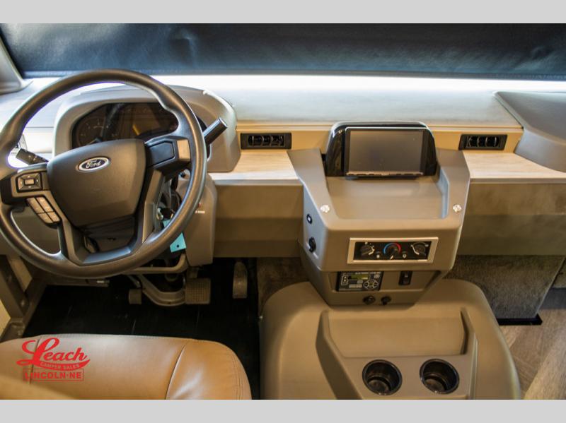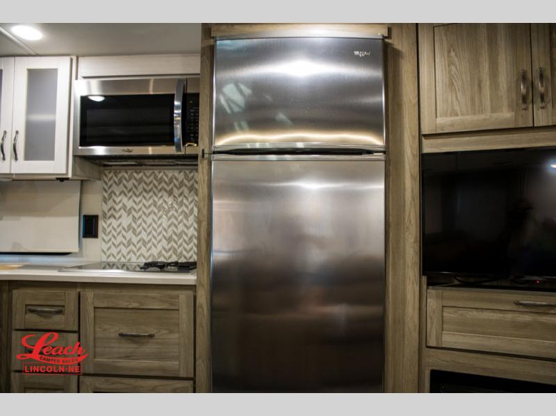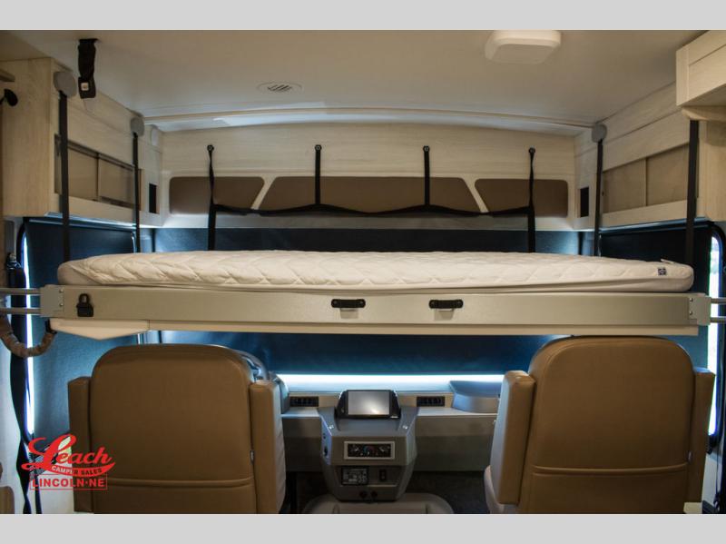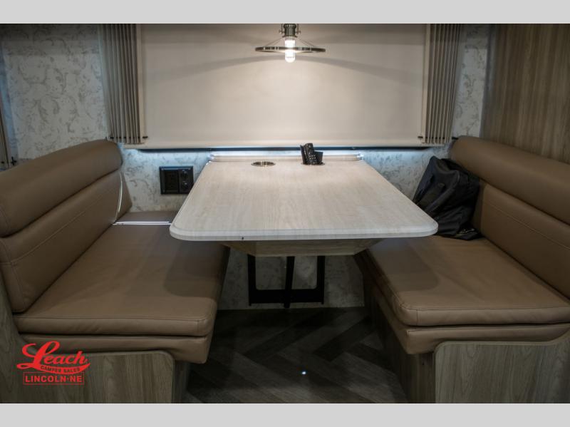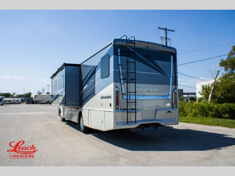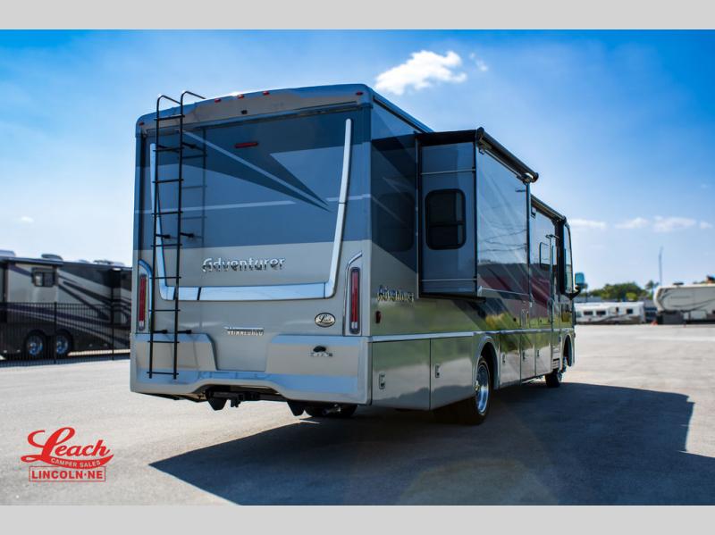 The family-friendly Adventurer Class A gas motorhome by Winnebago is the ultimate family getaway for your trips near and far. The swivel captain's seats include fixed lumbar support and multi-adjustable slide/recline for a truly comfortable ride. You will appreciate the Sony 9" TS radio with Bluetooth, a rearview and sideview monitor system with a color touch screen, SiriusXM ready, and more to make the drive easier than ever. The powered blackout roller visor/shade on the front windshield will provide privacy when you stop for lunch, and the dash workstation will come in handy when you've got a deadline. Each model includes residential vinyl flooring throughout, a soft vinyl ceiling, a Corian galley countertop, and ceramic tile backsplash. The under-bed storage will provide a place for your luggage, and you'll find lighted storage compartments outside for all your larger gear. The Sumo Springs front and rear suspension from SuperSprings International and steering stabilizer system will provide a smooth ride wherever the road takes you, and the exterior full-body is sure to turn heads!