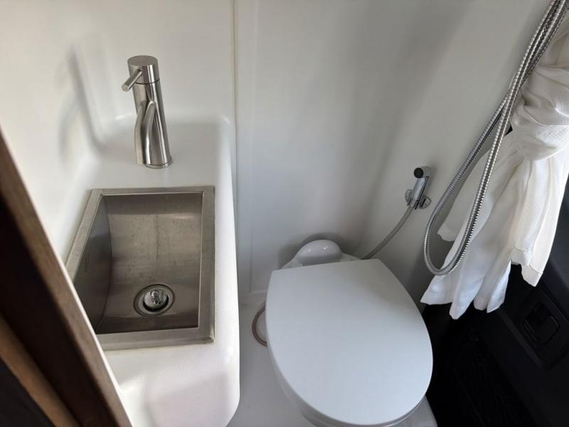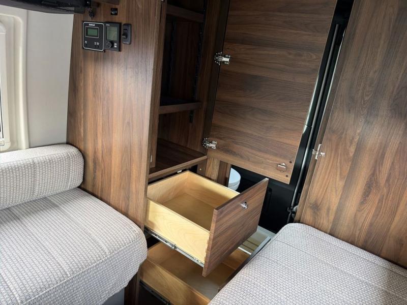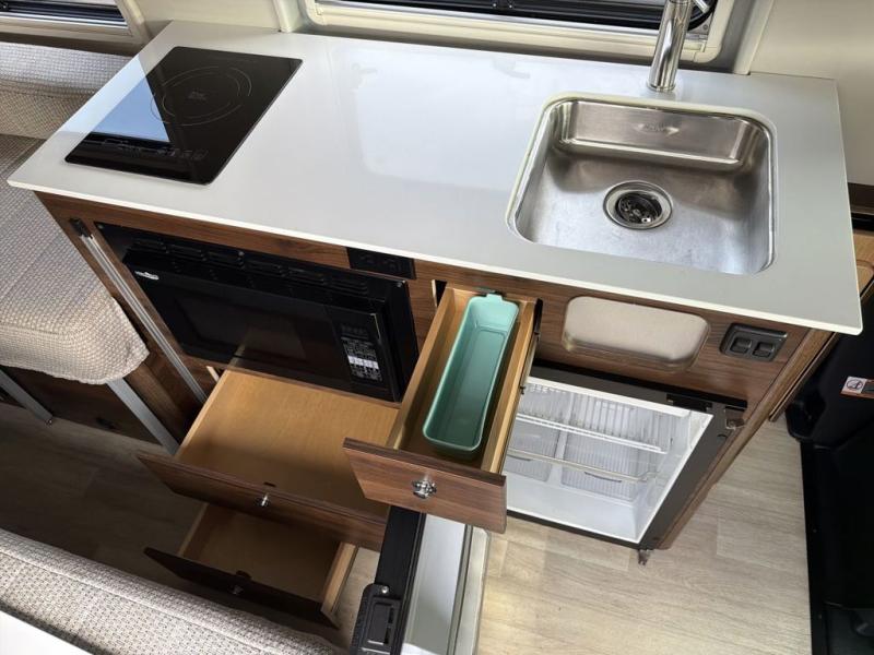 This Boldt motorhome is up for anything, so pack your bags for never-ending adventures! The rear double doors open up to the wet bath so you can quickly use the restroom and get back outside, and there is a bath wardrobe here to store clean towels when it's time to clean up. There are comfortable twin beds with a swivel table in between to enjoy a meal together, and you can easily convert the twin beds to a 41" x 74" Flex bed. Cooking meals will be easy with the single burner induction cooktop, and the pull-up, flip-out table will provide more counter space when cutting fresh veggies. For even more convenience, you will enjoy the power sliding door and rear double doors with a magnetic closure to keep bugs out!