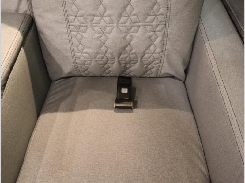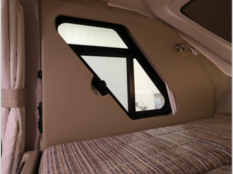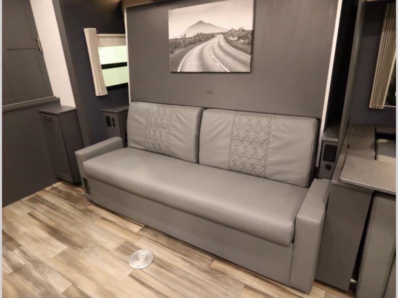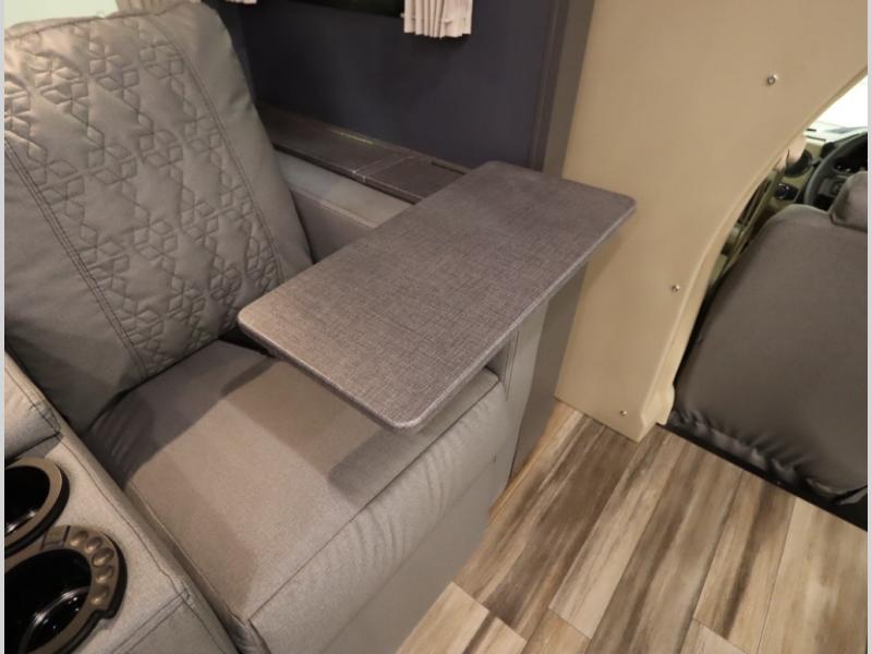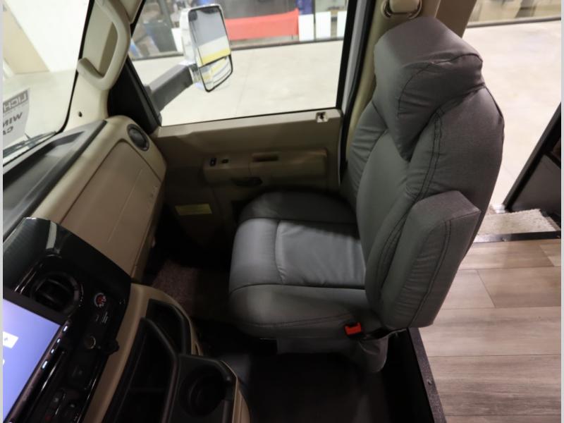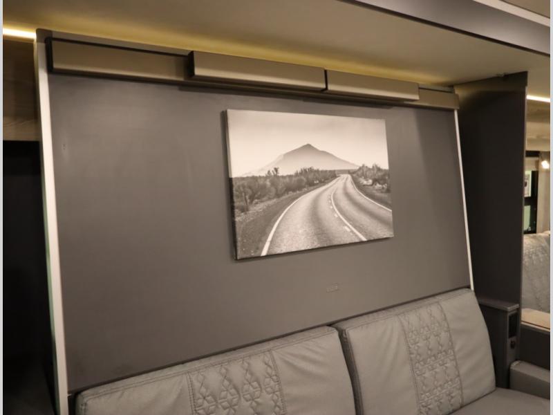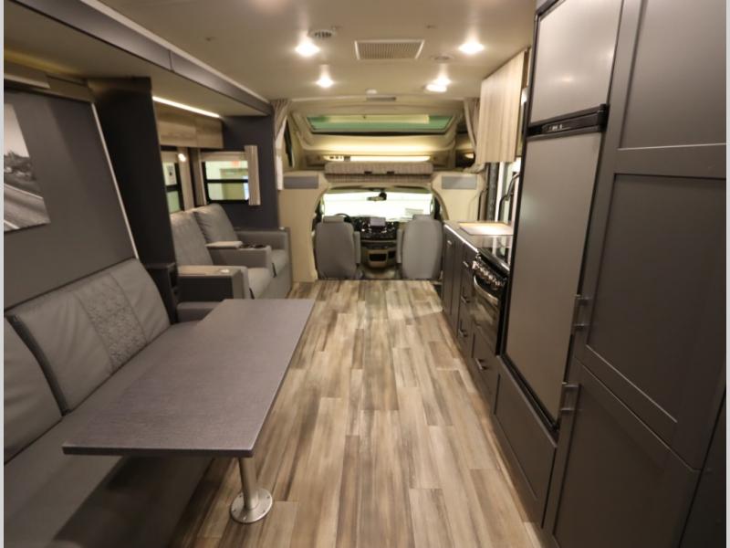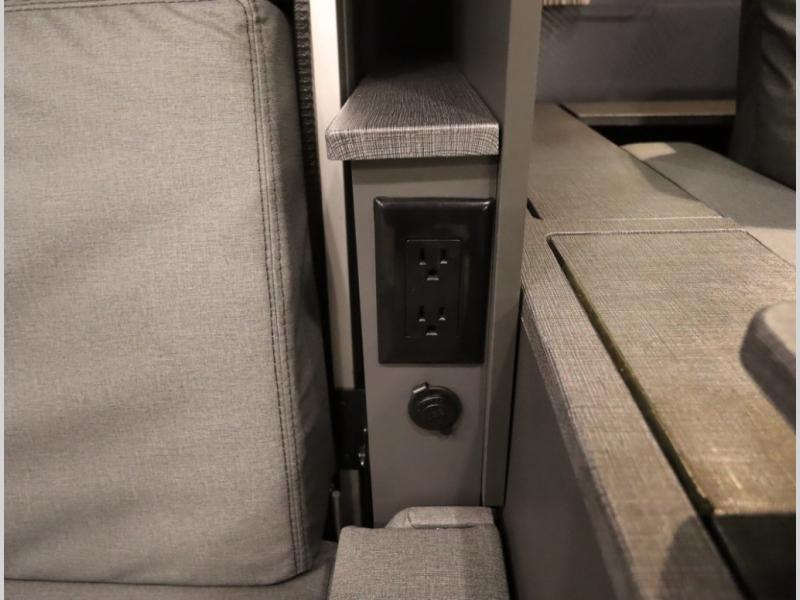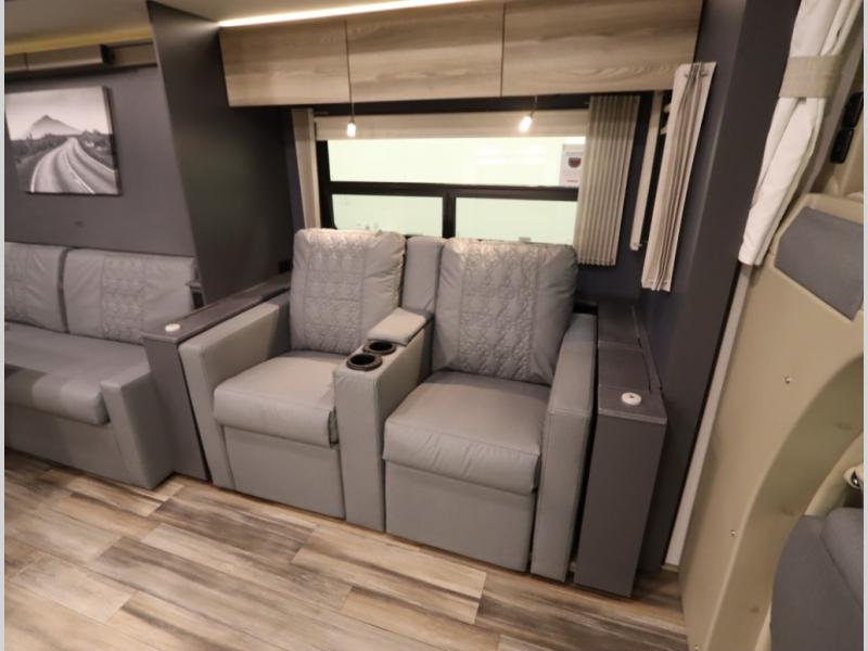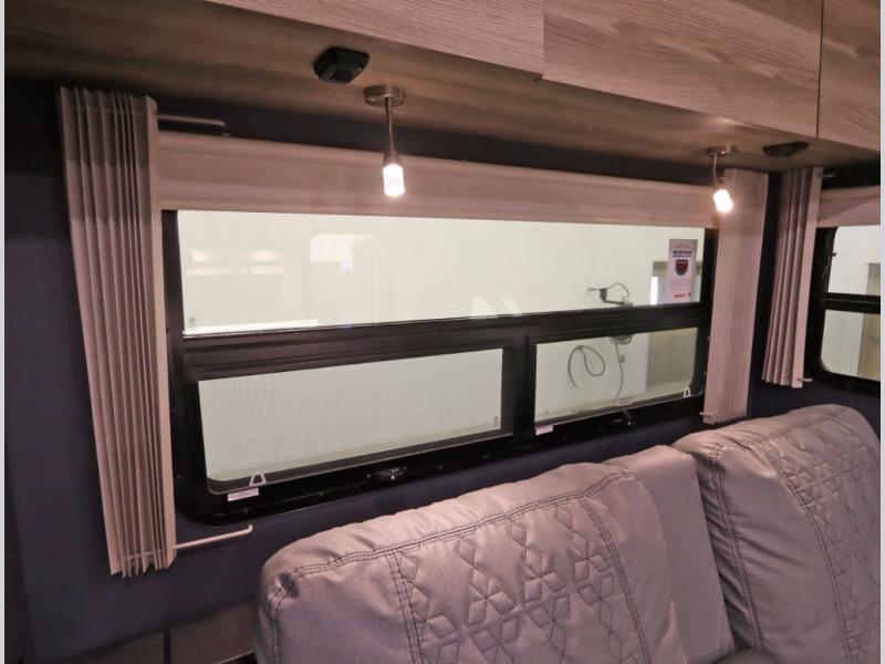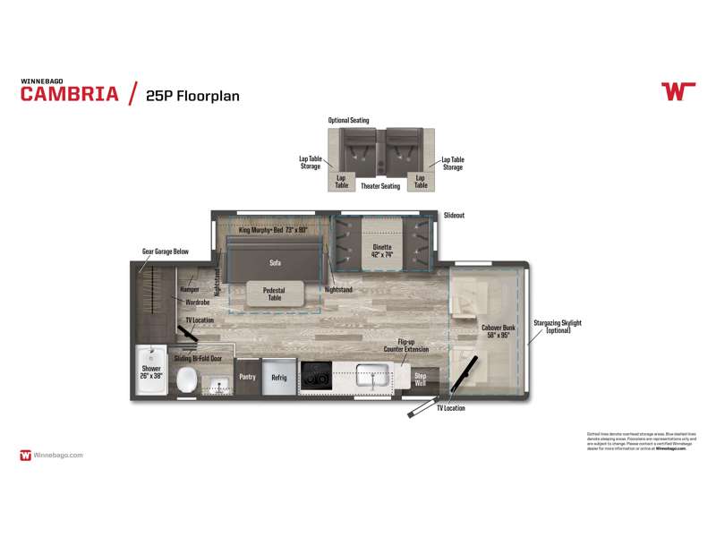 The Winnebago Cambria 25P features a full wall slideout with a powered King Murphy bed, in which bedding can be left on to quickly convert to a sofa, located rearward of the premium home theater lounge area with heat and massage seating. Incredible rear wardrobe storage with an oversized bath in one rearward of a spacious in line galley with upscale amenities such as solid surface countertops and European designed cabinetry.
