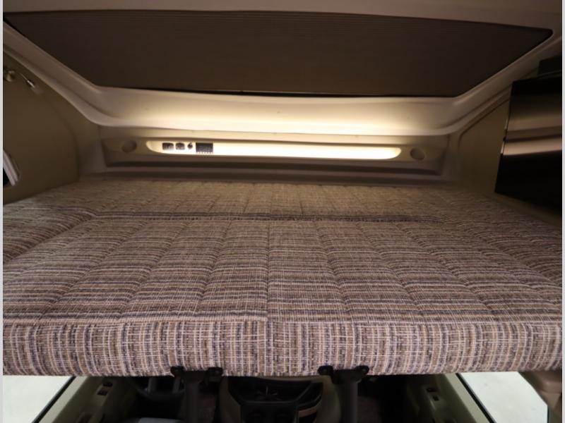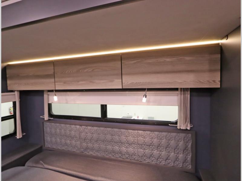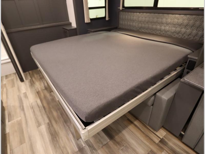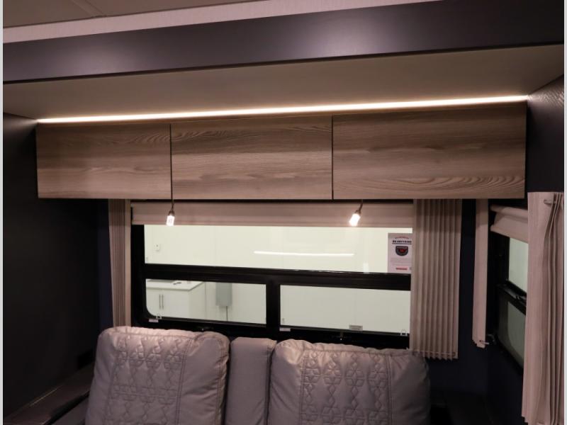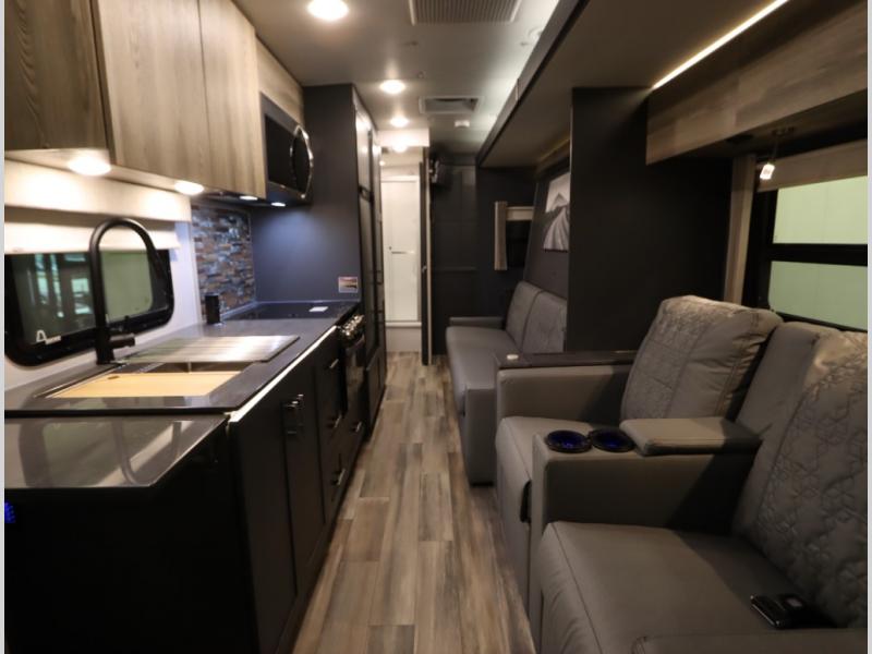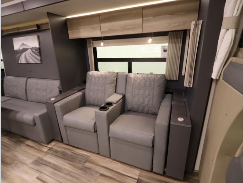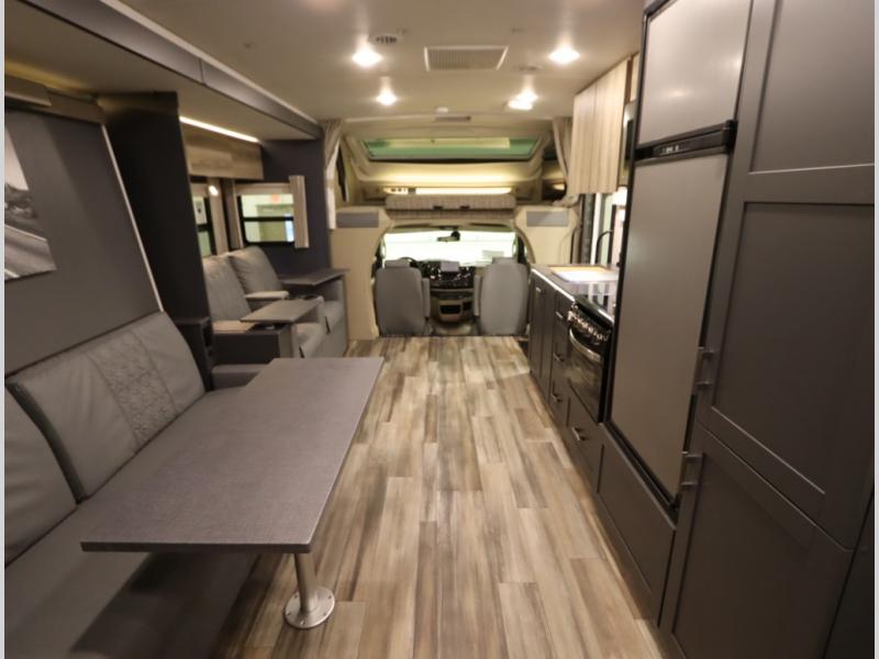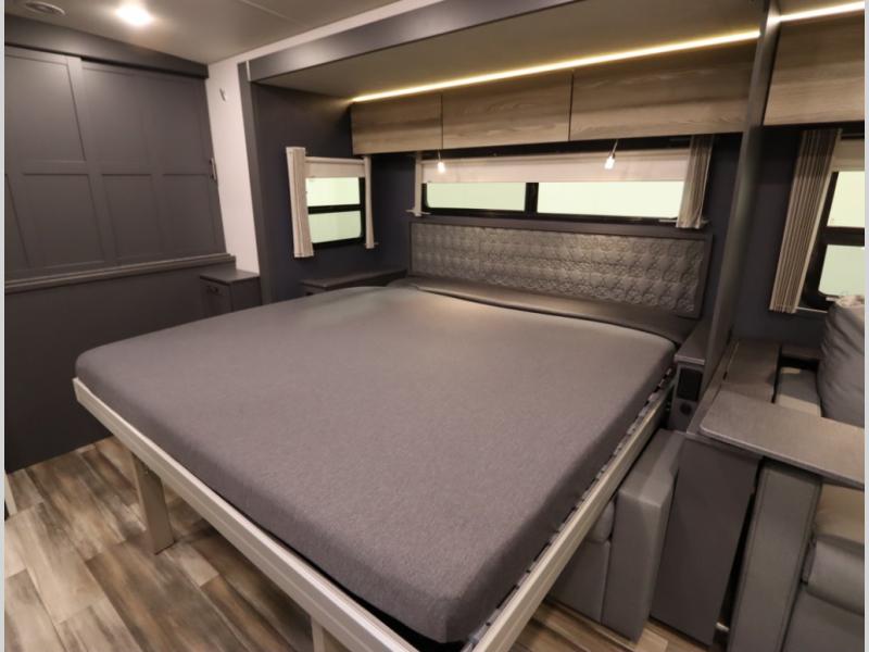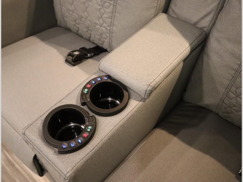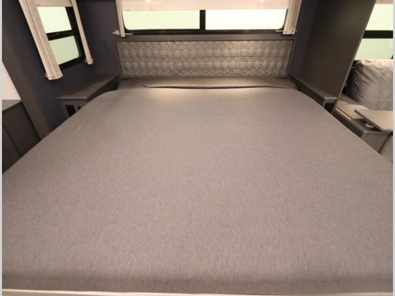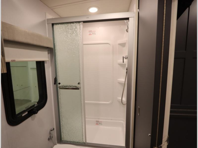 The Winnebago Cambria 25P features a full wall slideout with a powered King Murphy bed, in which bedding can be left on to quickly convert to a sofa, located rearward of the premium home theater lounge area with heat and massage seating. Incredible rear wardrobe storage with an oversized bath in one rearward of a spacious in line galley with upscale amenities such as solid surface countertops and European designed cabinetry.