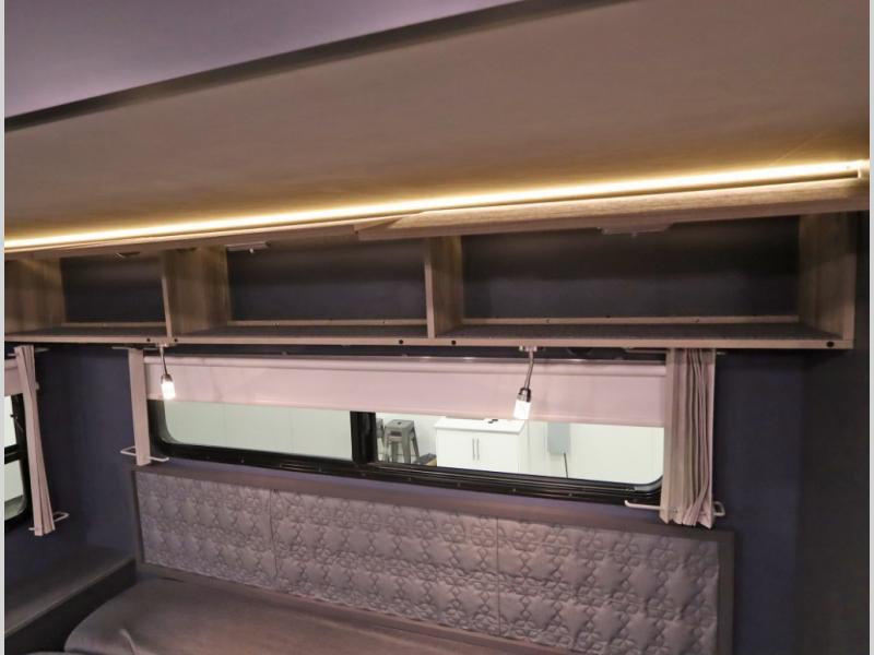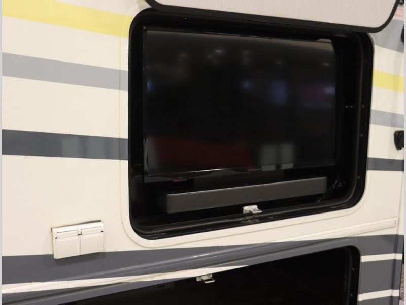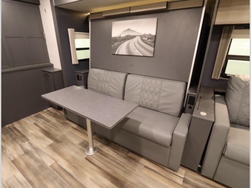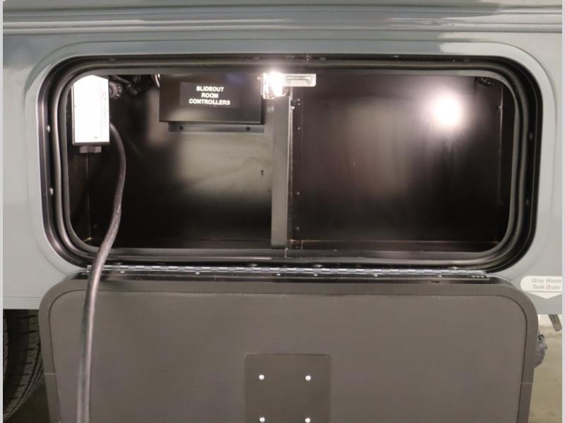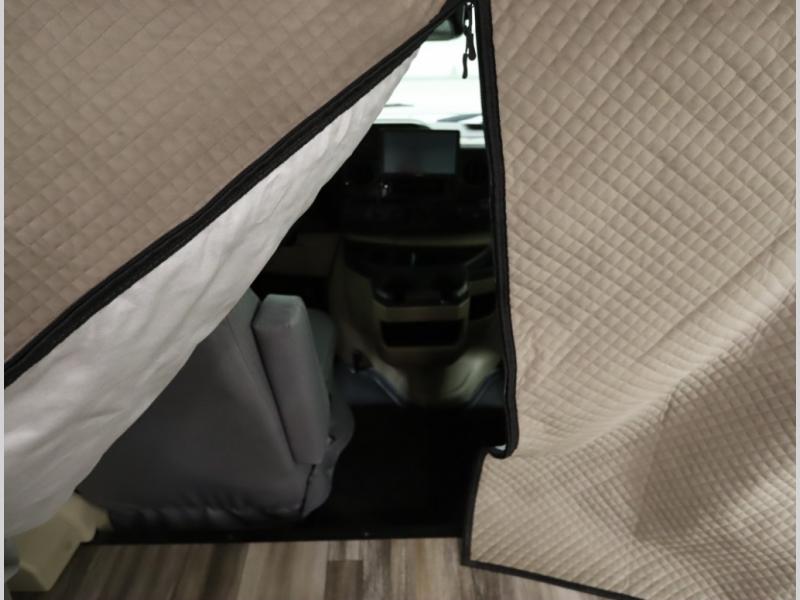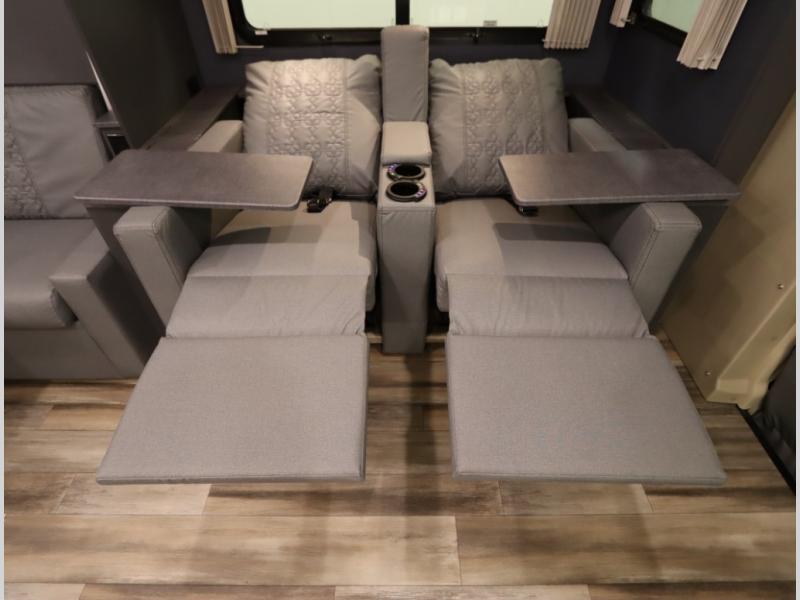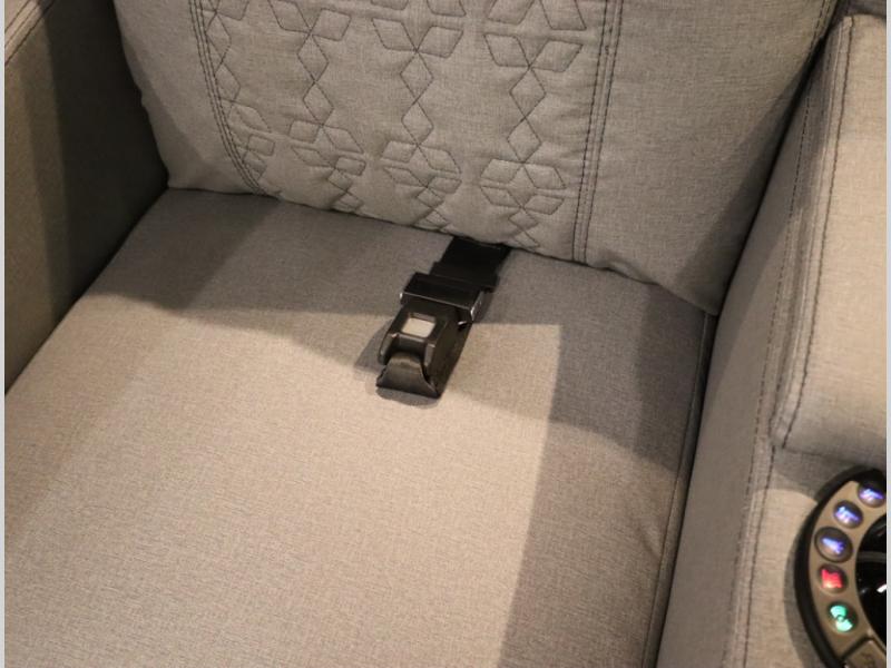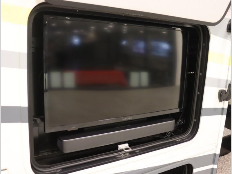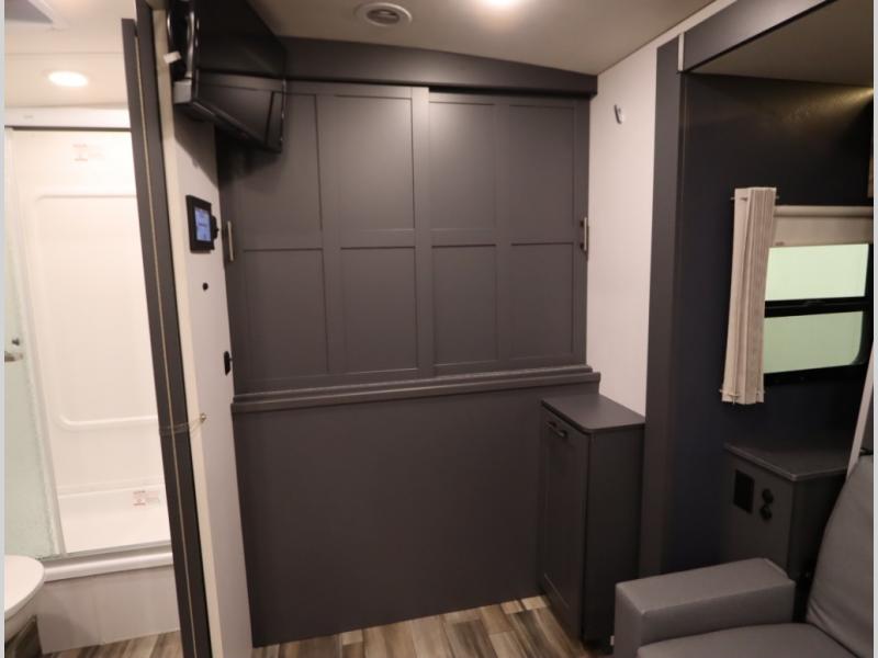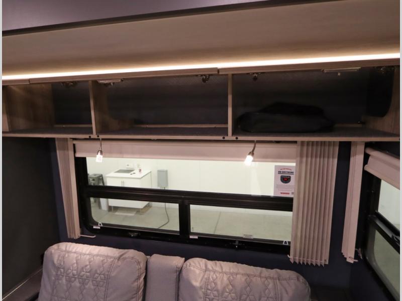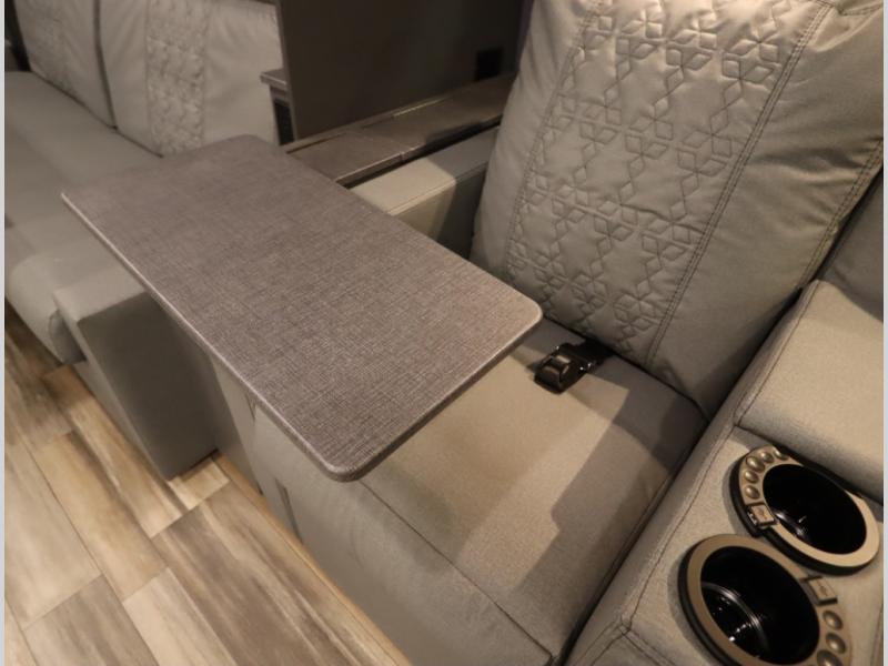 The Winnebago Cambria 25P features a full wall slideout with a powered King Murphy bed, in which bedding can be left on to quickly convert to a sofa, located rearward of the premium home theater lounge area with heat and massage seating. Incredible rear wardrobe storage with an oversized bath in one rearward of a spacious in line galley with upscale amenities such as solid surface countertops and European designed cabinetry.