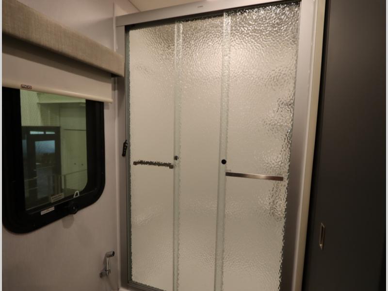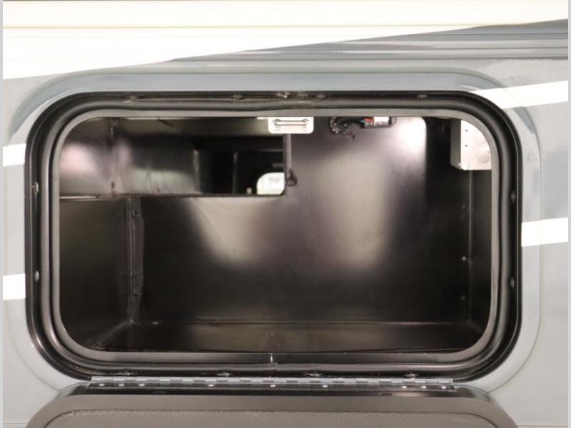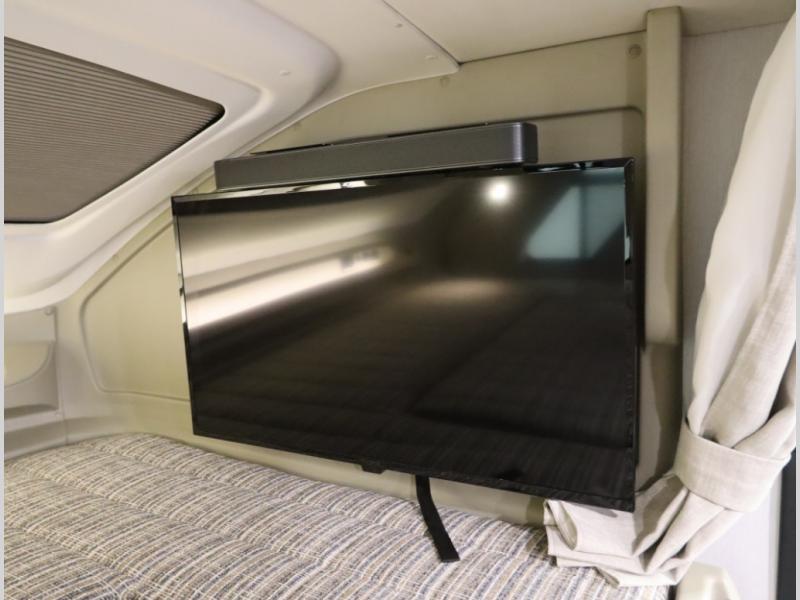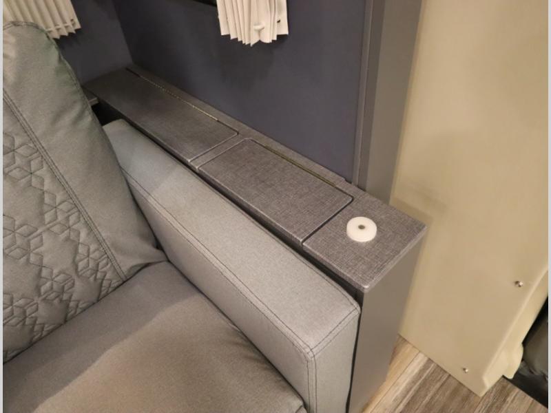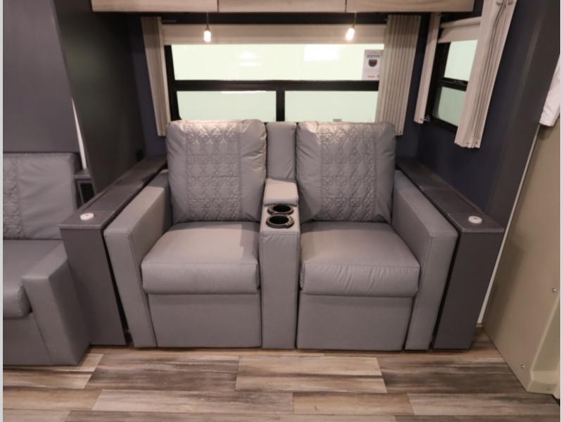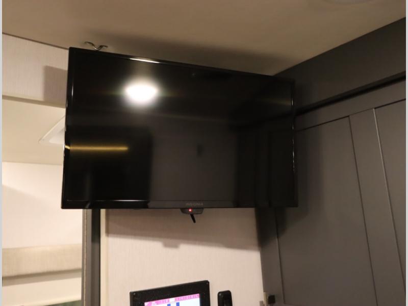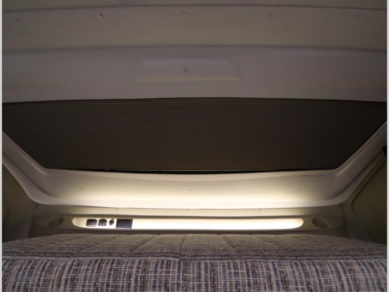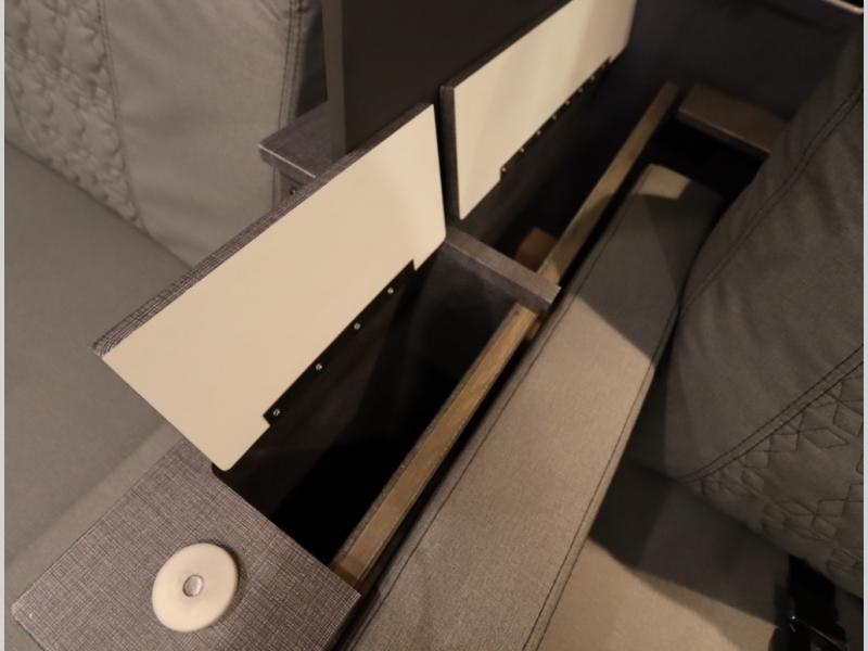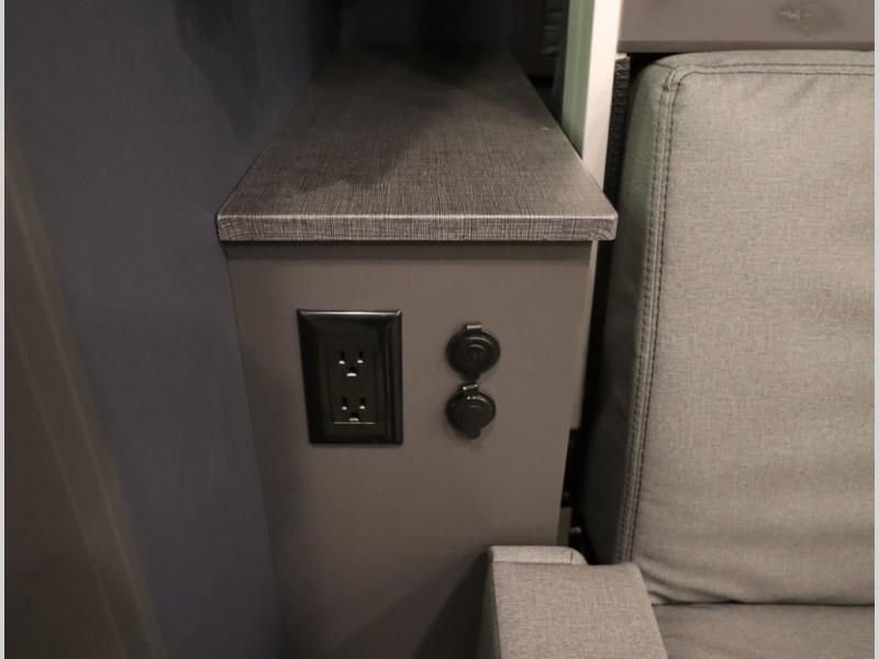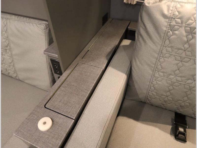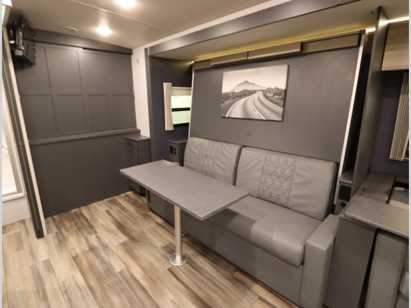 The Winnebago Cambria 25P features a full wall slideout with a powered King Murphy bed, in which bedding can be left on to quickly convert to a sofa, located rearward of the premium home theater lounge area with heat and massage seating. Incredible rear wardrobe storage with an oversized bath in one rearward of a spacious in line galley with upscale amenities such as solid surface countertops and European designed cabinetry.