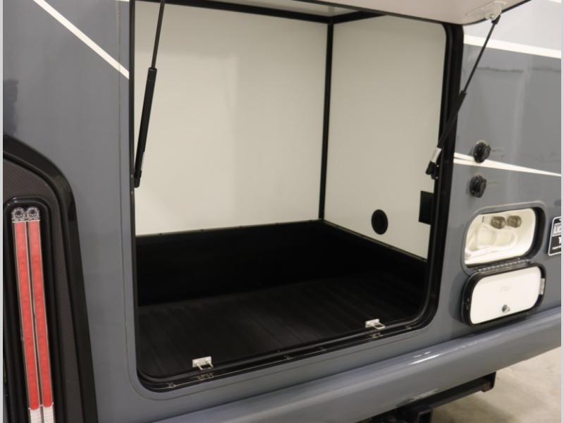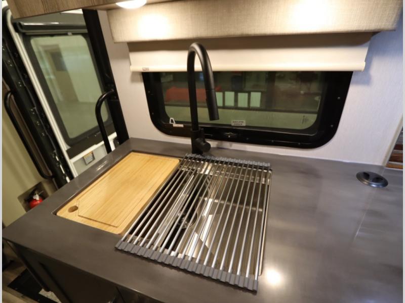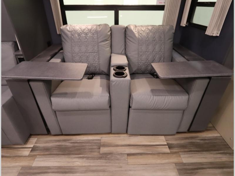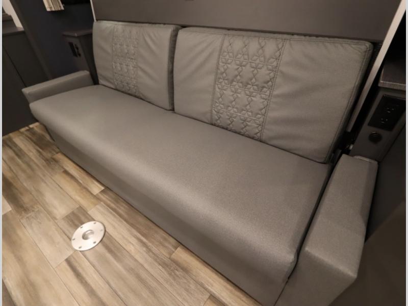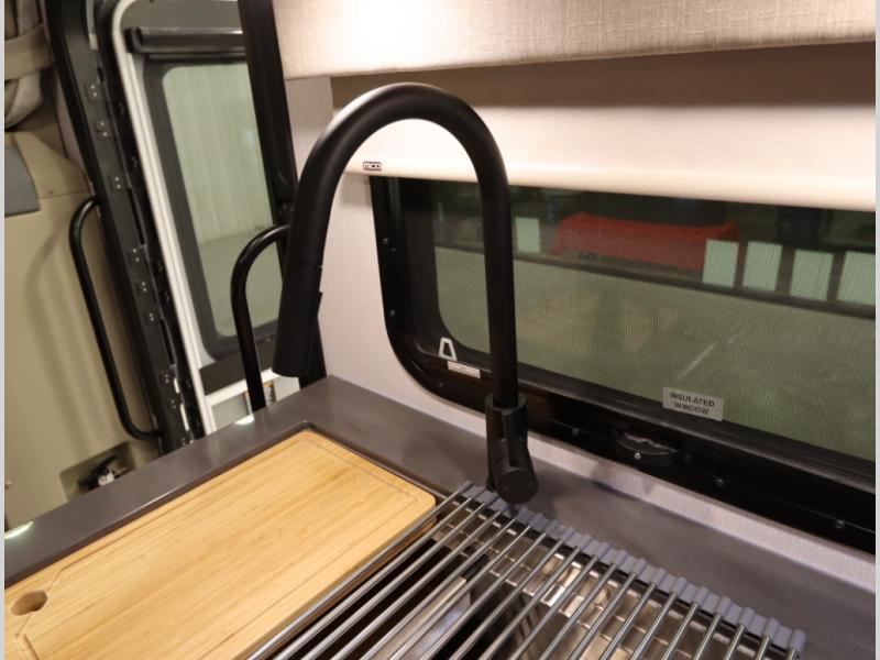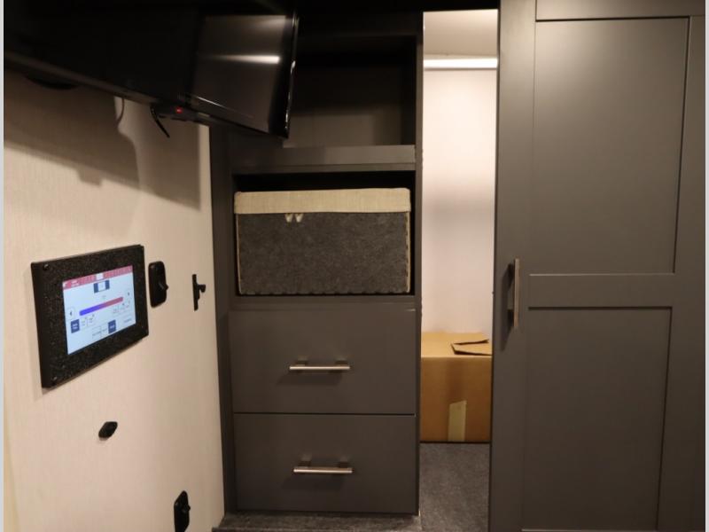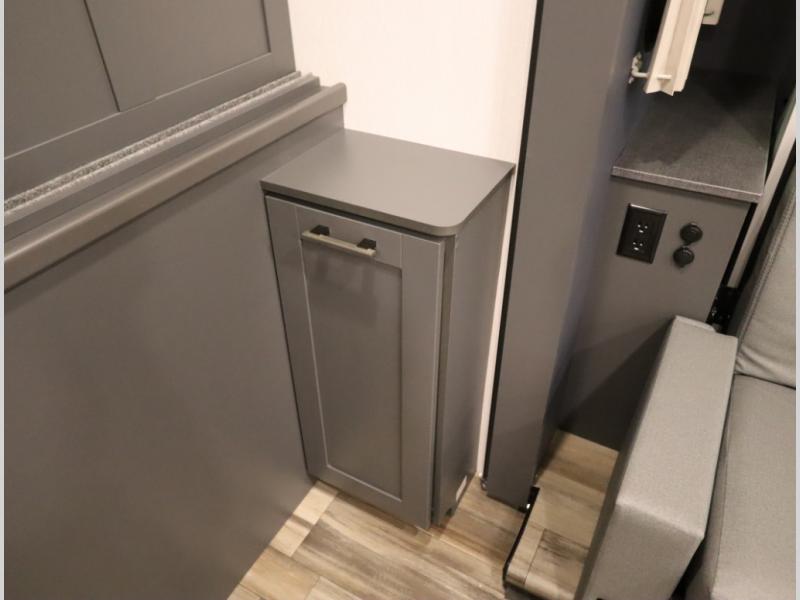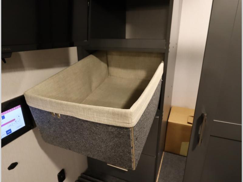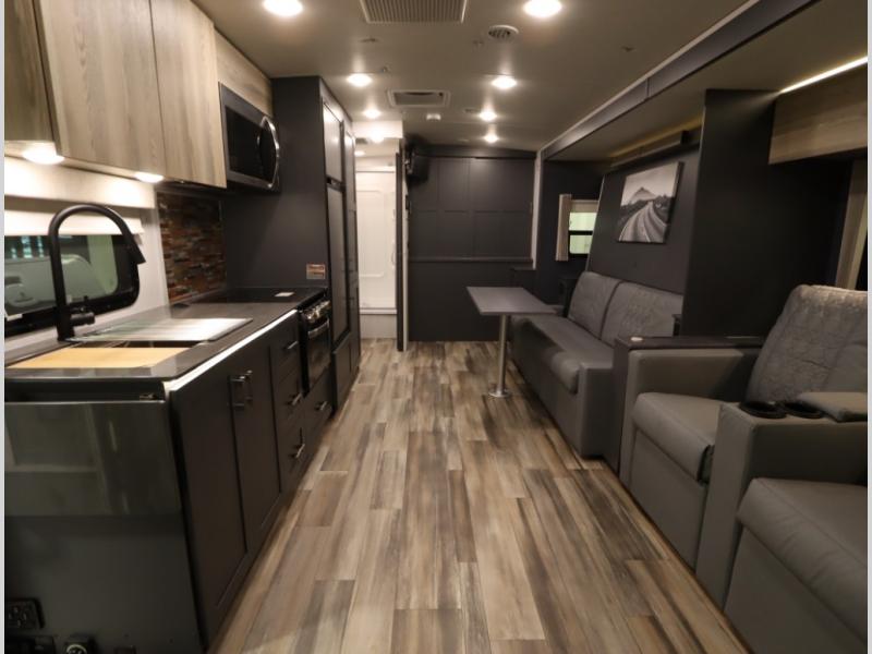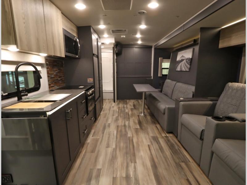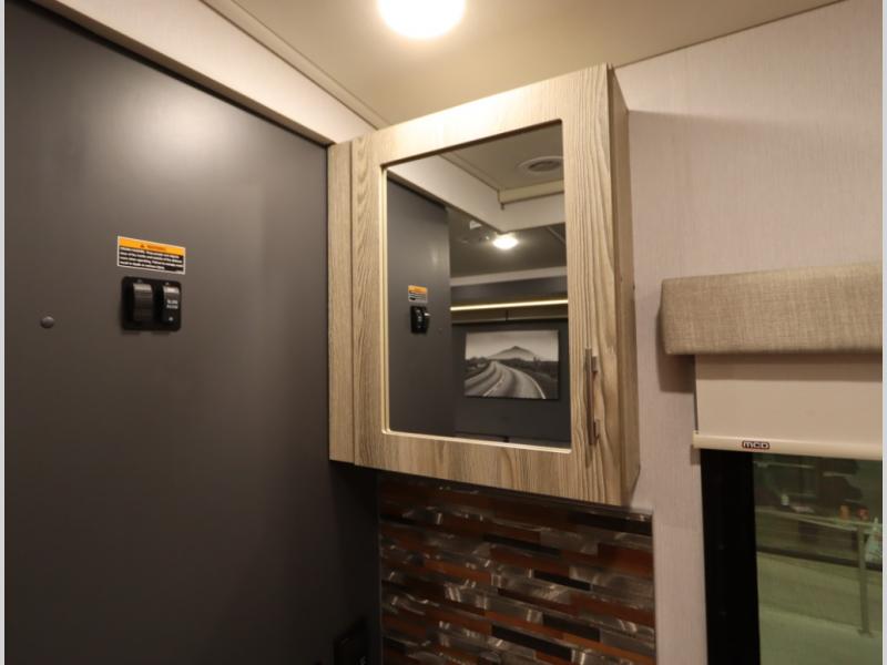 The Winnebago Cambria 25P features a full wall slideout with a powered King Murphy bed, in which bedding can be left on to quickly convert to a sofa, located rearward of the premium home theater lounge area with heat and massage seating. Incredible rear wardrobe storage with an oversized bath in one rearward of a spacious in line galley with upscale amenities such as solid surface countertops and European designed cabinetry.