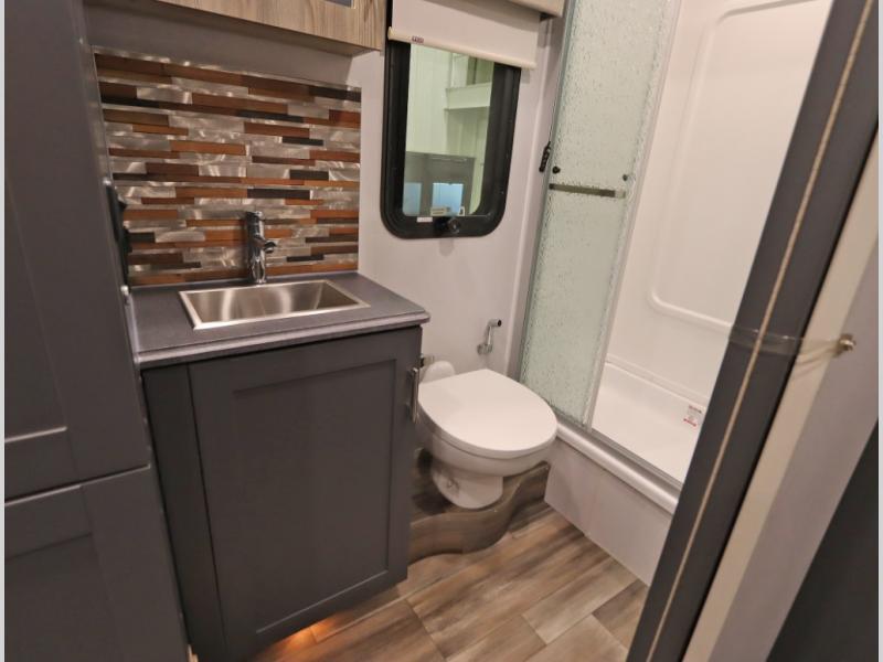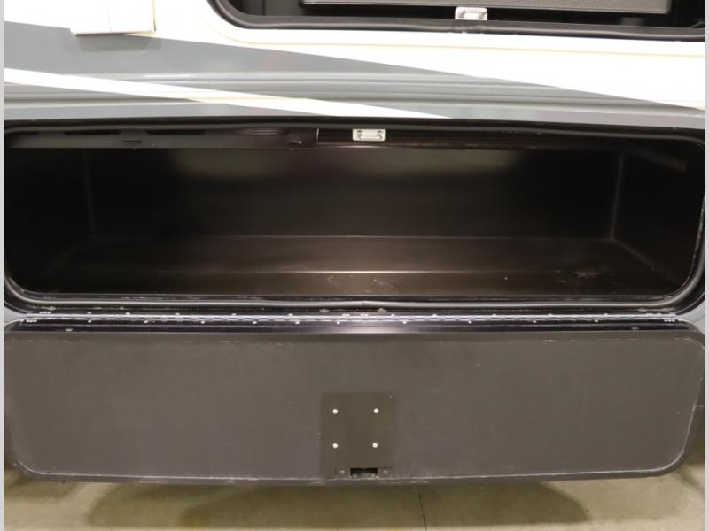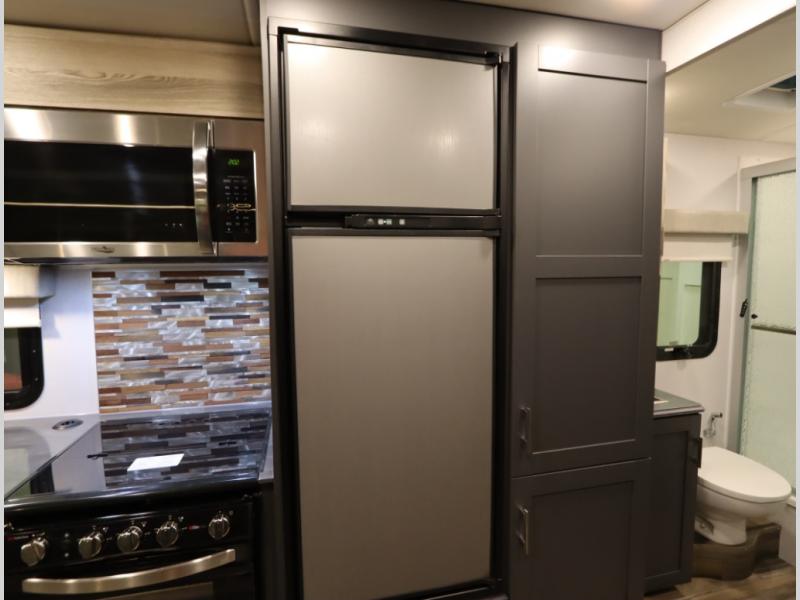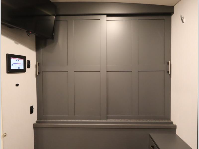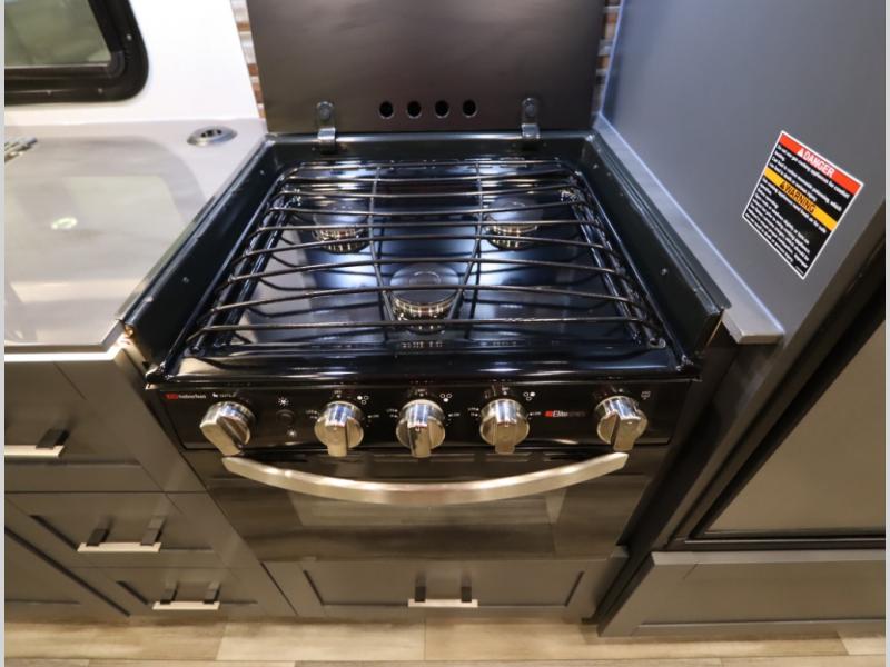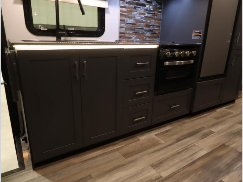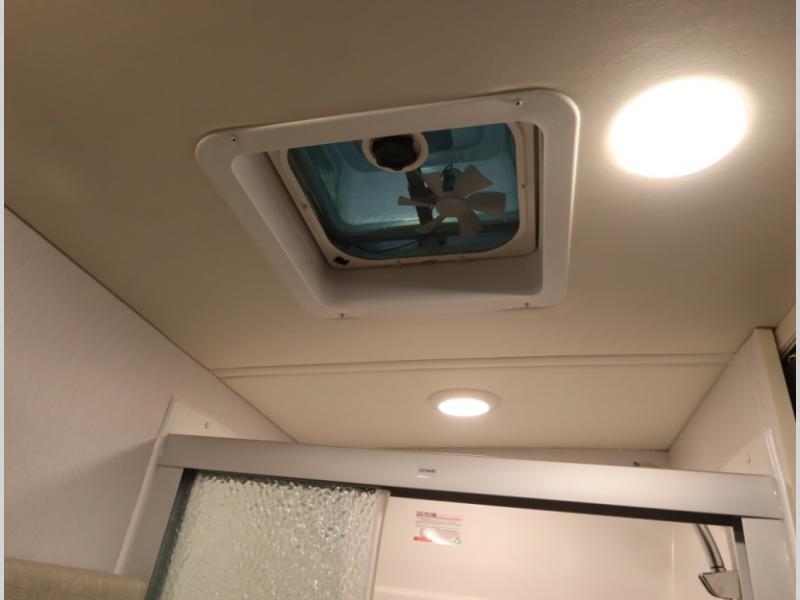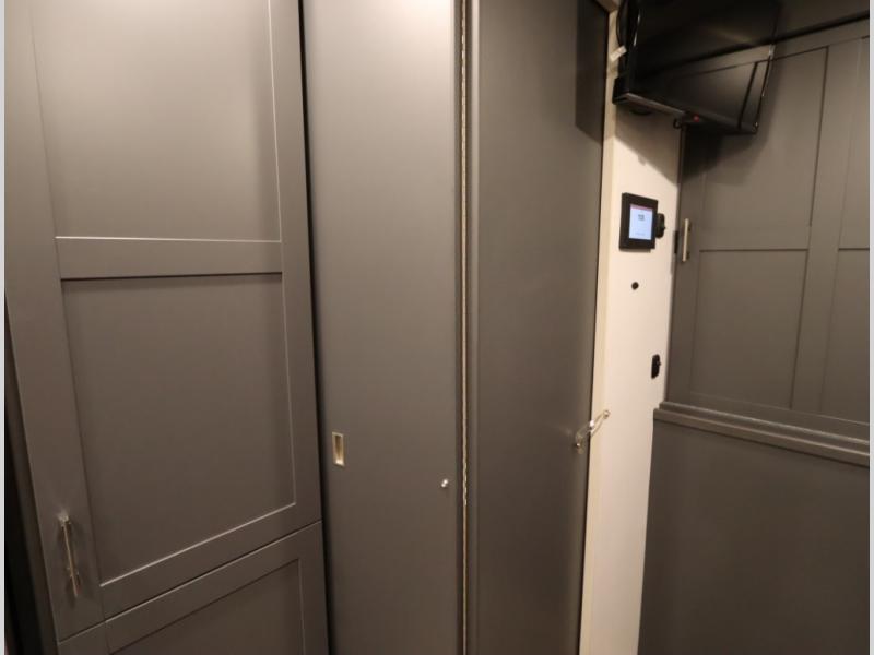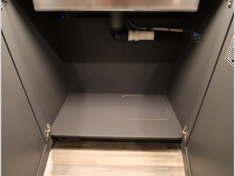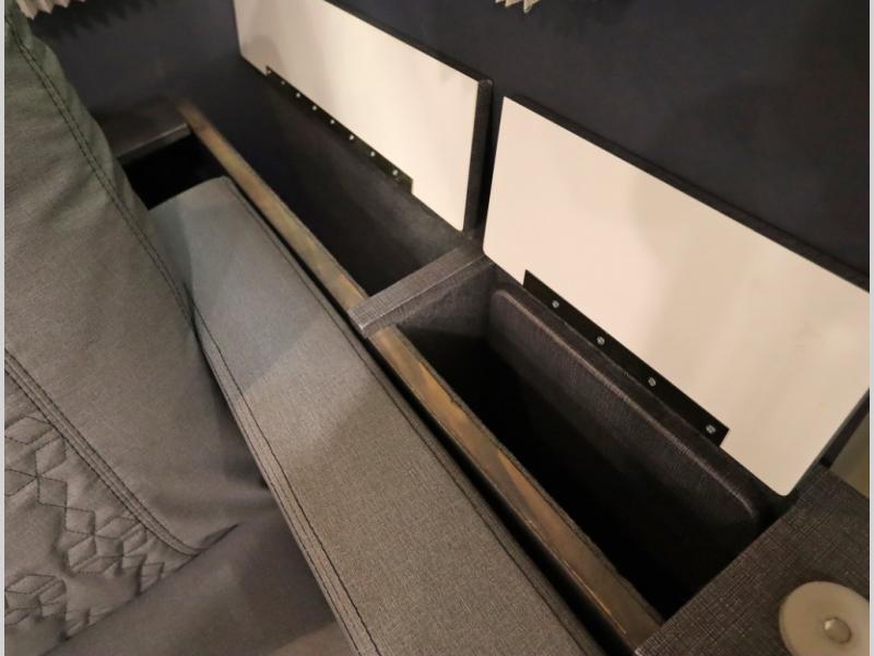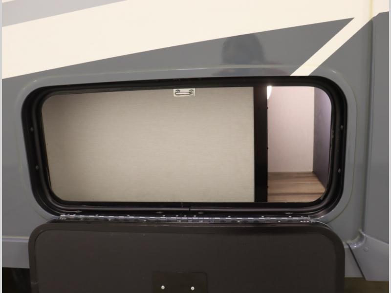 The Winnebago Cambria 25P features a full wall slideout with a powered King Murphy bed, in which bedding can be left on to quickly convert to a sofa, located rearward of the premium home theater lounge area with heat and massage seating. Incredible rear wardrobe storage with an oversized bath in one rearward of a spacious in line galley with upscale amenities such as solid surface countertops and European designed cabinetry.