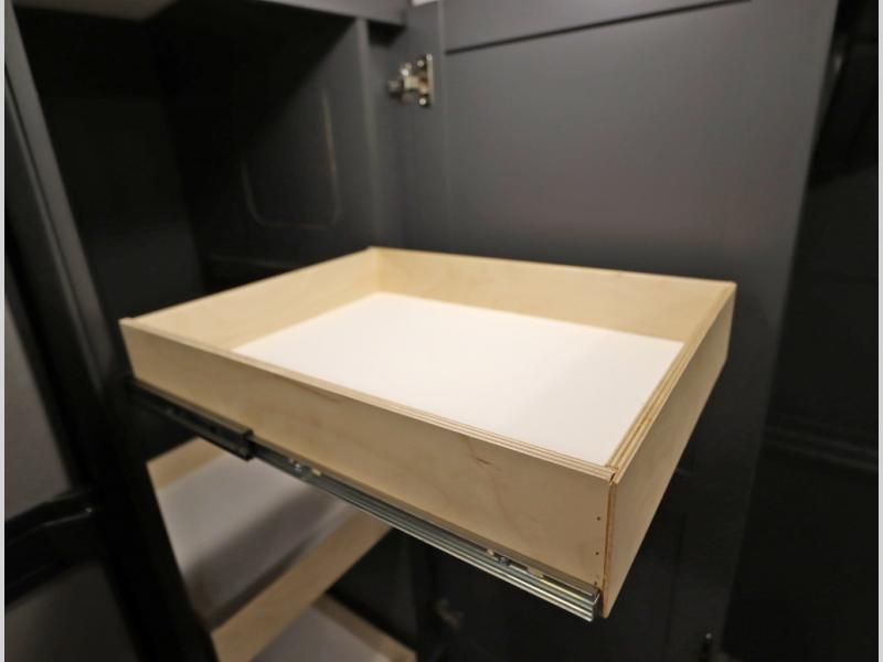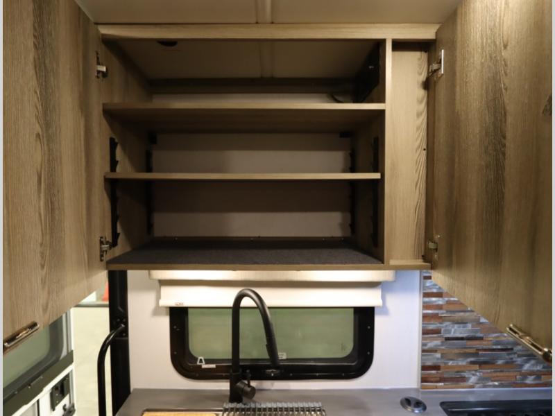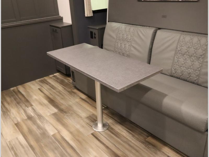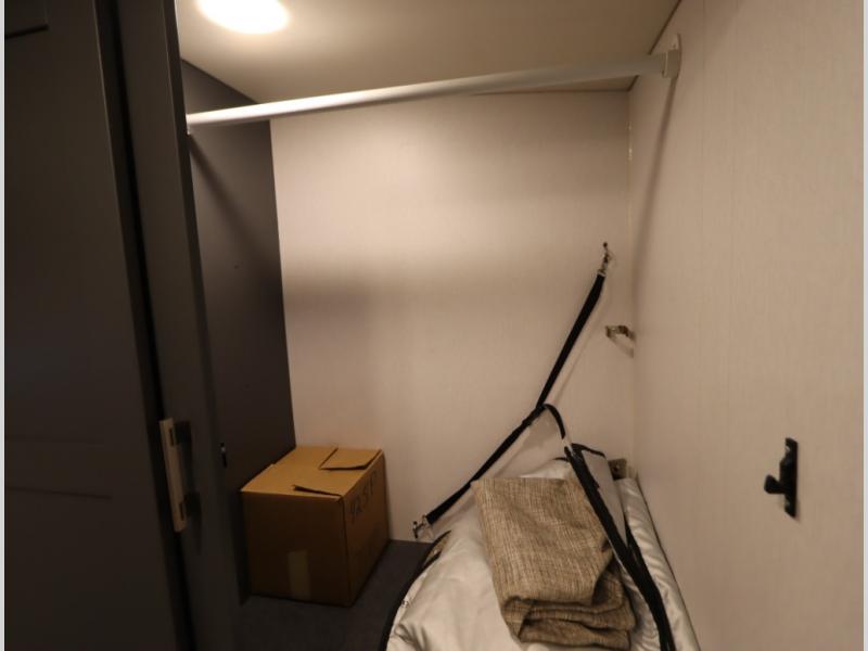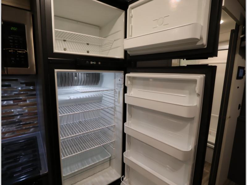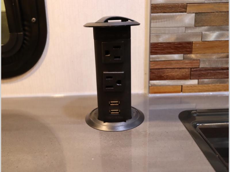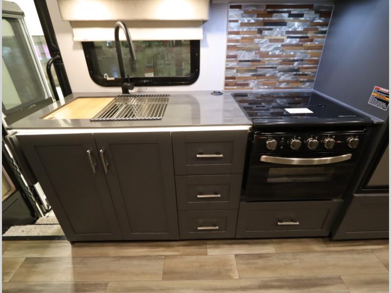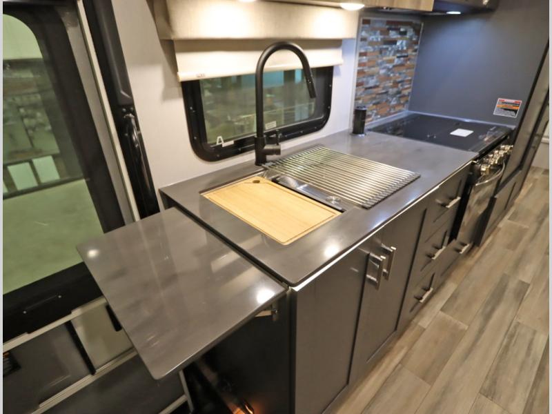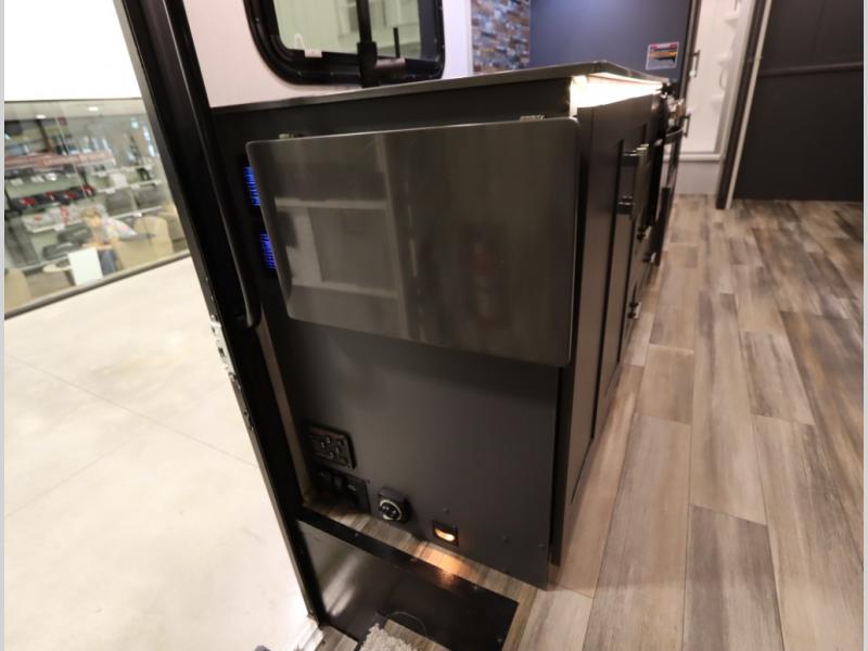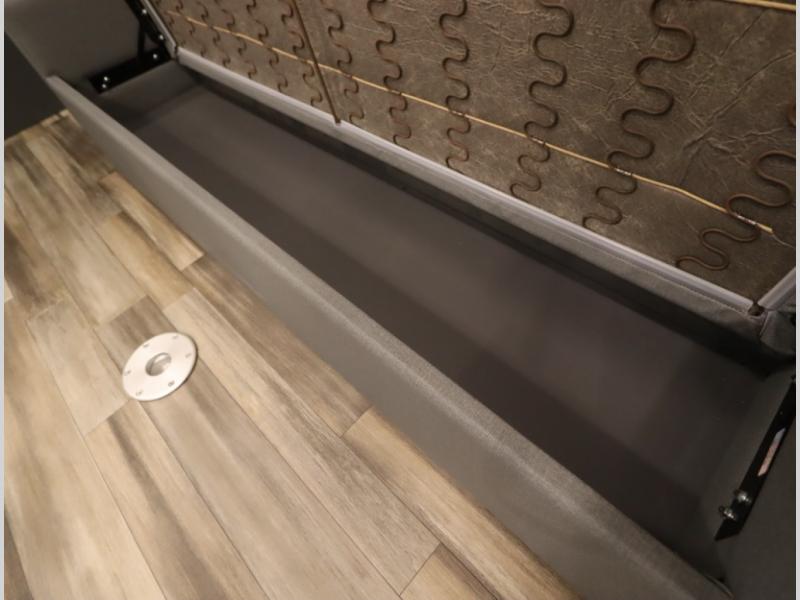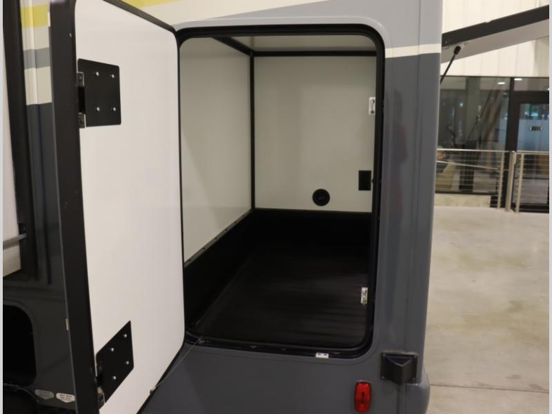 The Winnebago Cambria 25P features a full wall slideout with a powered King Murphy bed, in which bedding can be left on to quickly convert to a sofa, located rearward of the premium home theater lounge area with heat and massage seating. Incredible rear wardrobe storage with an oversized bath in one rearward of a spacious in line galley with upscale amenities such as solid surface countertops and European designed cabinetry.