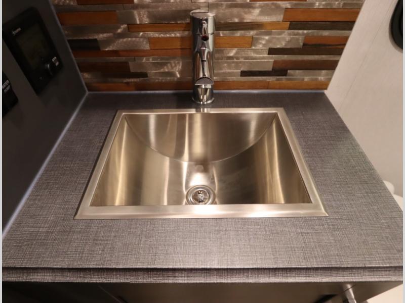 g. Solid surface countertops with under mounted stainless steel sink