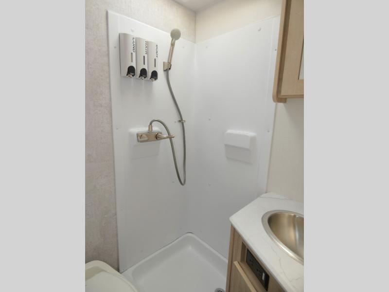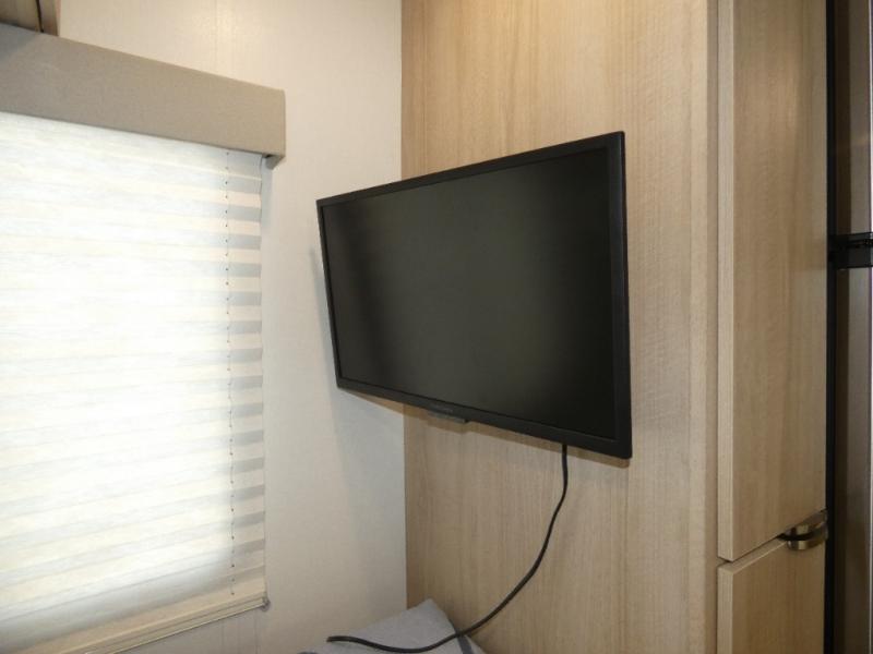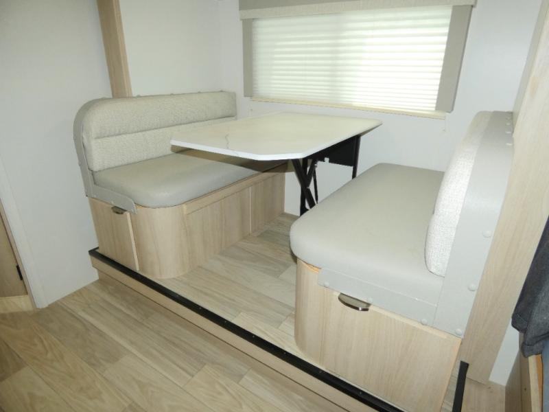 Don't pass your chance to camp comfortably with your spouse in this travel trailer! Up front there is a 60" x 74" RV queen bed with a divider curtain for privacy at night. Scramble up some eggs with the three burner cooktop and grab a cup of orange juice from the 10.3 cu. ft. refrigerator then head to the 44" x 72" booth dinette slide to enjoy your meal. The dinette can also transforms into an extra sleeping space if you want a tag along guest. Everyone can freshen up in the rear corner bathroom and watch their favorite movies on the LED TV!