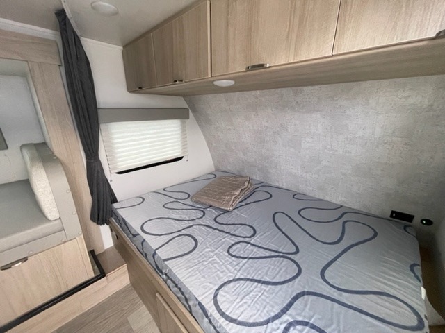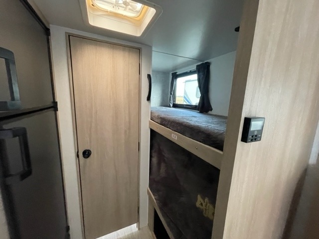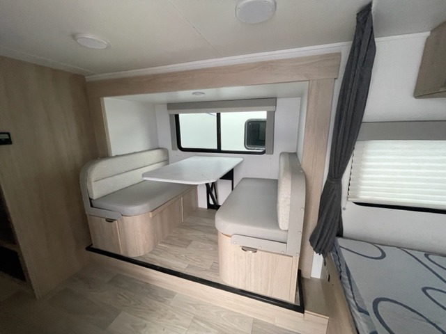 Get ready for a fun family weekend in the great outdoors with this trailer only steps away to enjoy inside comforts! The cook will love having everything to make warm meals, and can easily store leftovers in the double refrigerator, plus the flip-up counter gives them more space to prep or dry the dishes. The front 54" x 74" full bed has a divider curtain for privacy at night and the rear corner 28" x 72" bunk beds are conveniently next to the private toilet and shower room. The booth dinette slide gives you a place to dine as well as sleep one more person, plus you will love the extra floor space that it provides. You might like to choose the EZ Glide Sofa Sleeper and table option in its place, the option is yours!