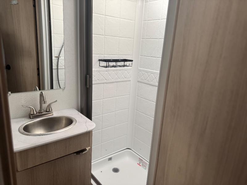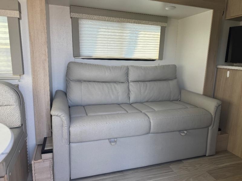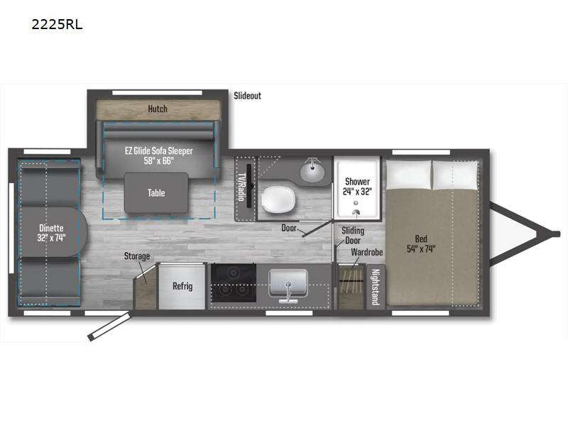 This is a perfect couples trailer as well as family RV if you utilize the furniture as sleeping space! The rear 32" x 74" dinette is a great place to enjoy your meals, play some card games, and even transform into an extra sleeping space for one. You can take an afternoon nap on the EZ Glide Sofa Sleeper or watch your favorite movie on the LED TV if mother nature rains on your parade. Start each morning feeling fresh after sleeping on the 54" x 74" full bed and enjoy cross ventilation from the windows on both sides. Take the fun outside with patio speakers and a power awning with LED lighting!