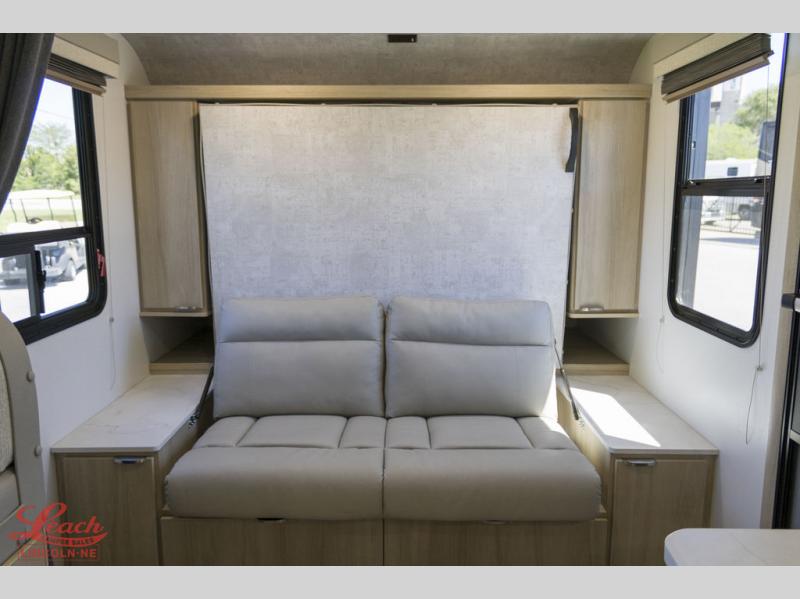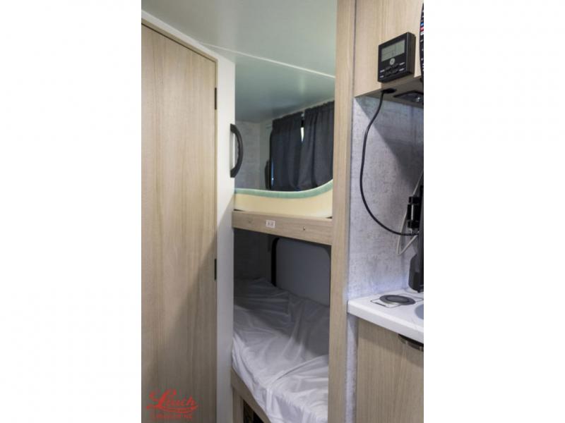 Load your kids into this travel trailer and experience a fun family getaway! The front Murphy bed offers versatile living by transforming into a 54" x 74" bed to sleep on at night and a sofa to sit on during the day. The 44" x 72" booth dinette slide is a great place to enjoy your meals, play games as a family, and even transform into an extra sleeping space if your kids want a friend to tag along. The kids will love sleeping on the rear corner 28" x 72" bunk beds and having the rear corner bathroom right next to them. As if that wasn't enough, there is an exterior pack-n-play door, a power awning with LED lighting, and patio speakers to crank up the tunes!