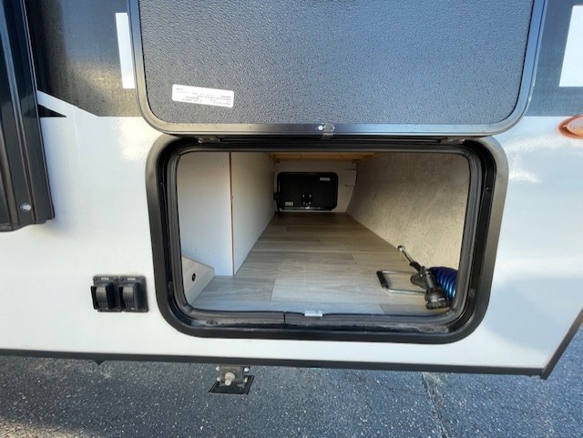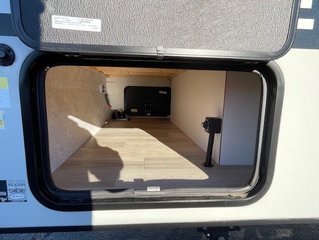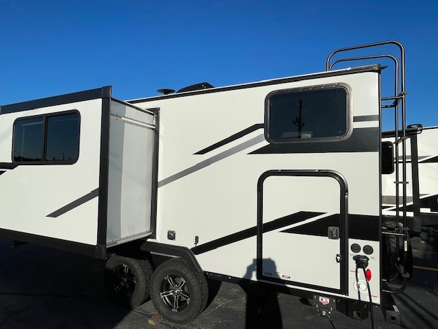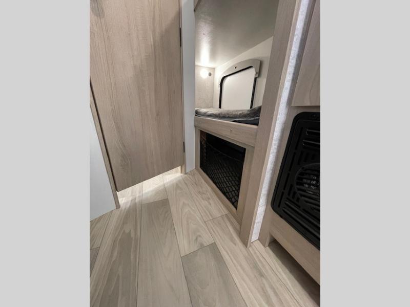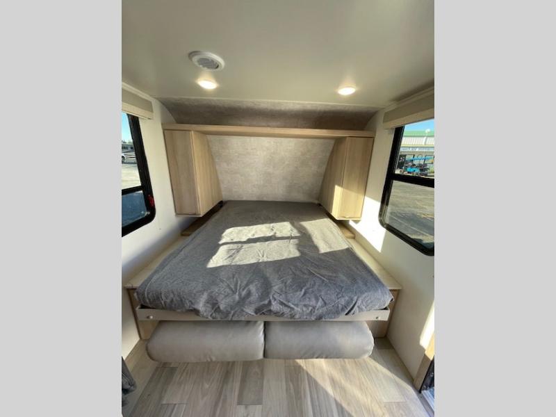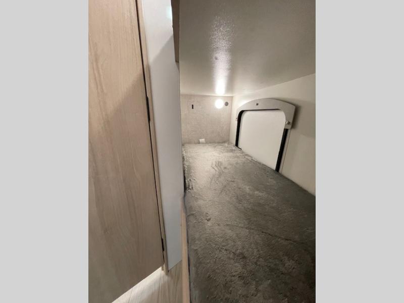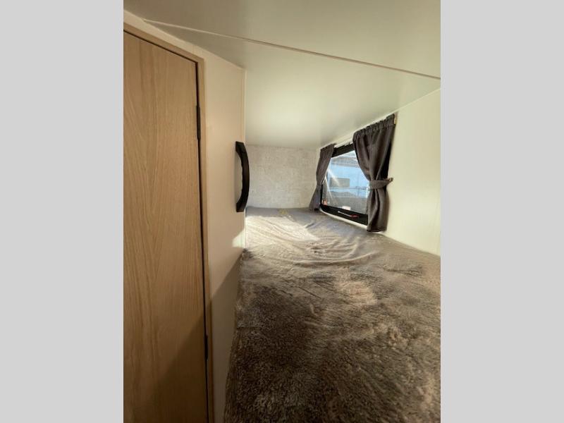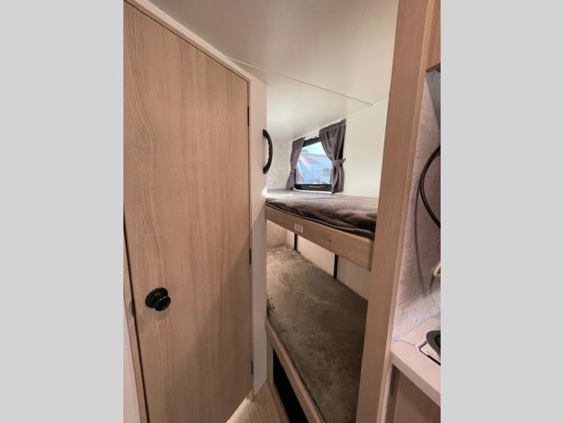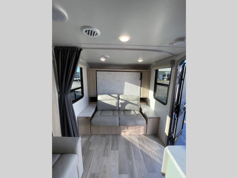 Load your kids into this travel trailer and experience a fun family getaway! The front Murphy bed offers versatile living by transforming into a 54" x 74" bed to sleep on at night and a sofa to sit on during the day. The 44" x 72" booth dinette slide is a great place to enjoy your meals, play games as a family, and even transform into an extra sleeping space if your kids want a friend to tag along. The kids will love sleeping on the rear corner 28" x 72" bunk beds and having the rear corner bathroom right next to them. As if that wasn't enough, there is an exterior pack-n-play door, a power awning with LED lighting, and patio speakers to crank up the tunes!