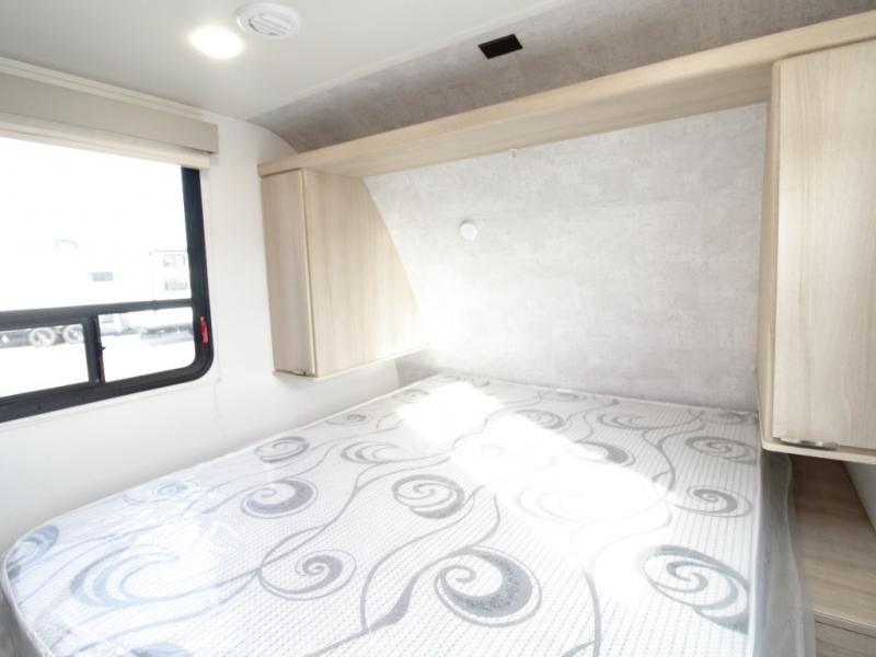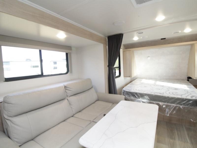 The front sleeping area includes an RV queen bed, a wardrobe, and a nightstand, all easily closed off with a privacy curtain for separation from the main living area. The sofa in the slide-out adds elbow room for dining, working, or relaxing, and it can convert into an extra sleeping space when needed.