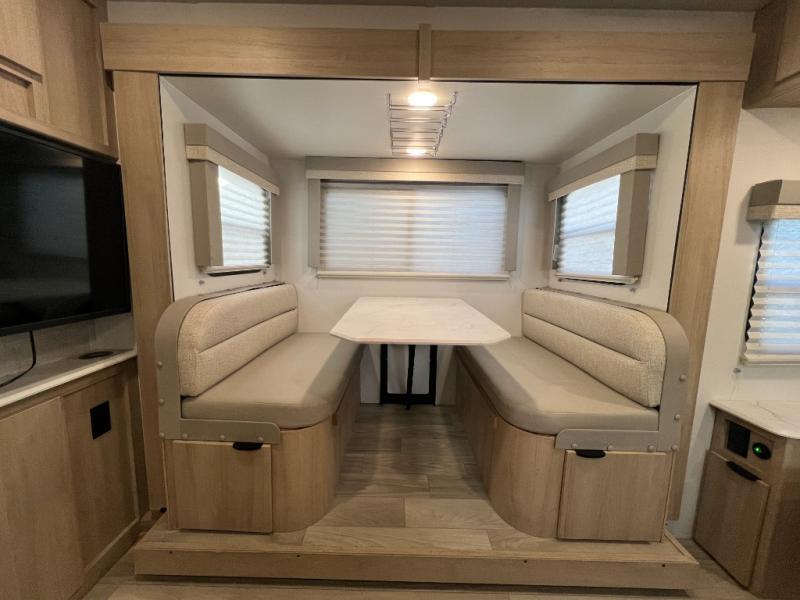 Dual entry doors will provide a smooth flow of traffic in and out of this cozy travel trailer, so come take a look! The front living area includes a tri-fold sofa with two end tables/cabinets, a booth dinette slide out, and a Smart TV to watch your favorite shows. There are two pantries for added storage and a flip-up counter in the kitchen for extra counter space. This model includes a full bath to clean up each day, and a wardrobe right across the hall to store towels. And check out the rear private bedroom with a queen bed, dual wardrobes and nightstands, and its own exterior entry door for convenience!