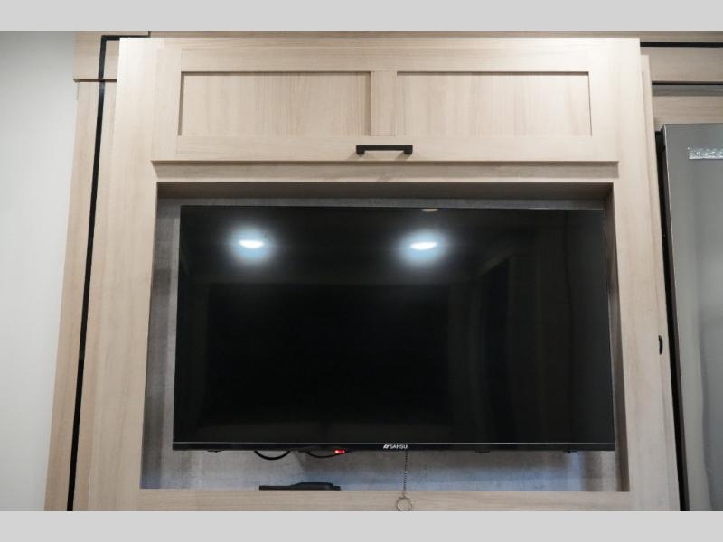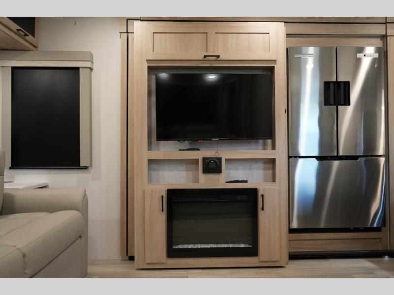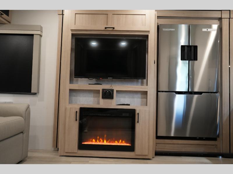 Kick back in style while enjoying a warm fire and your favorite shows on the LED TV with a hidden pantry tucked neatly behind the entertainment center. -