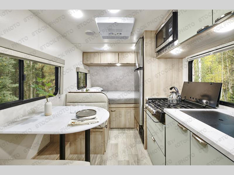 You will love this efficient floorplan that has everything you need! The front 60" x 74" bed provides a great place to sleep after a long day of adventure. The galley kitchen is well-equipped for meals and includes a flip-up counter extension that will expand your work space or can be stowed away for more room. A pantry cabinet provides additional storage space. After cooking, you can enjoy dining at the spacious 74" x 32" dinette. A rear corner bath with angled entry door fits in a roomy 24" x 36" shower plus a fold down sink.