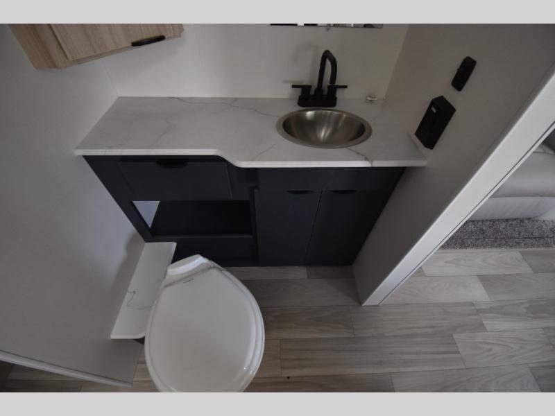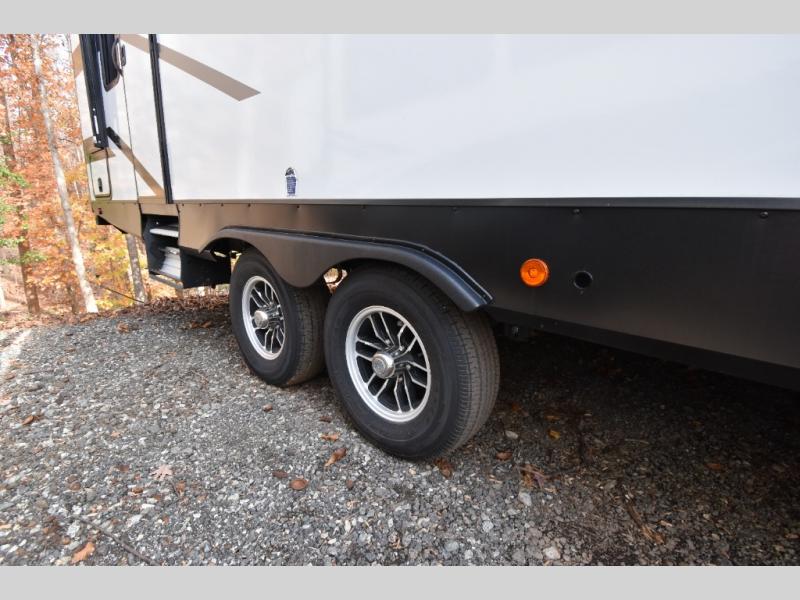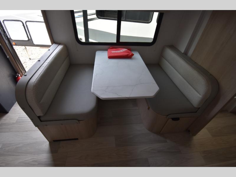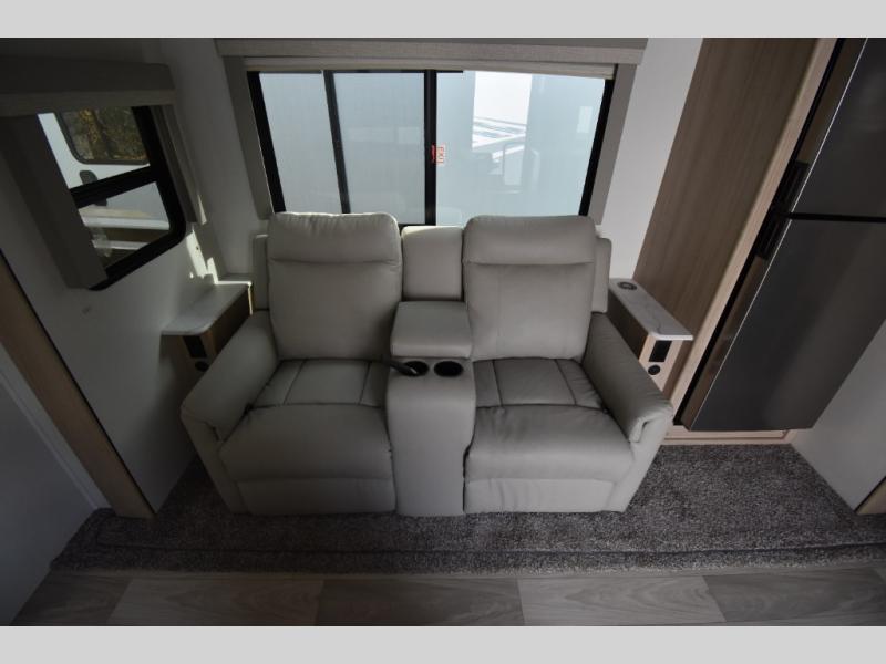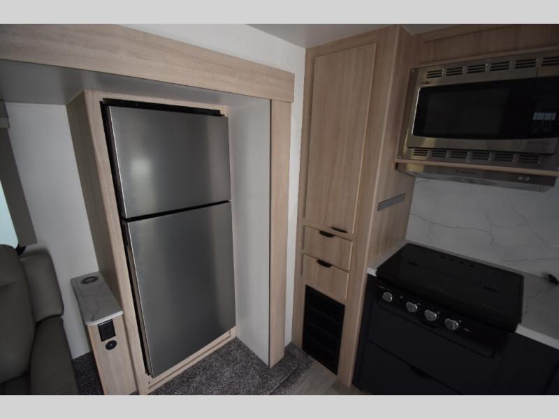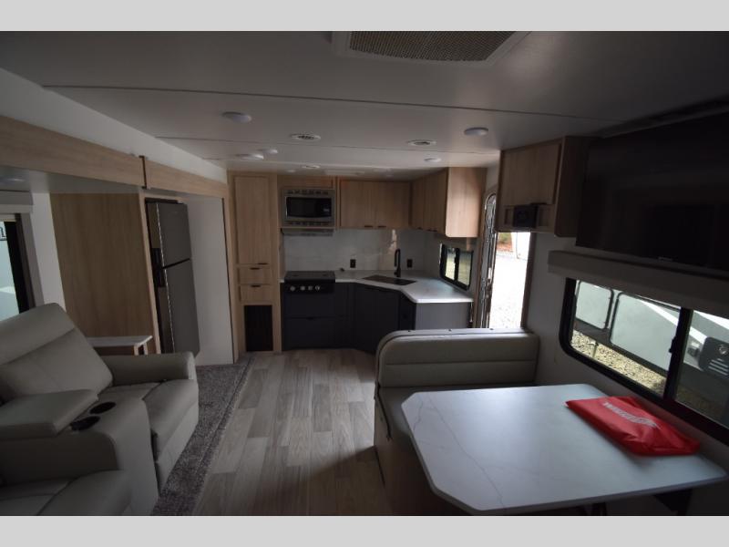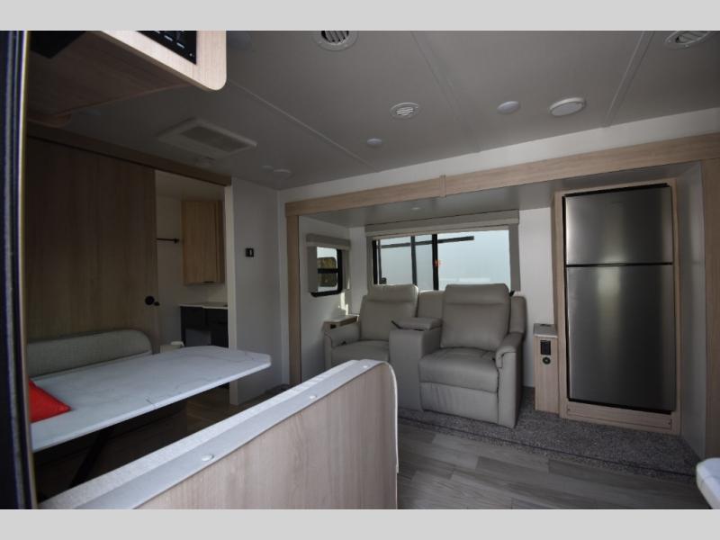 You're going to love this spacious travel trailer thanks to the tri-fold sofa slide out! There are convenient dual entry doors so you can enter in through the rear master bedroom or the front kitchen. The chef of your group is sure to appreciate ample counter space to prep meals, plus a pantry and 10 cu. ft. 12V refrigerator for food storage. Your crew can dine at the booth dinette or take your plate outdoors to sit under the 21' power awning with LED lights. Clean up in the walk-through bath before retreating to your queen bed in the rear bedroom, while your guests sleep on the furniture in the main living area!