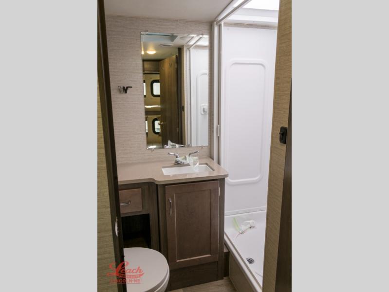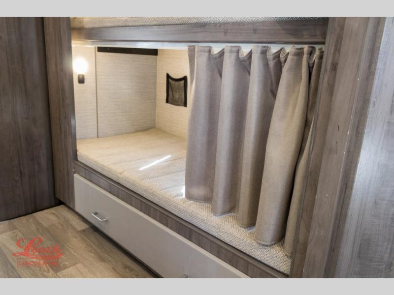 Enjoy plenty of walking around space with two slides in this motorhome! The kids will love having a set of 30" x 73" bunk beds to sleep on at night and there is also a 57" x 95" bunk over cab, a 40" x 70" sofa bed, and a 45" x 74" U-shaped dinette that can be transformed for more friends to tag along. If you don't need that much sleeping space then you could switch out the sofa bed for the optional theater seating. The rear private bedroom has a 60" x 75" queen bed with shirt closets and nightstands on either side, a wardrobe, and a chest of drawers with a TV location for your entertainment. Everyone can stay squeaky clean with the 26" x 38" shower with a skylight for added headroom and natural lighting in the full bathroom!