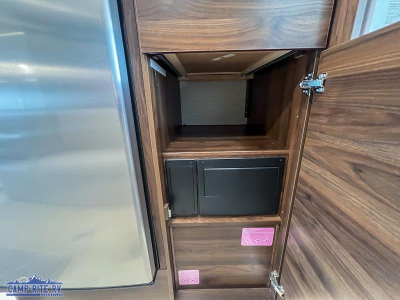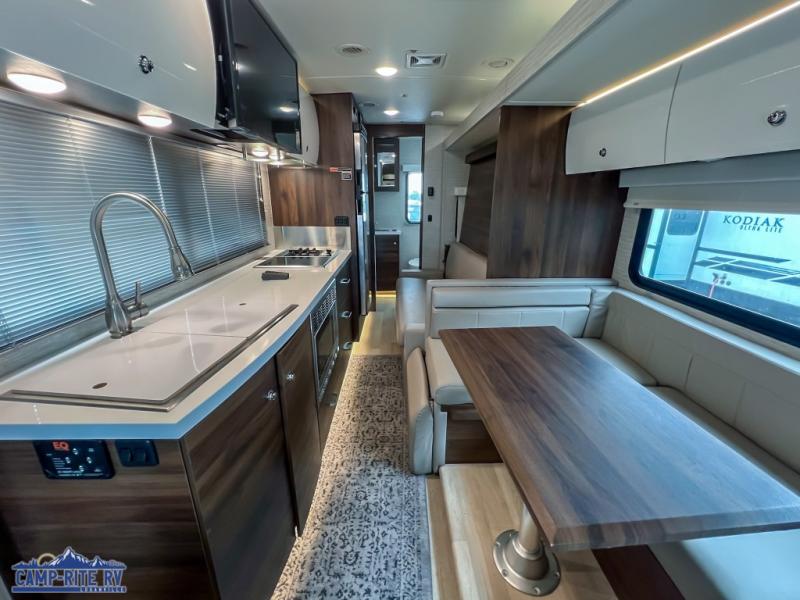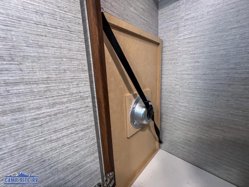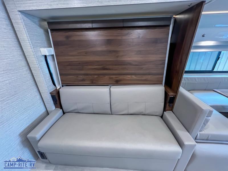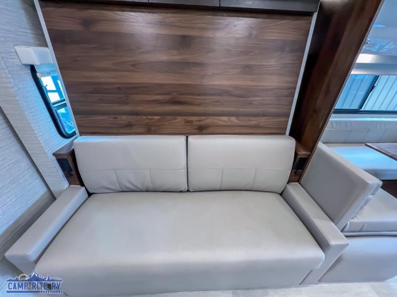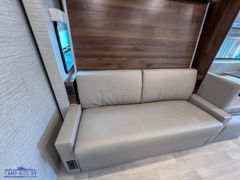 This family-friendly coach offers sleeping space for six when you utilize the Murphy Bed, the cabover bunk and the U-shaped dinette with footrests as sleeping space! Now you might have decided to add the theater seating option, the choice is yours. During the day, the sofa easily replaces the Murphy bed so you can dine at the pedestal table that you grabbed from the front area's location. The heated power control cab seats include armrests, adjustable lumbar support, headrest, recline, slide and manual swivel functions giving you ultimate comfort on the road and while at your RV spot. The cook will love having a galley kitchen with a microwave/convection oven and 12V compressor refrigerator/freezer to keep everyone fed.