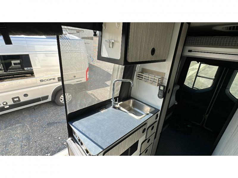 The Revel Class B diesel motorhome allows you to venture off-road thanks to the On-Demand 4WD with Hi/Lo range, electronic stability and traction control, plus 4-wheel ABS brakes. The 320-amp-hour lithium-ion battery is charged via solar, or the dedicated second alternator, plus you have a 2,000-watt inverter/charger. The exterior offers a side screen door with a magnetic closure system, a rear screen door with a blackout panel, and a luggage rack. The interior provides a laminate countertop in the galley, full-extension drawers, USB charging points, heavy-duty vinyl flooring throughout for easy cleaning, and RAM Tough-Track mounts to help secure your belongings. Start treating roads like suggestions, choose this Revel today!