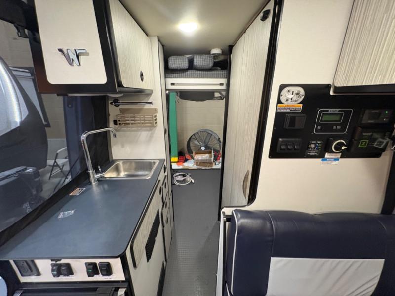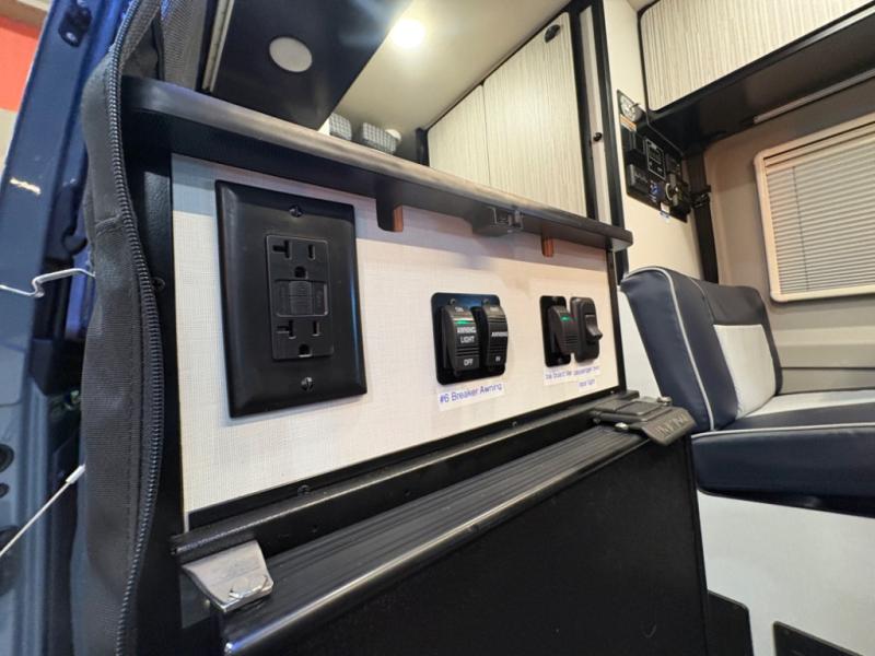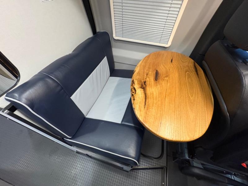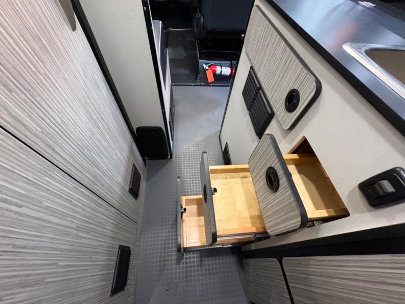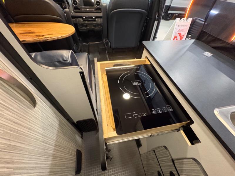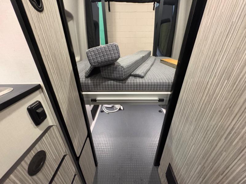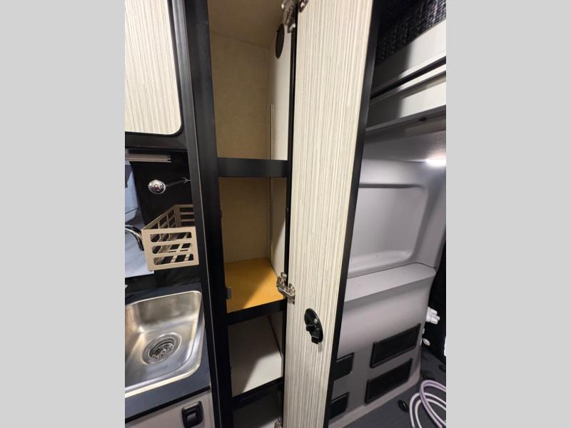 Living small doesn’t mean sacrificing comfort. The kitchen area includes a two-burner cooktop, refrigerator, deep sink with pull-out faucet, and plenty of counter space, making meals on the road a breeze. A well-appointed wet bath with a shower and cassette toilet adds convenience most vans can’t match.