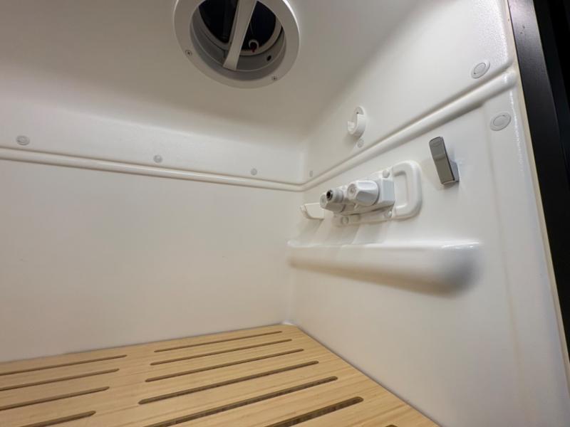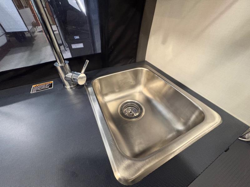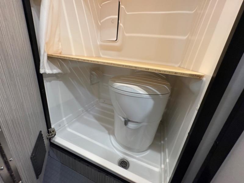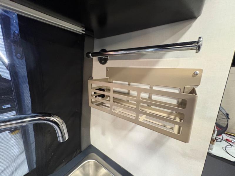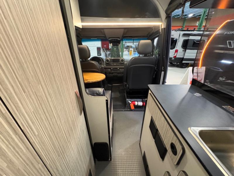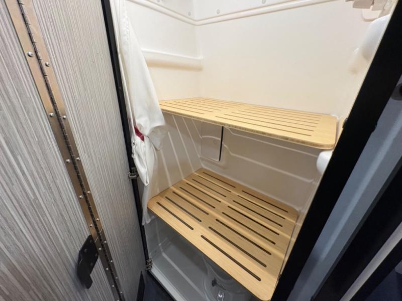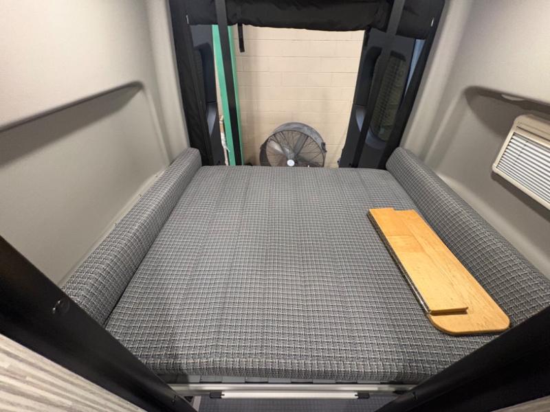 Living small doesn’t mean sacrificing comfort. The kitchen area includes a two-burner cooktop, refrigerator, deep sink with pull-out faucet, and plenty of counter space, making meals on the road a breeze. A well-appointed wet bath with a shower and cassette toilet adds convenience most vans can’t match.