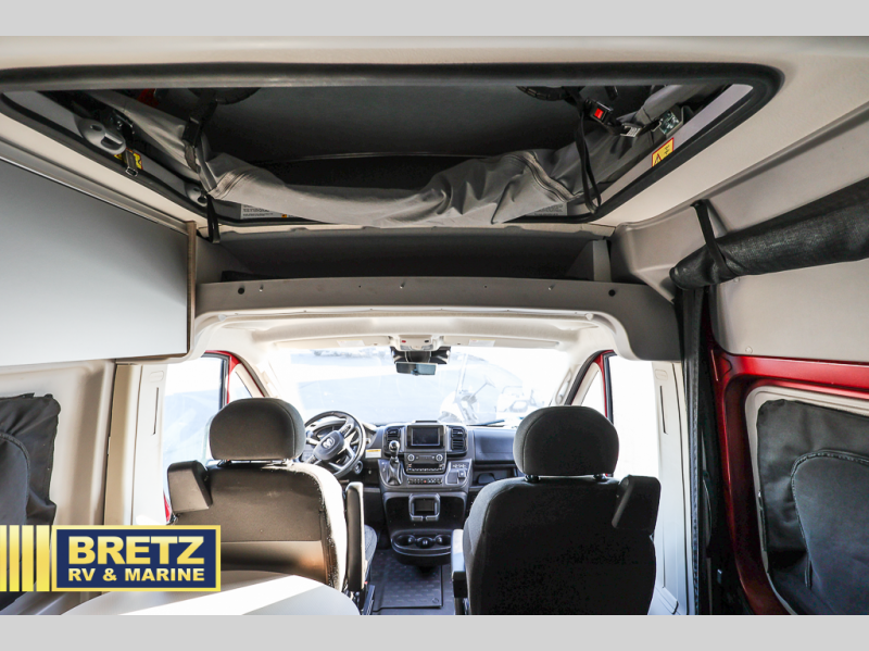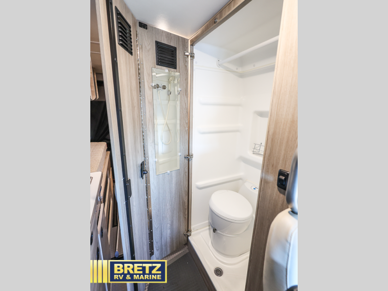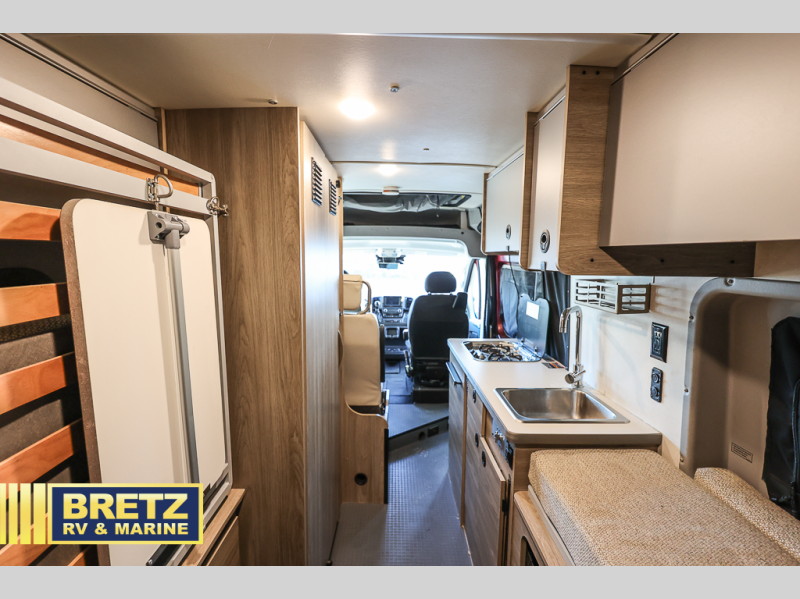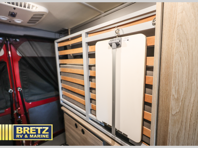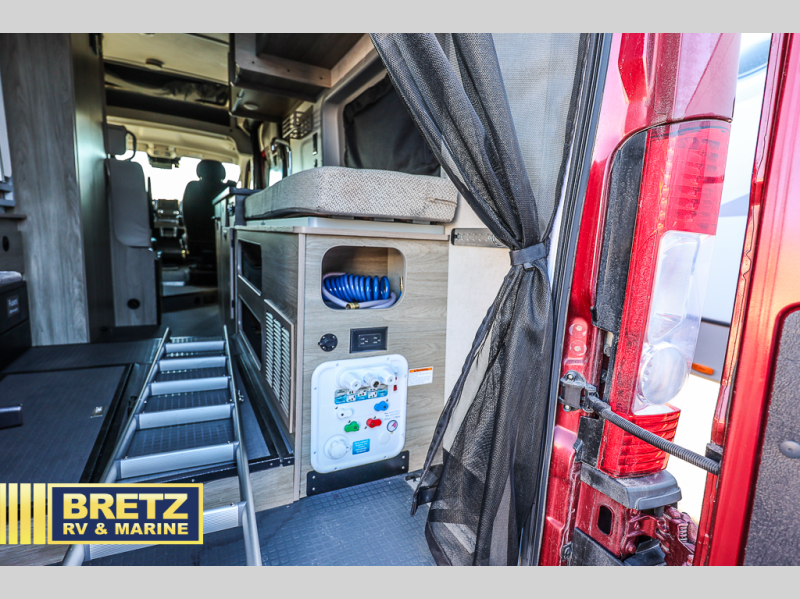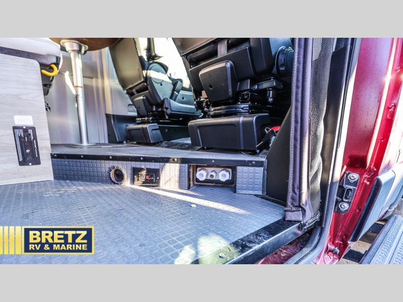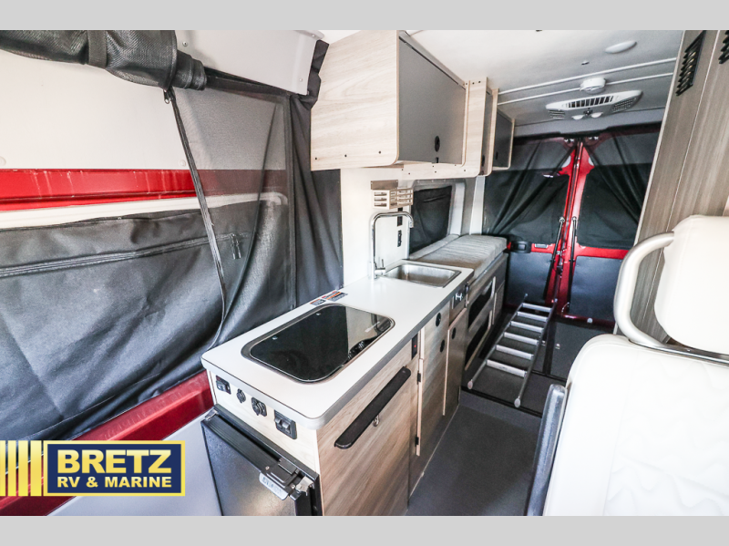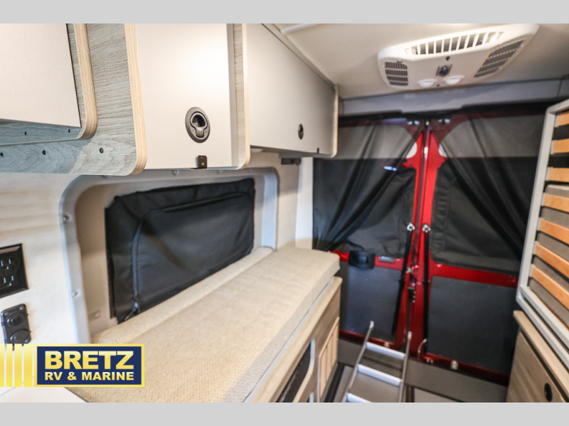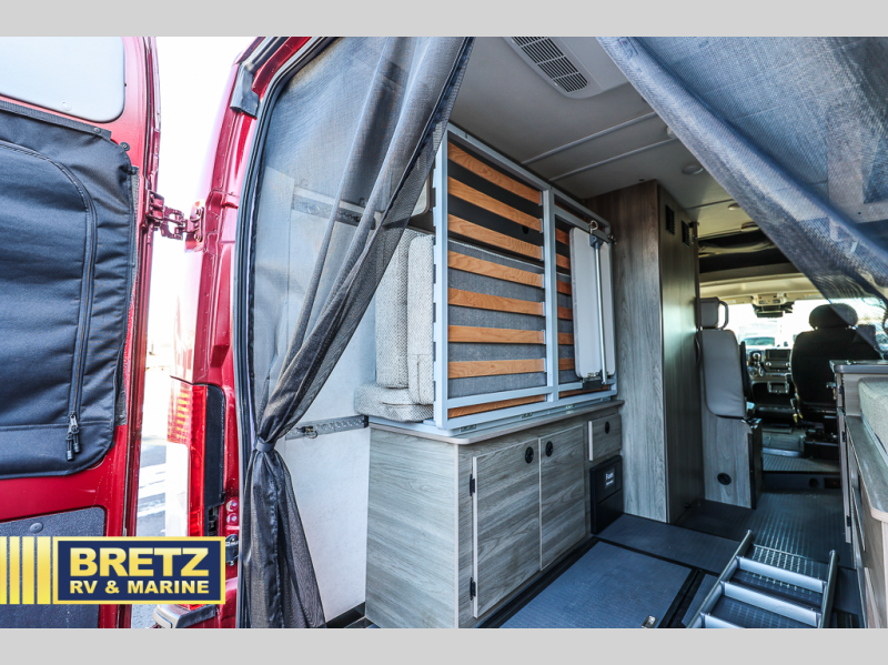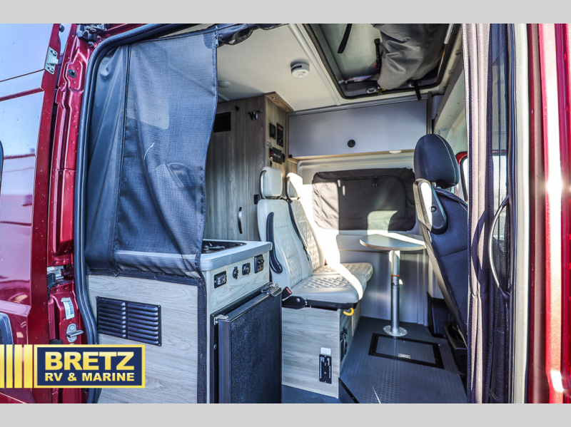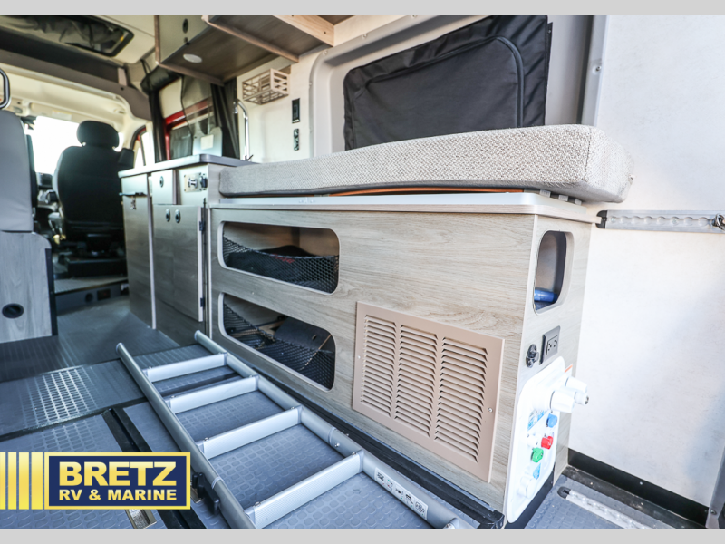 This camper van with an L-track storage system is perfect for those needing more storage space for their hiking and biking gear. You can stay powered up with the Cummins Onan QG 2800i gas generator, and there is a Coleman Mach 10NDQ A/C with directional vents that will allow you to come inside to cool off after a trail ride. A Murphy+ bed comes standard, or you can choose the optional sofa/bed, and any guests that tag along can sleep in the pop-top sleeping area! You'll find the wet bath to come in handy when you want to clean up, and the dinette seating with a removable pedestal table will provide a place to enjoy your dinner at.