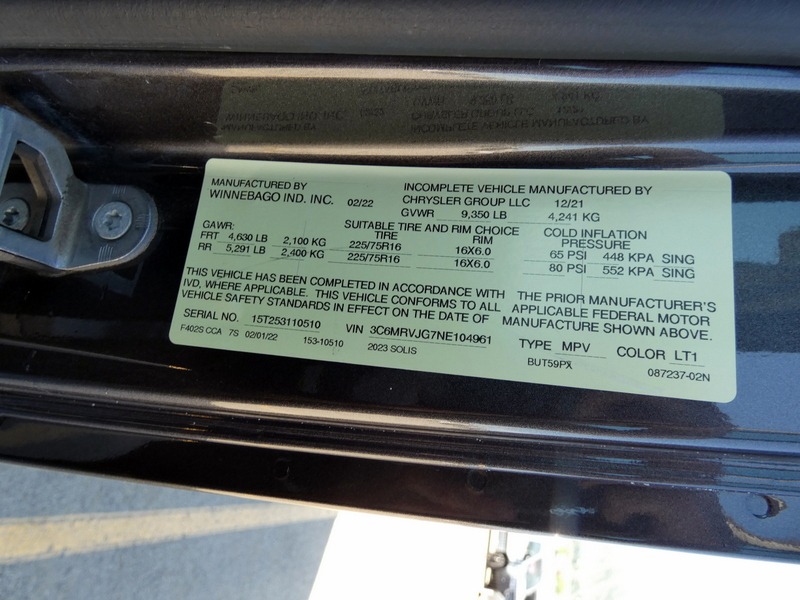Each Solis Class B gas motorhome by Winnebago sits upon a fuel-efficient Ram ProMaster chassis with a 3.6L V6 engine to power your adventures. You will love the cab conveniences that make each trip enjoyable, like the digital review mirror, the radio/review monitor system touchscreen, and the crosswind assist to keep you steady on the road. Some of the hassle-free amenities you will appreciate are the exterior wash station, the Eco-Hot water system, and the water center control panel located inside the right rear door. Head indoors to find heavy-duty vinyl flooring throughout, a laminate countertop and a stainless steel sink in the galley, plus tinted coach windows for added privacy. The Solis also features off-grid capabilities with its two deep-cycle Group 31 batteries and 220-watt flexible surface solar panel with a controller. Adventures awaits in the Solis Class B gas motorhome!