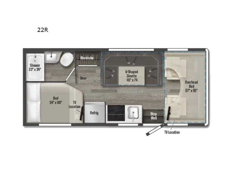 This compact, yet efficient coach is perfect for trips across the states or weekends by the river. Unload your gear from the lighted trunk storage, then set up the 14' power awning with LED lights. Once you head inside you can make lunch on the three burner cooktop, and dine around the U-shaped dinette. There is a 32" HDTV with a DVD player if you want to stay in and watch a movie, or you can head outdoors to find a trail. The full bath will allow you to freshen up after your day, and the double bed is sure to bring comfort. Your guests will find themselves a cozy spot on the cabover bunk and on the U-shaped dinette once it's set up for the night.