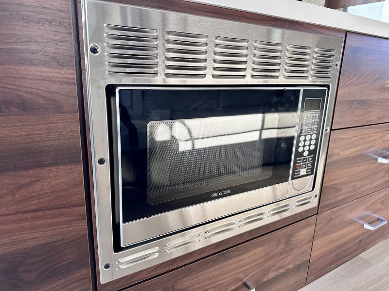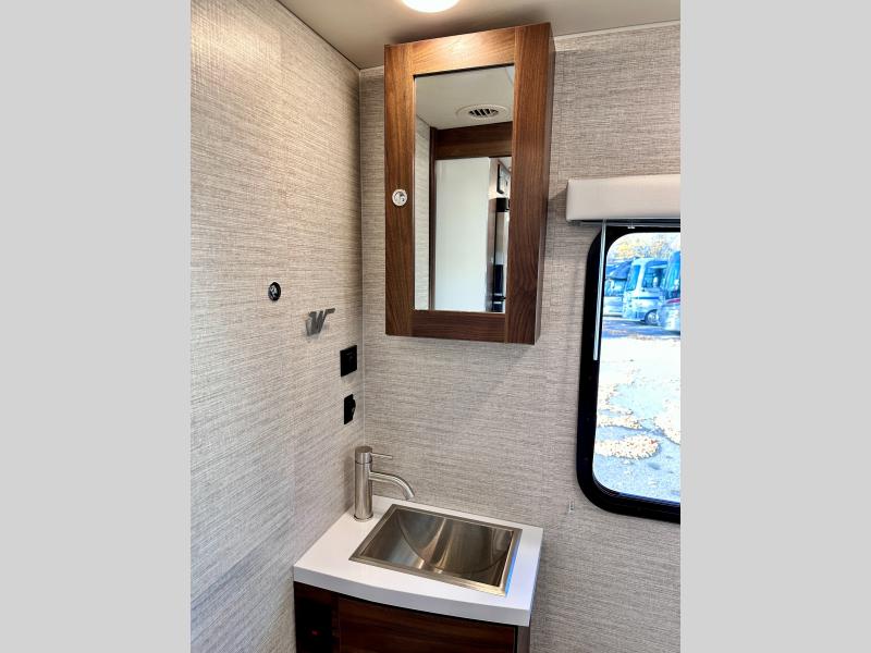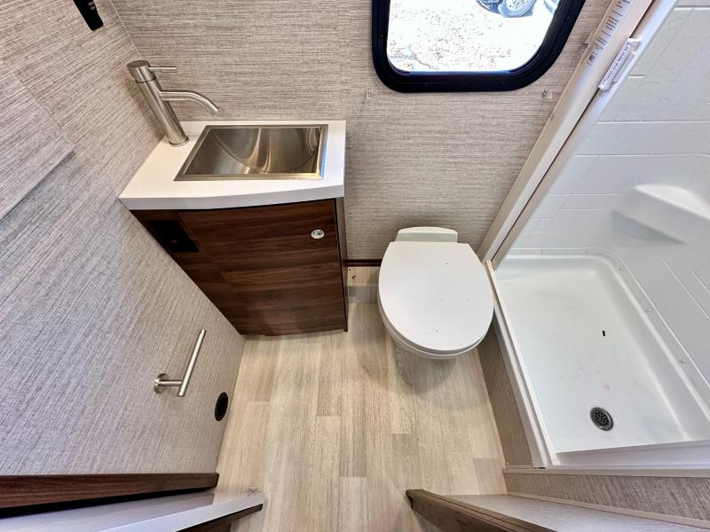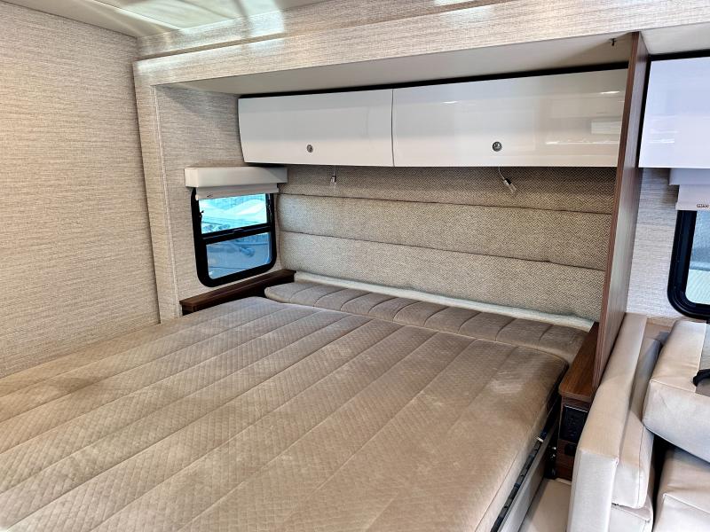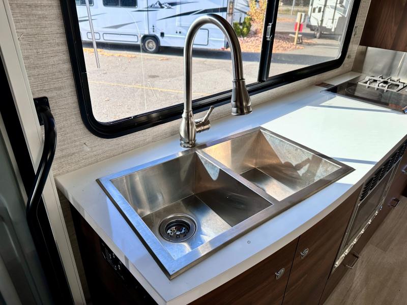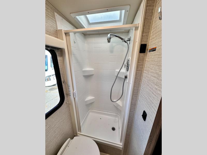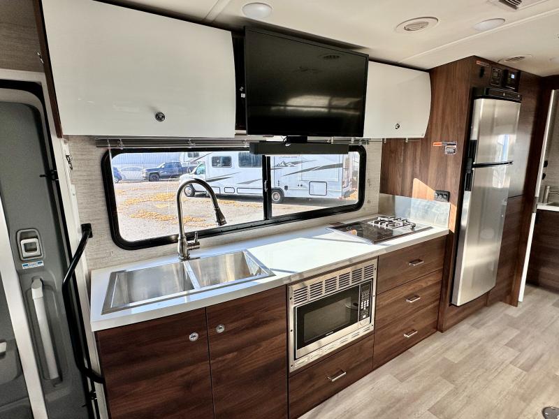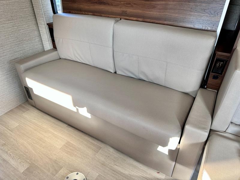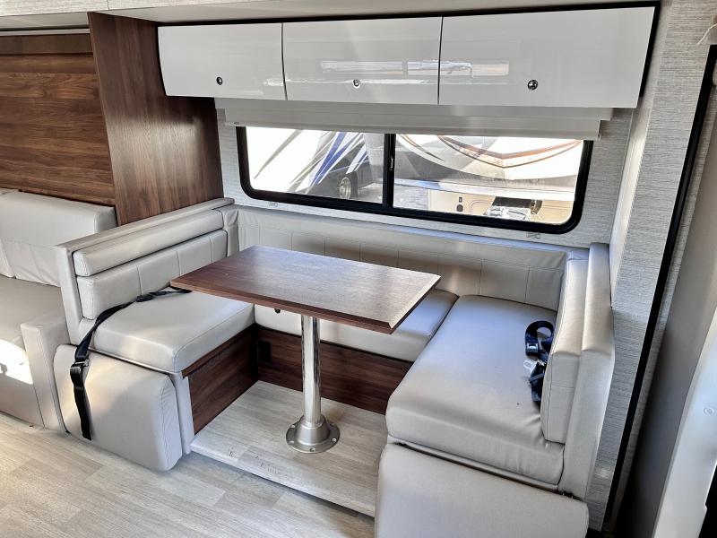 A couple or family will enjoy the look of the interior each time they take this View Class C diesel motorhome on the road. With the curved cabinets, the lighted soft-close galley drawers, and the sprung-cushion dinette and sofa seats, there will surely be a favorite feature for everyone. You will be able to easily set up the queen Murphy+ bed when it's time for bedtime while the kids sleep on the bunk above the cab or the U-shaped dinette. You might like to add the theater seating option with swivel tables if you don't need that extra sleeping space. Everyone can get cleaned up in the full rear bathroom that has a space-saving sliding door before making meals with full kitchen amenities including a convection microwave/oven.