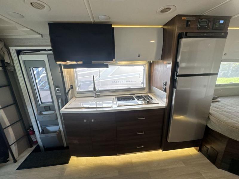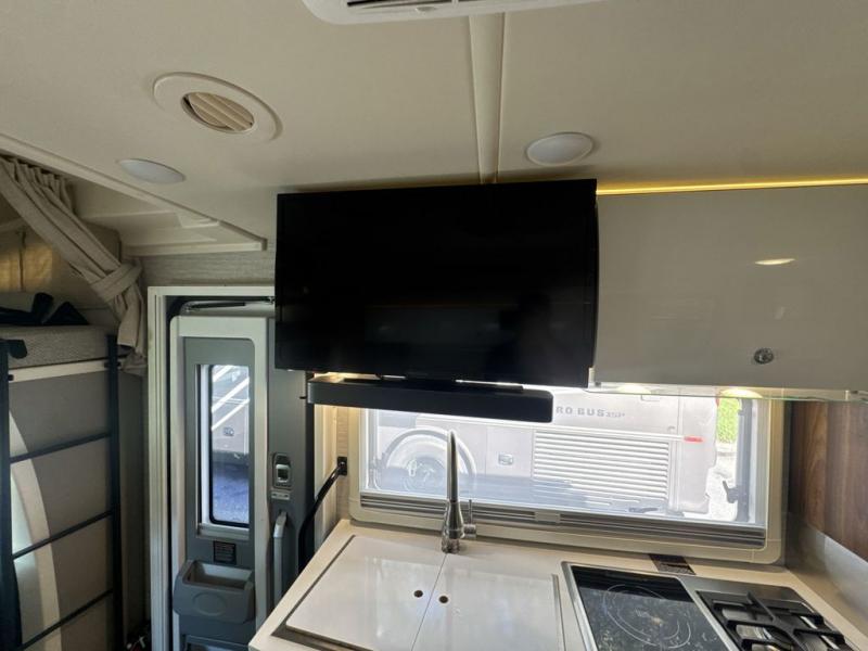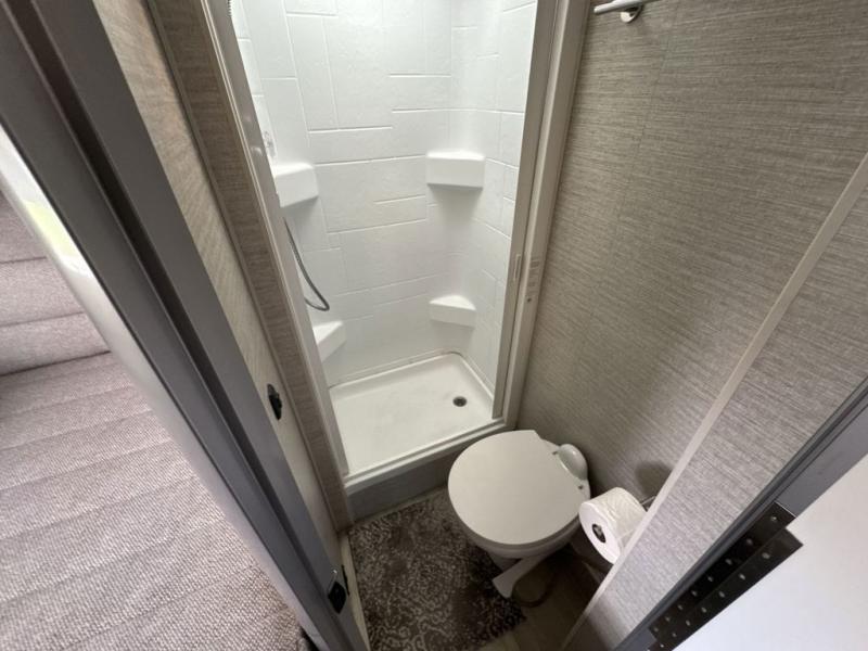 Your family will enjoy seeing the views riding down the road in this View Class C diesel motorhome. The kids can play games at the U-shaped dinette that has three seatbelts, and once at your destination, the dinette footrests may come in handy. The driver and passenger will enjoy the heated, power cab seats that can swivel for more seating. Everyone will enjoy the look and convenience of the curved cabinets, the lighted soft-close galley drawers, and the sprung-cushion dinette seats. The cross-coach storage holds larger items, and the above-bed Anything Keeper storage stows things away such as your cellphone. You might like to add the theater seating option with swivel tables in place of the U-shaped dinette if you don't need that extra sleeping space. The cook will appreciate the kitchen appliances to make meals, and the bathroom has the bath sink just outside the door.