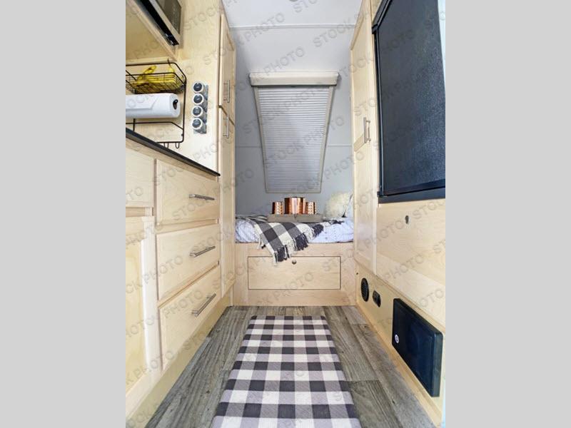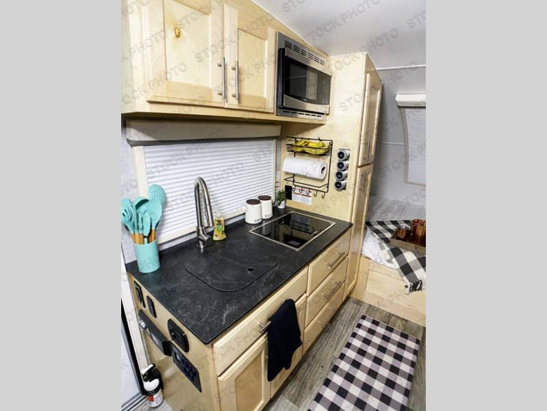 This Little Guy teardrop trailer has an impressive 6' 7" interior height, so even though your trailer is little, you don't have to be little to enjoy it. The large pass-through storage compartment gives you more space to bring along extra gear, and the 2" rear receiver can hold bike racks or storage racks. The exterior entertainment center comes with a TV mount, two 5" outdoor speakers, and HDMI, Coax, and power outlets. The kitchen has a microwave and two-burner stove, so you'll never go hungry, and the dinette can turn into a bed for one other person. If you add the optional Rough Rider Package, you can get 15" off-road tires and wheels and a 2.5" axle riser for added clearance.