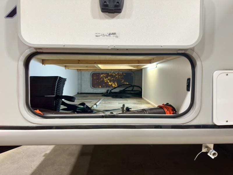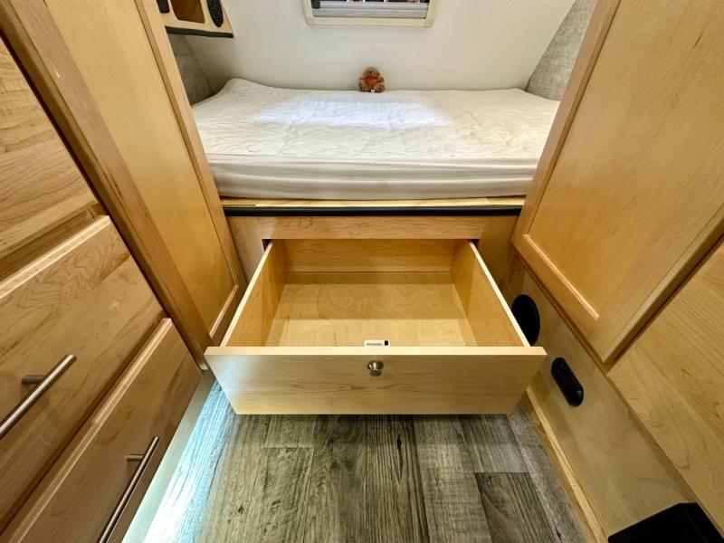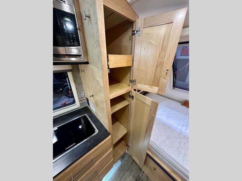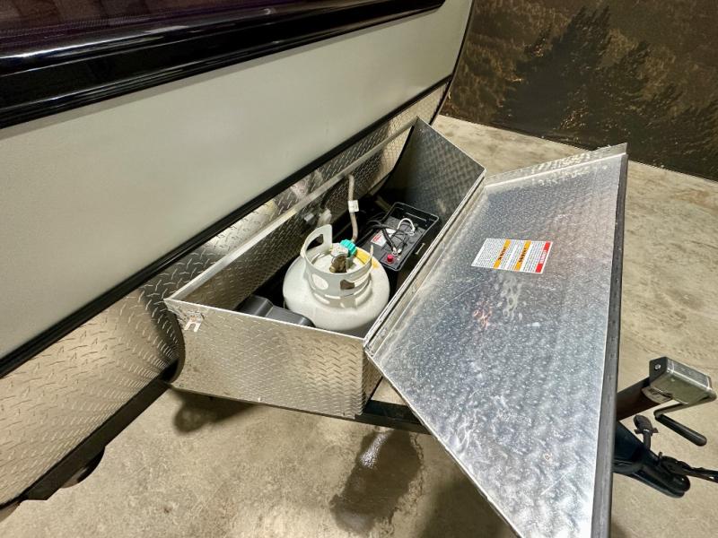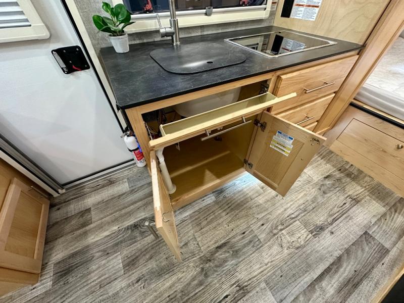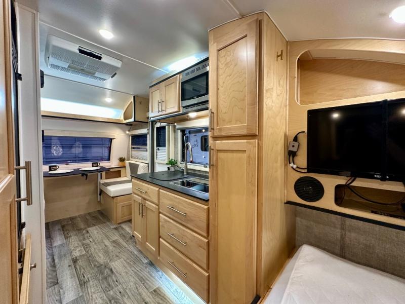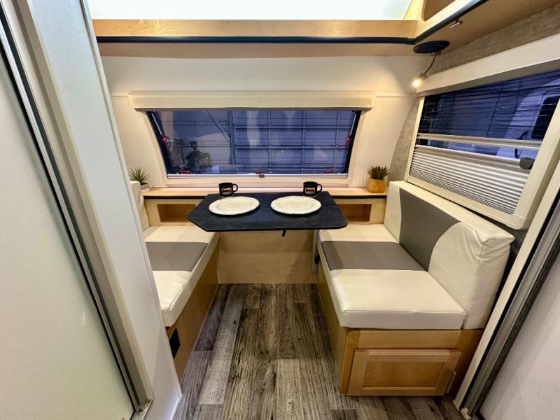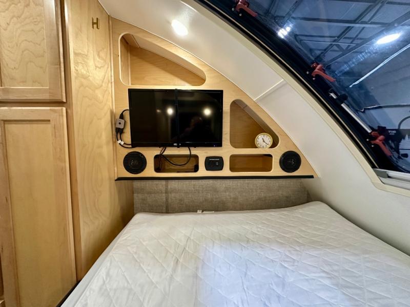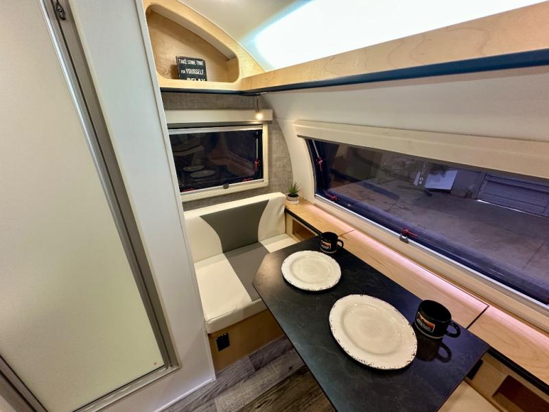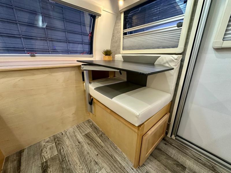 This Little Guy teardrop trailer has an impressive 6' 7" interior height, so even though your trailer is little, you don't have to be little to enjoy it. The large pass-through storage compartment gives you more space to bring along extra gear, and the 2" rear receiver can hold bike racks or storage racks. The exterior entertainment center comes with a TV mount, two 5" outdoor speakers, and HDMI, Coax, and power outlets. The kitchen has a microwave and two-burner stove, so you'll never go hungry, and the dinette can turn into a bed for one other person. If you add the optional Rough Rider Package, you can get 15" off-road tires and wheels and a 2.5" axle riser for added clearance.