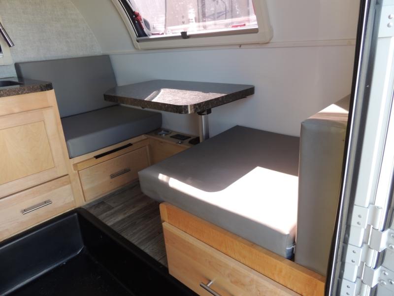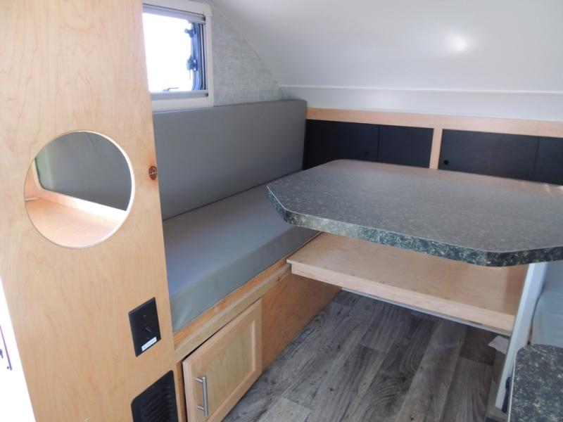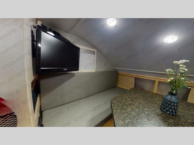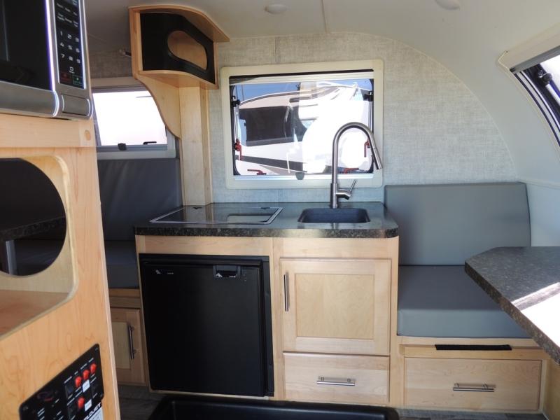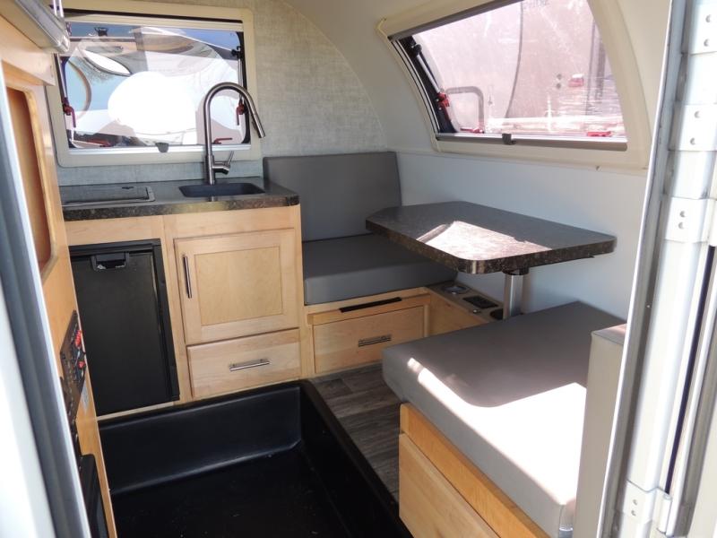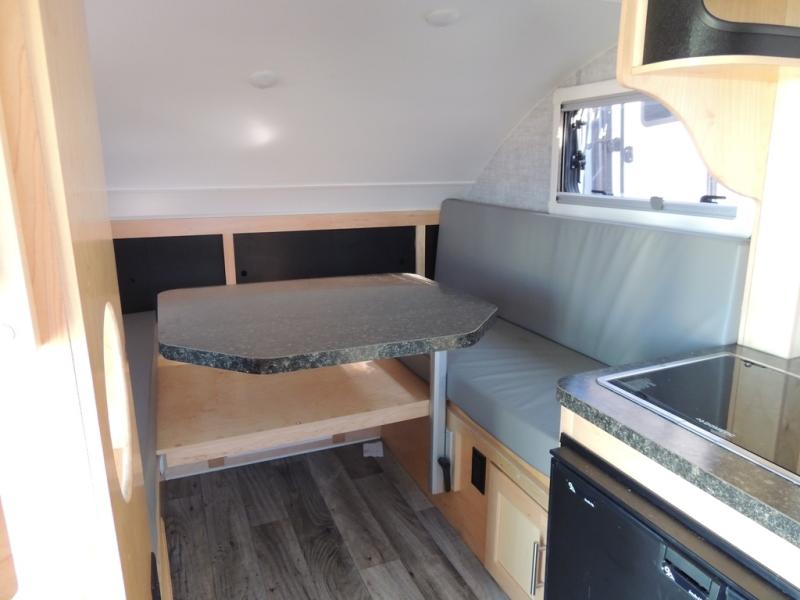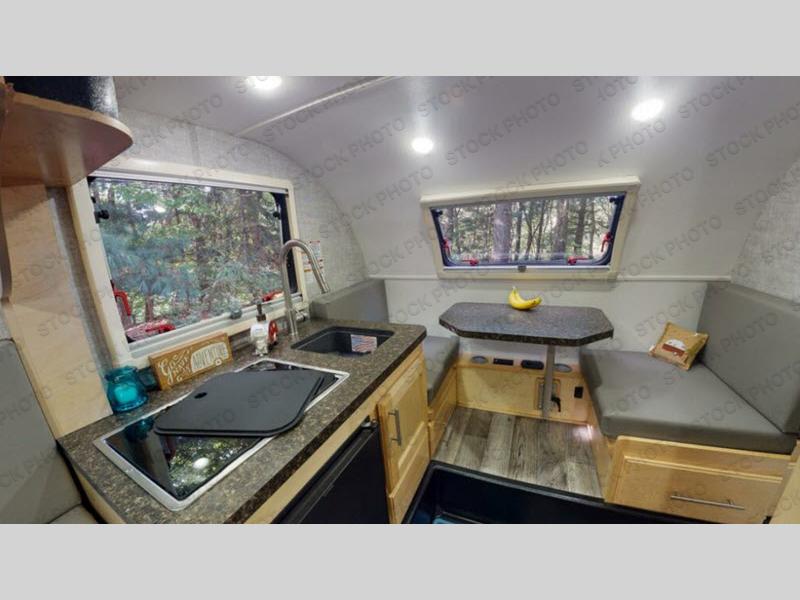 This Little Guy teardrop trailer can store away in your garage without any hesitation! With a dry weight starting at 1,860 lbs., you'll find no problem towing this trailer with your SUV or crossover, and the cozy yet spacious interior offers you 5' 9" of standing room. This trailer can sleep three adults, but it can also seat six adults for a night of fun. The floor-to-ceiling storage cabinet is beneficial for storing any items you want to bring along, and the well-equipped kitchen offers you a Contoure stainless steel microwave, a two-burner glass-top stove, and a 1.9-cubic foot Dometic absorption refrigerator.