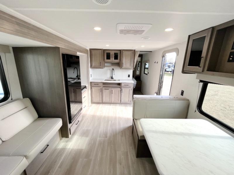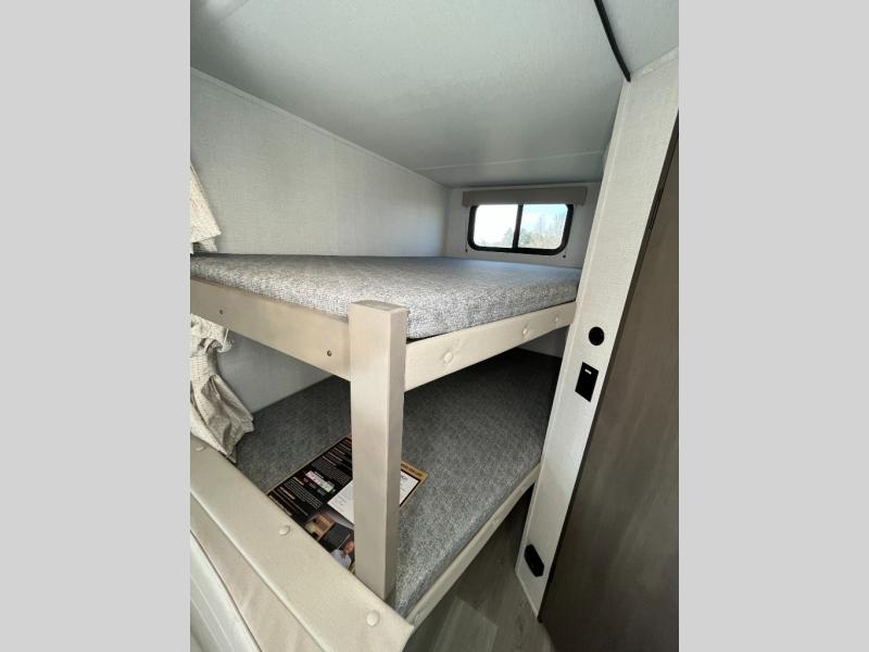 Camping with your larger family or when you want to take along a few extra friends is easy with this trailer. This unit sleeps nine with the double-size bunks in the rear corner, the 60" roll over sofa, and the queen bed in the front semi-private bedroom. The booth dinette can also be used to sleep a guest or two little ones at night once converted. Prepare your meals on the three-burner cooktop indoors, or out on the two-burner cooktop at the outside kitchen! You'll also find a handy exterior spray port, a drawer to store utensils, and an outdoor refrigerator for easy access drinks from outside! It will be so easy to fill the dog's food bowl with the added pet dish under the refrigerator, and the full bath in this model means you don't have to use the camp's facilities. Having a 17' awning outside along with a large unobstructed pass-through compartment allows you extended living outdoors and plenty of space for all of your gear!