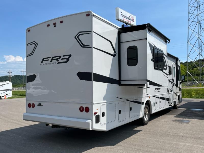 With each FR3 Class A gas motorhome by Forest River, you will find an easy-to-drive coach with a spacious interior allowing you to gather with friends and family with convenience and style found throughout! Each is built with vacuum-bonded construction, a one-piece fiberglass roof with extended rain spouts, a steel firewall and A-pillar extension, Bi-LED headlamps and lower LED fog lights, and grey Rotocast storage boxes with drains. Inside, you will enjoy black hardware, appliances, plumbing fixtures, and a glass shower door frame. You will also find a stainless steel kitchen sink with a bamboo cutting board and roll-up dryer, heavy-duty full-extension ball bearing drawer guides, dual-access dinette storage with doors, and nightstands with charging stations to keep your cellphones ready for whatever is next. Make your selection today!