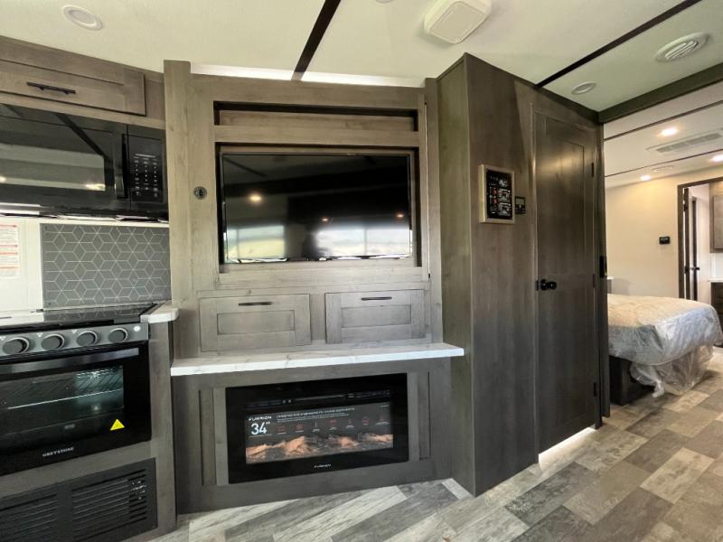 Spacious and inviting for couples or families, this FR3 Class A gas motorhome offers convenience throughout including a half bath for the kids and guests and a full rear bathroom for the owners. This full bathroom is located within the rear master suite where you will also find a king-size bed for relaxing. Once at your destination, you can quickly set up the power awning to relax outside while watching the exterior TV and visiting with other RVers. You might have decided to add the washer and dryer option in the bedroom, so a load of laundry might even get done. Once you are ready to fill your tummy, the full kitchen offers everything you need plus a residential microwave. You might even decide to relax on one of the theater seats after dinner as you watch the big game on the 40" LED 12V TV with a fireplace below.