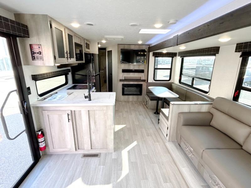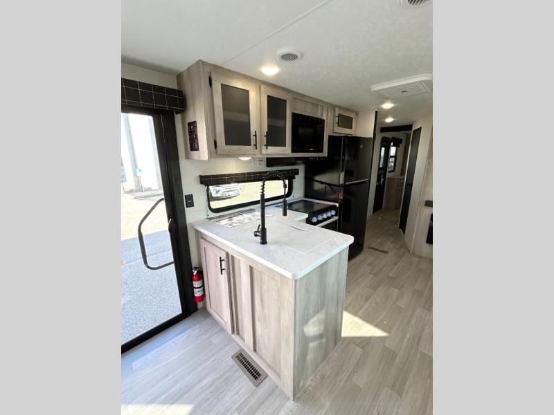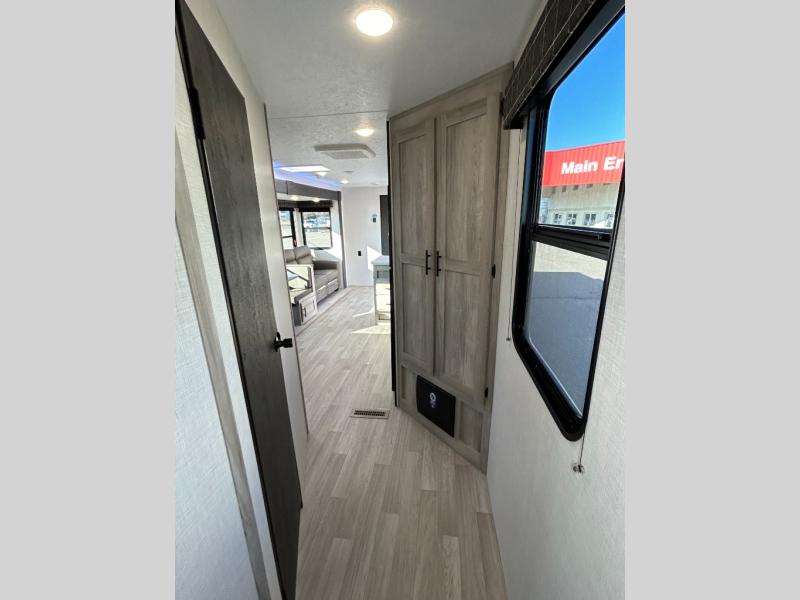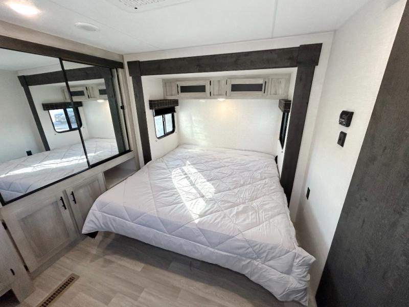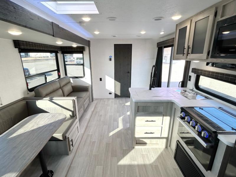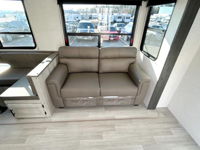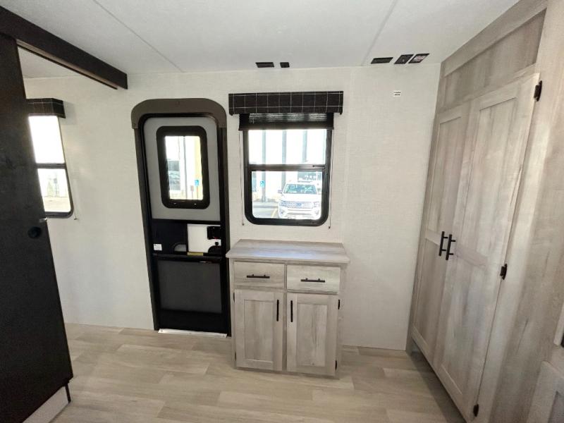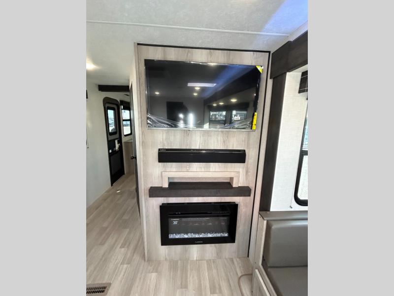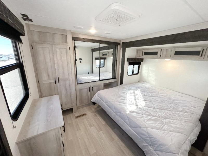 Pack your bags and park this destination trailer at your favorite spot! The kiddos or guests can sleep in the front private bunkhouse with the set of 34" x 72" bunk beds and the bunk above the 28" dinette, plus there is a closet to store their clothes and a TV for their entertainment. You will enjoy your own privacy with the rear private bedroom which has a king bed slide, a dresser with a TV, and a wardrobe with washer and dryer prep. And one of the dual entry doors even leads directly into the private bedroom. The main living area includes a second slide out with the U-shaped dinette and hide-a-bed sofa, or you can choose the optional theater seating. Everyone can freshen up in the full bathroom with the radius shower and keep their bellies full with a three burner cooktop.