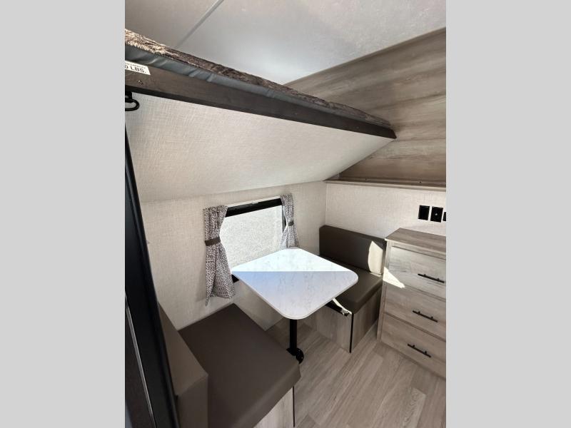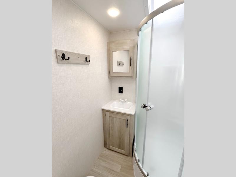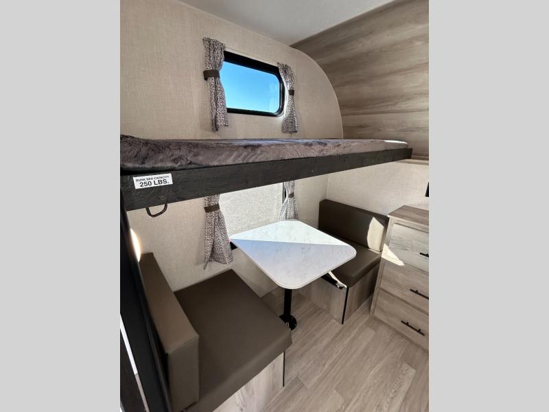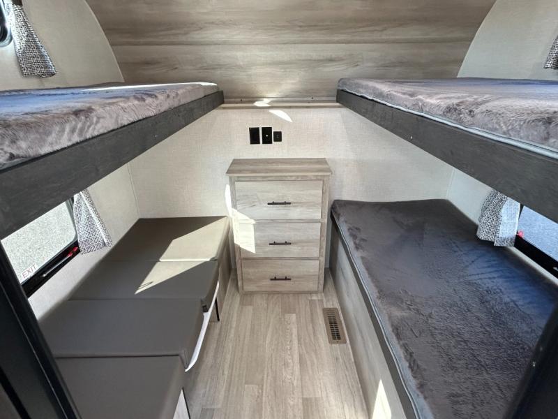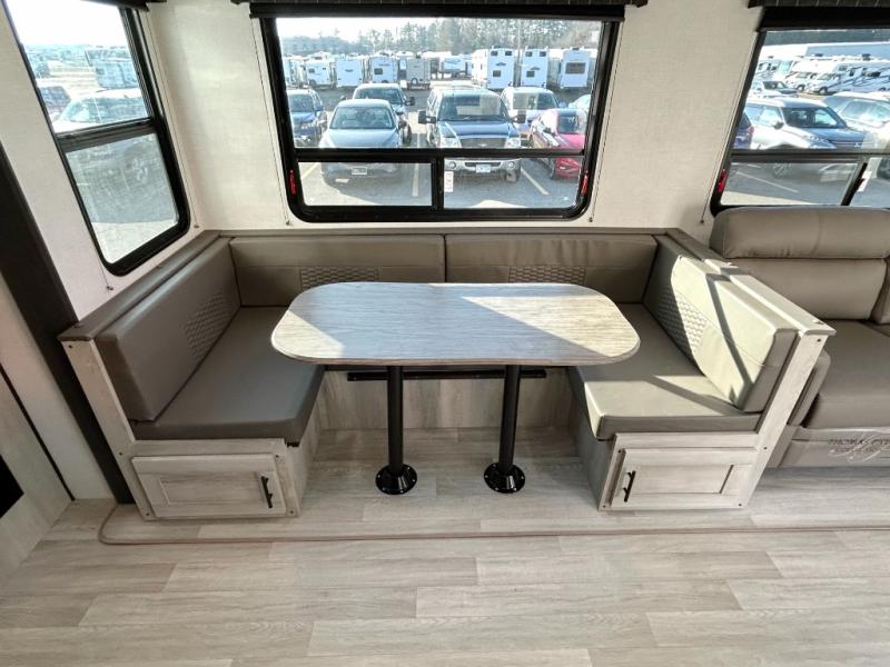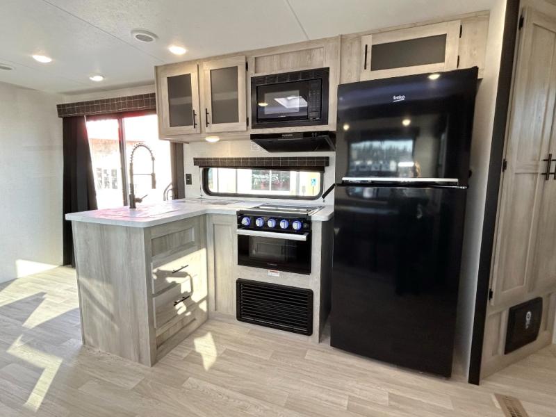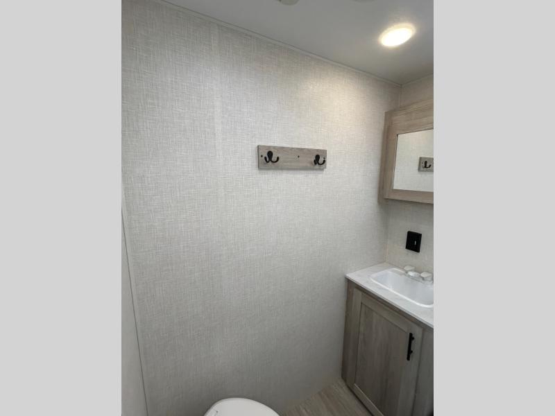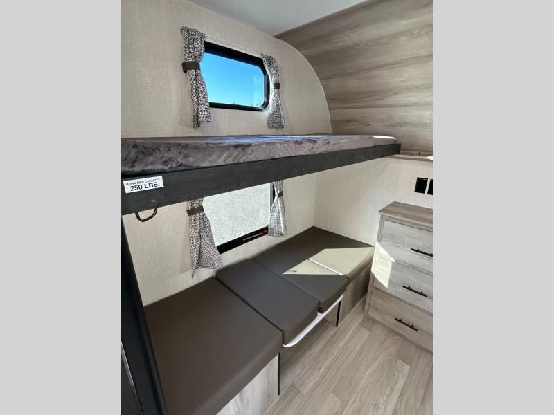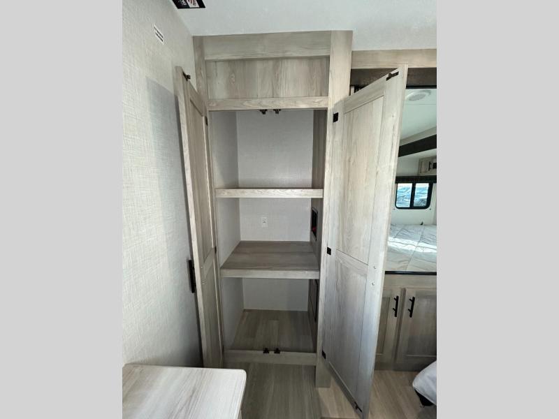 Pack your bags and park this destination trailer at your favorite spot! The kiddos or guests can sleep in the front private bunkhouse with the set of 34" x 72" bunk beds and the bunk above the 28" dinette, plus there is a closet to store their clothes and a TV for their entertainment. You will enjoy your own privacy with the rear private bedroom which has a king bed slide, a dresser with a TV, and a wardrobe with washer and dryer prep. And one of the dual entry doors even leads directly into the private bedroom. The main living area includes a second slide out with the U-shaped dinette and hide-a-bed sofa, or you can choose the optional theater seating. Everyone can freshen up in the full bathroom with the radius shower and keep their bellies full with a three burner cooktop.