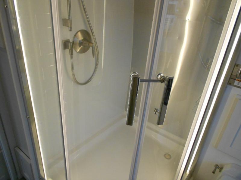 This travel trailer with power twin beds allow you to camp with your spouse or friend, so pack up for adventure! The front bedroom also includes a shared nightstand for your valuables and two closets to hang clothes. In the main living area you can relax on the reclining sofa that sits directly across from the 60" projection TV within the media cabinet. There is also a workstation here with an Ultraleather chair. Head to the full rear bath to get clean up each day, and you'll appreciate the residential-style shower with a heated floor for comfort.